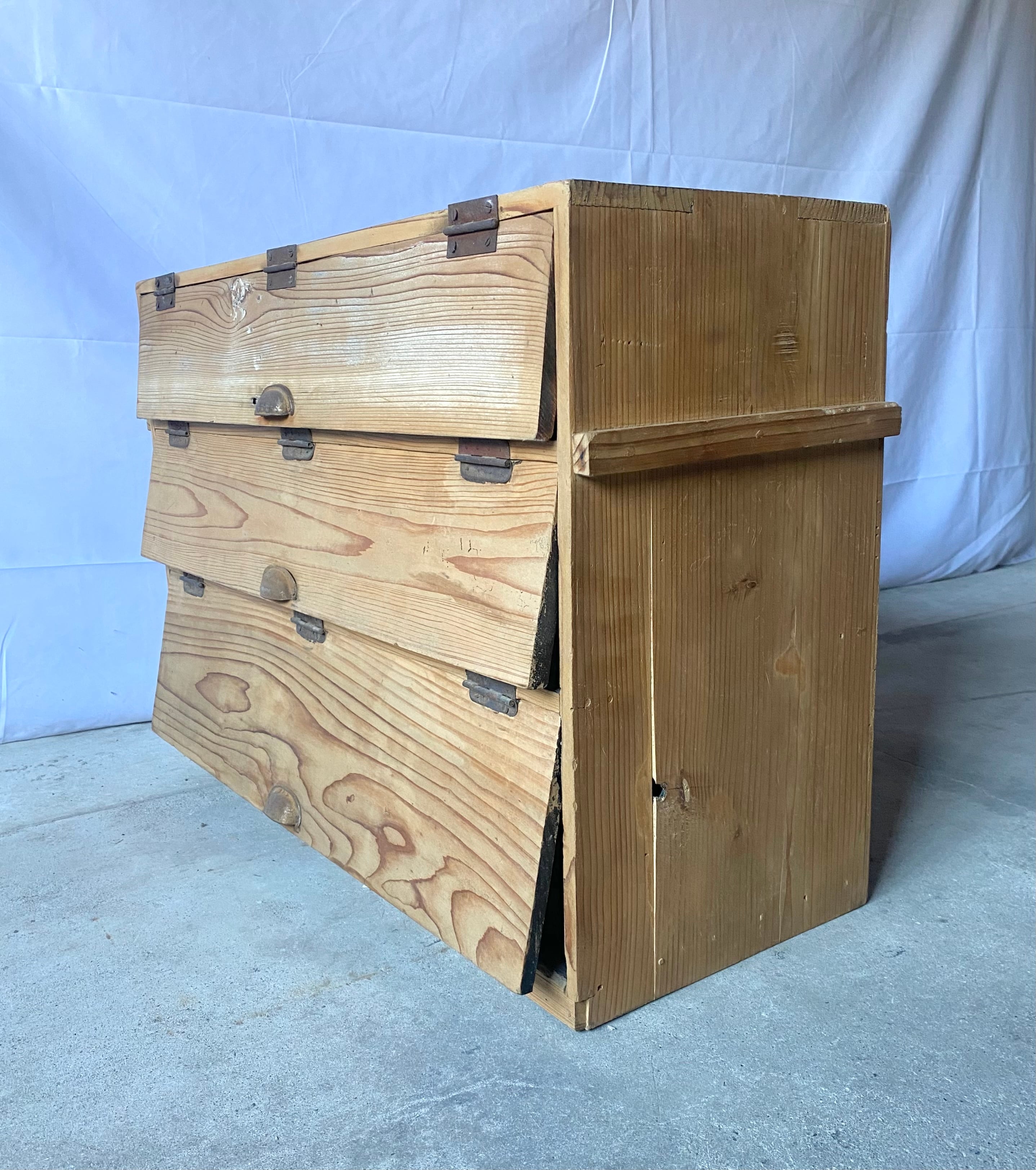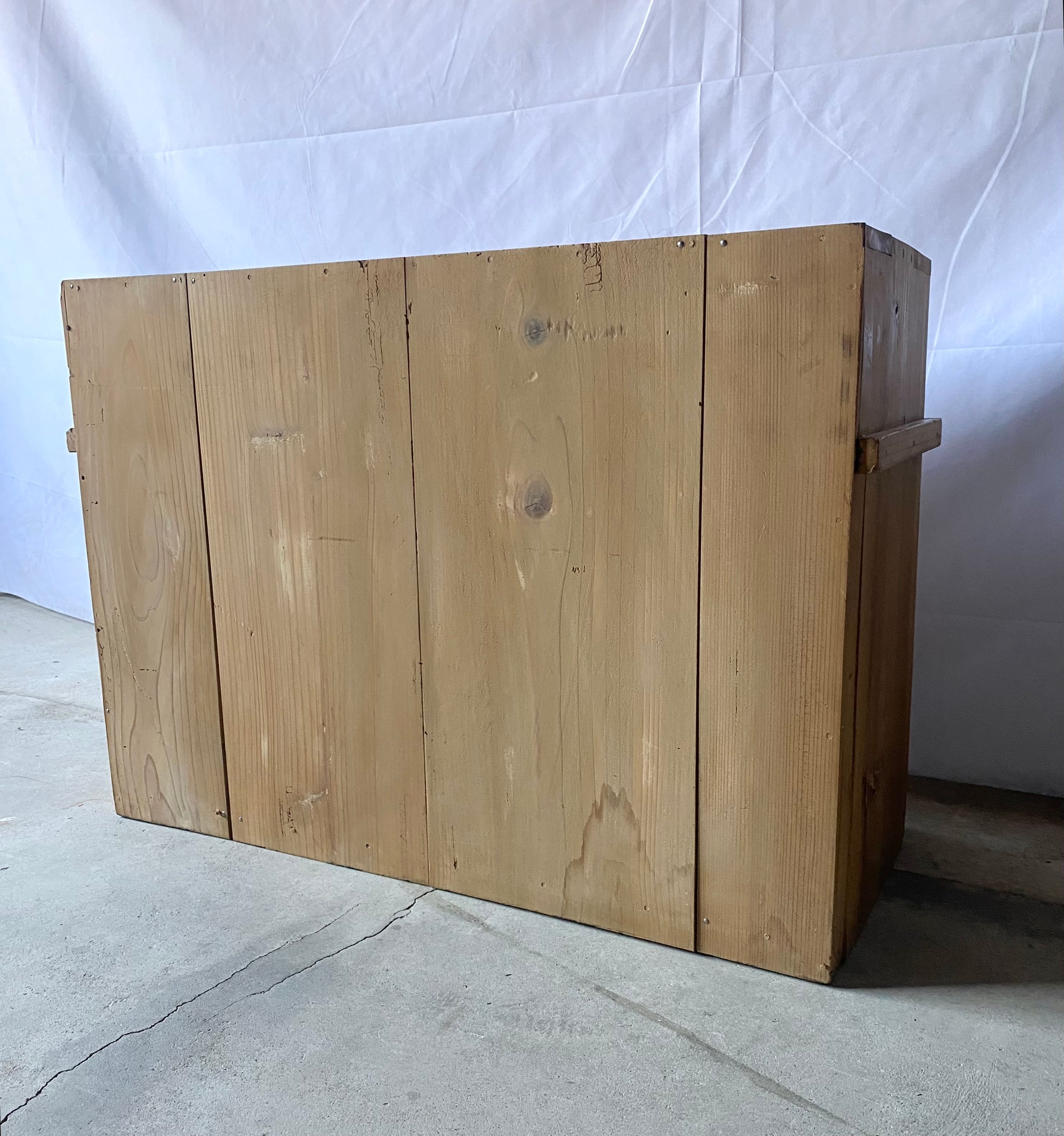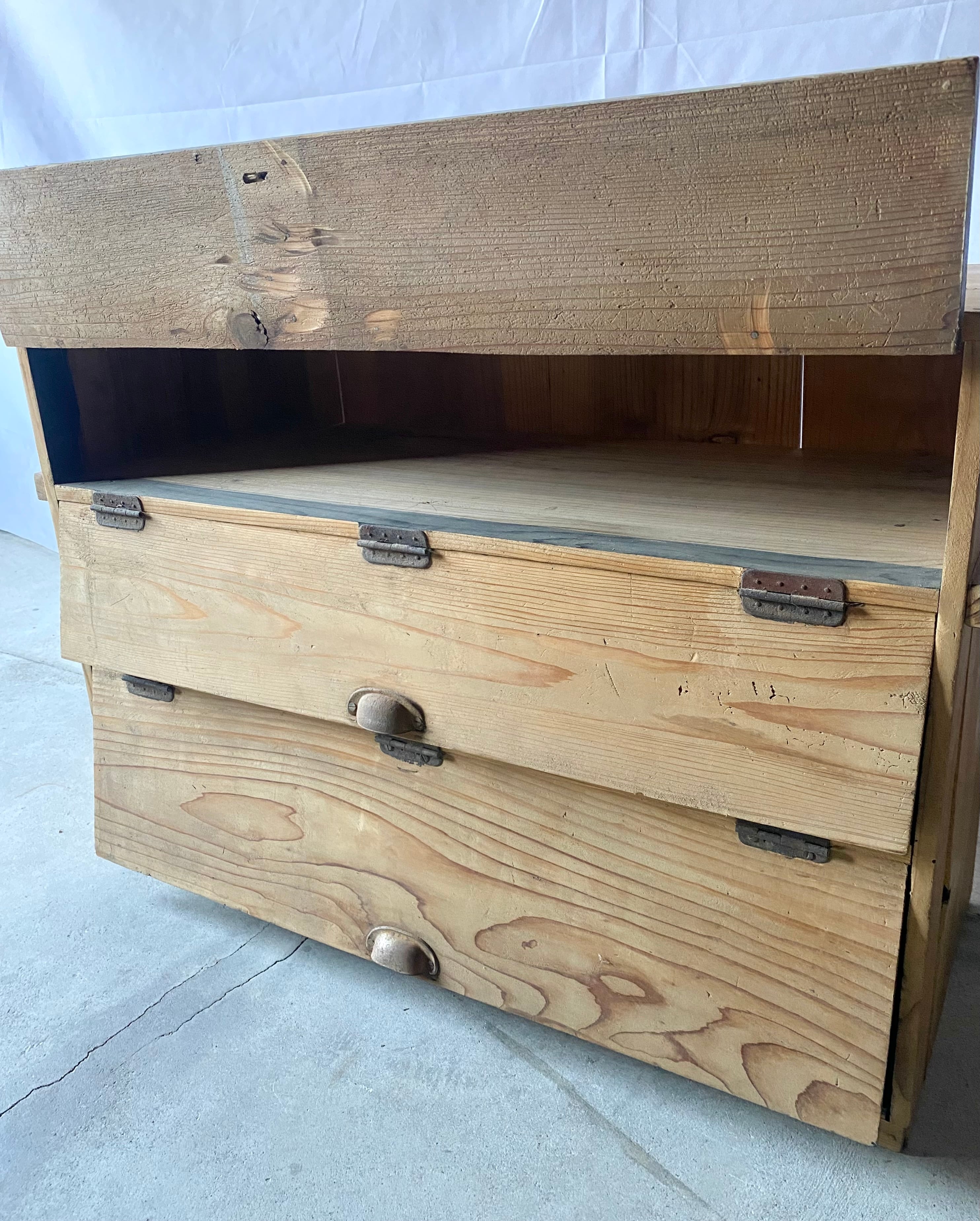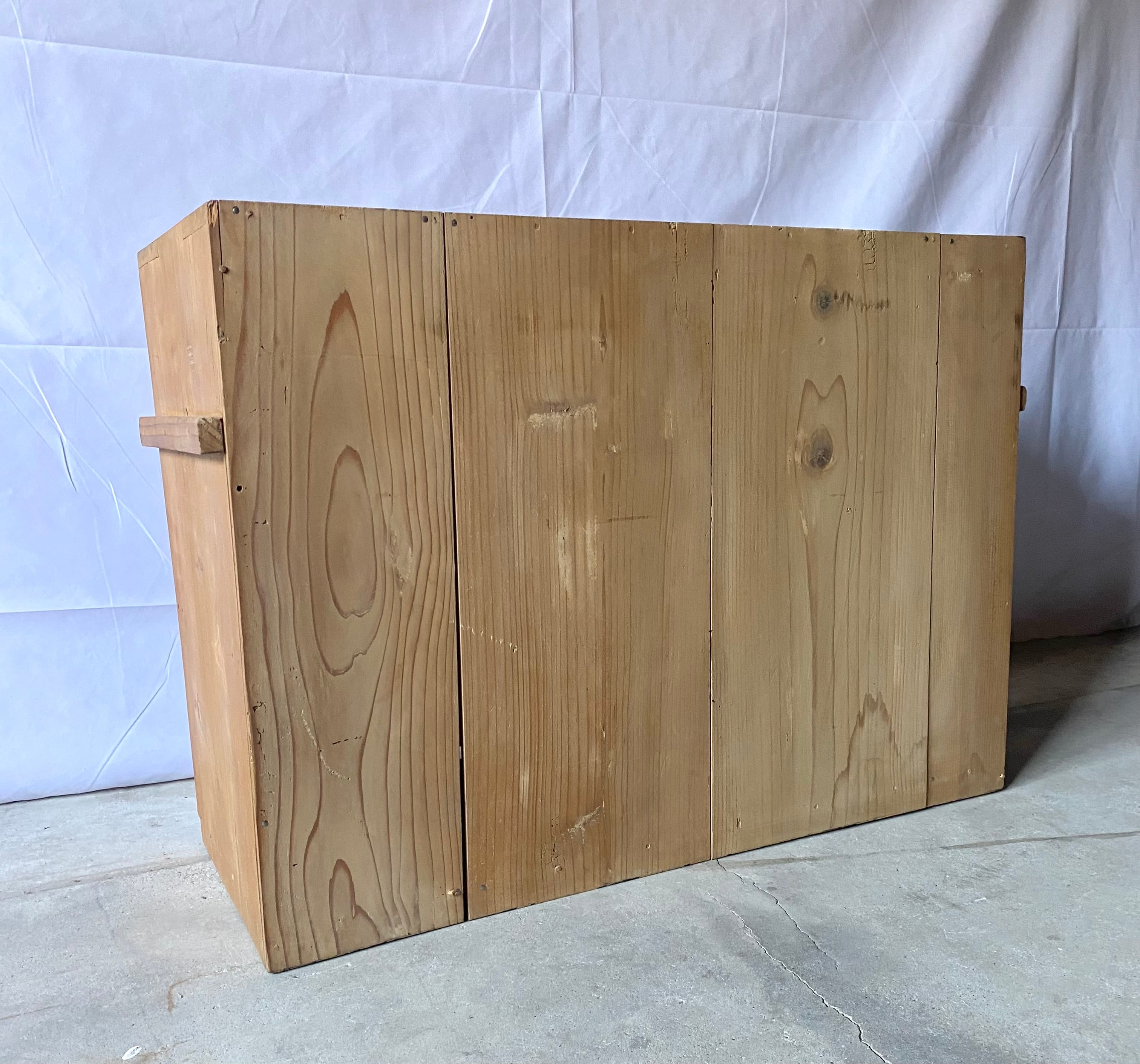 古い収納棚になります。スレや欠け、当たりキズ、反り、サビ、禿げ、落としきれない汚れなどがあります。扉の開閉はスムーズに行えます。全体的に状態も良いのでまだまだ実用的に活躍してくれます。