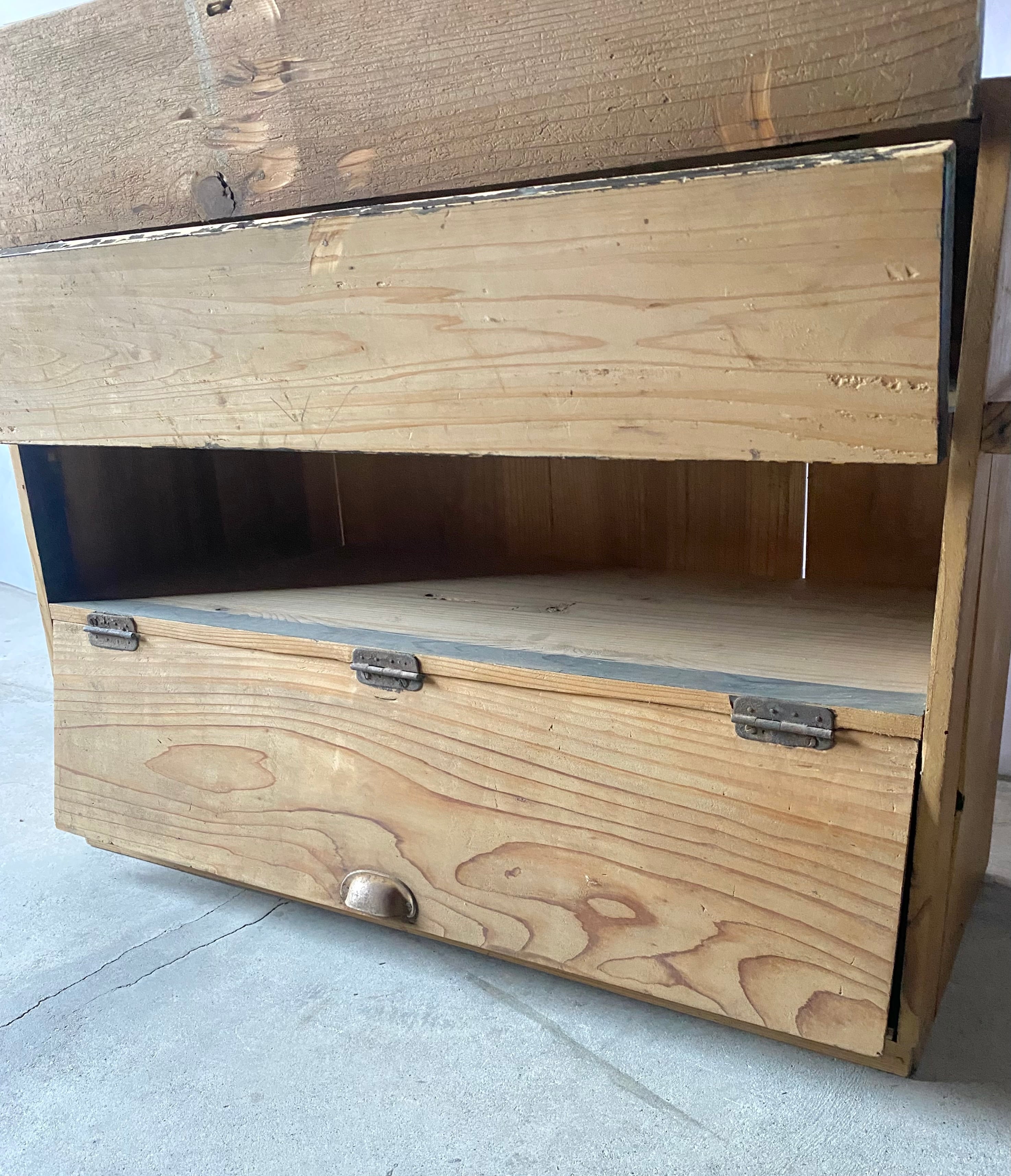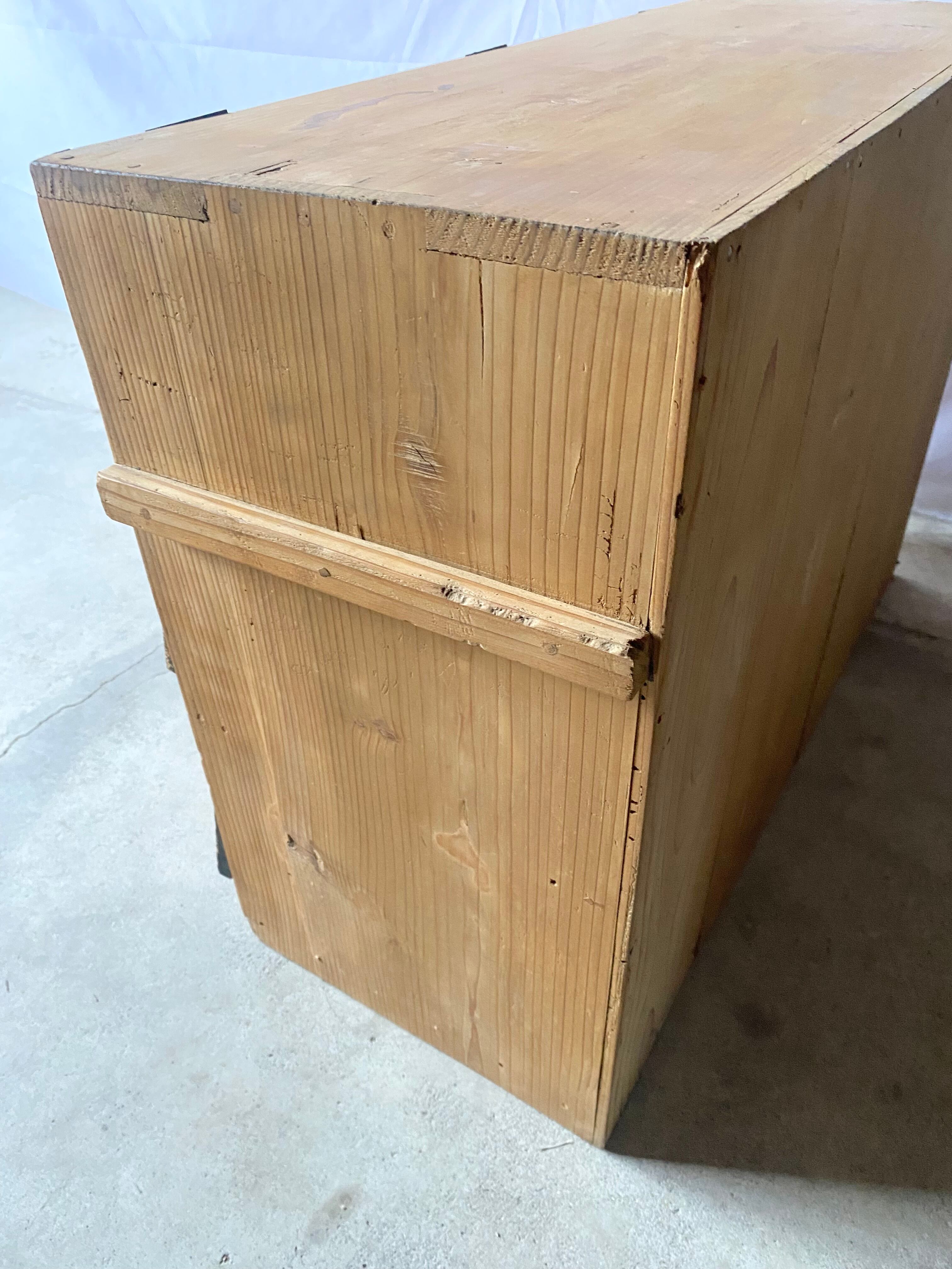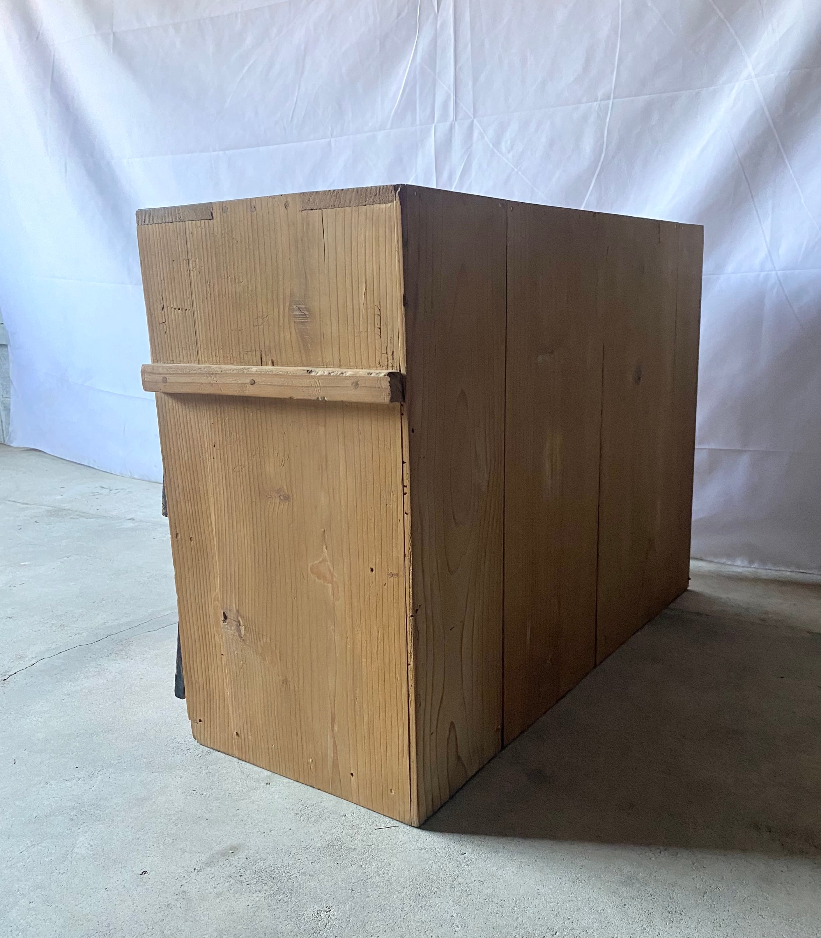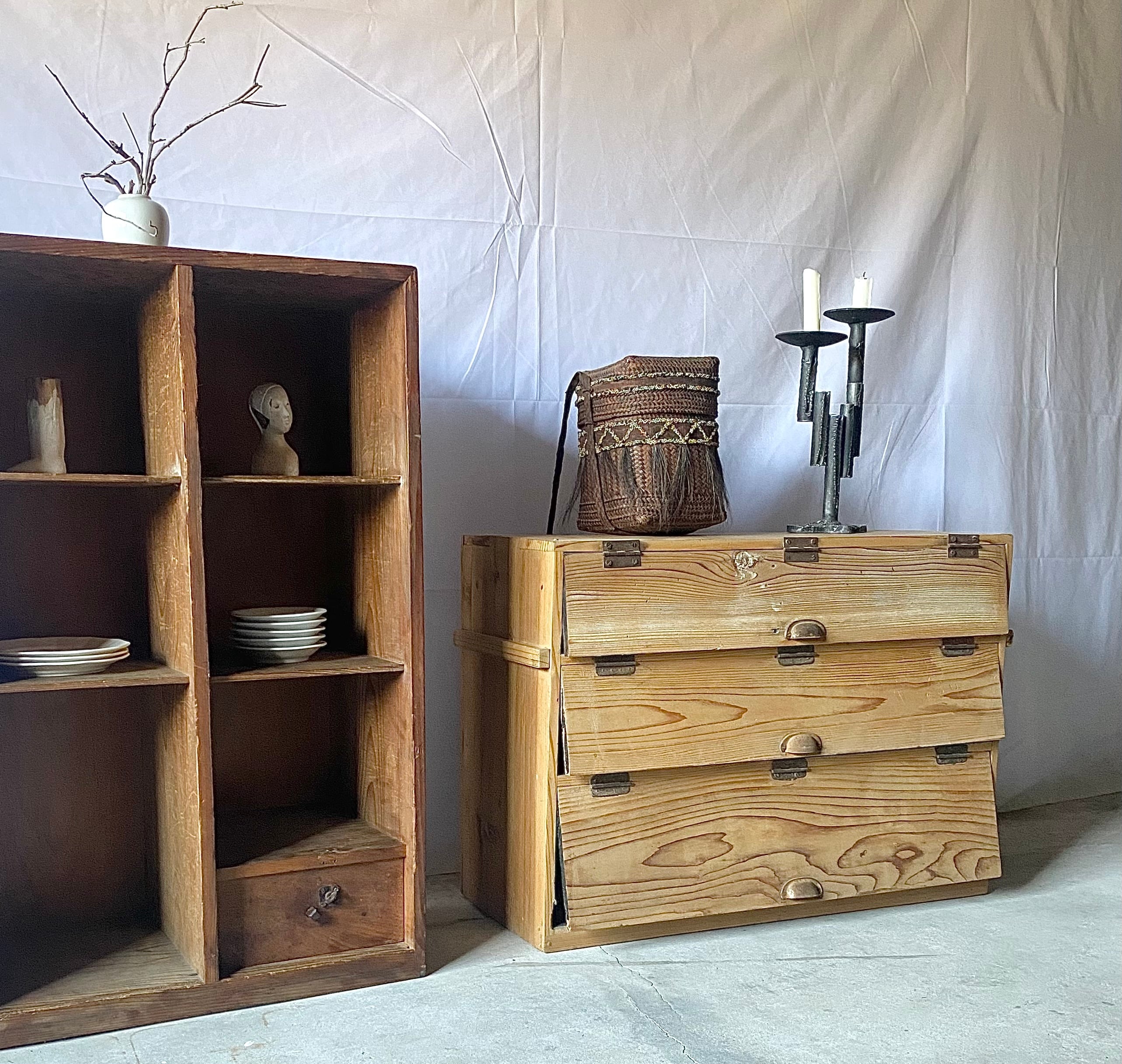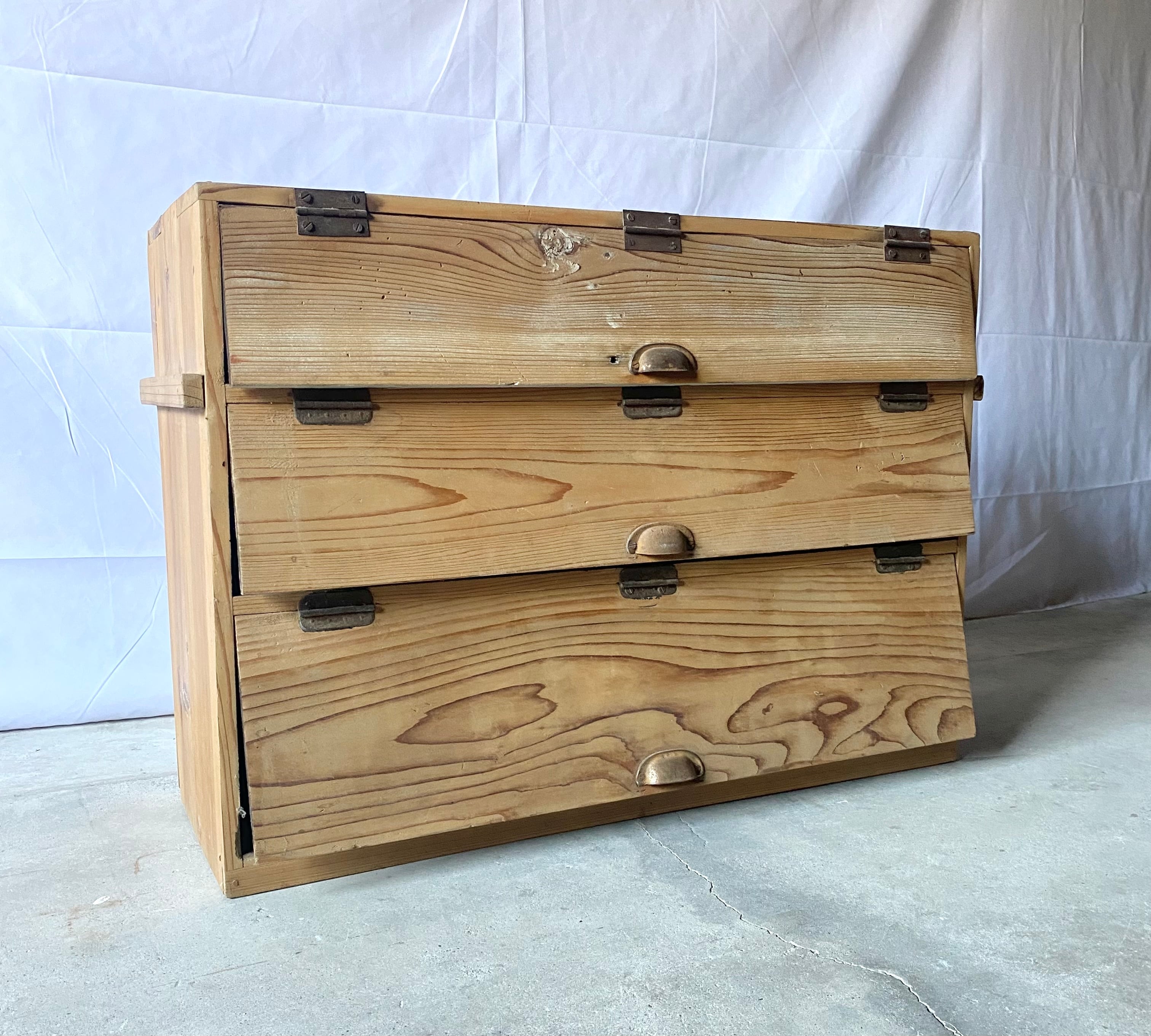 古い収納棚になります。スレや欠け、当たりキズ、反り、サビ、禿げ、落としきれない汚れなどがあります。扉の開閉はスムーズに行えます。全体的に状態も良いのでまだまだ実用的に活躍してくれます。
