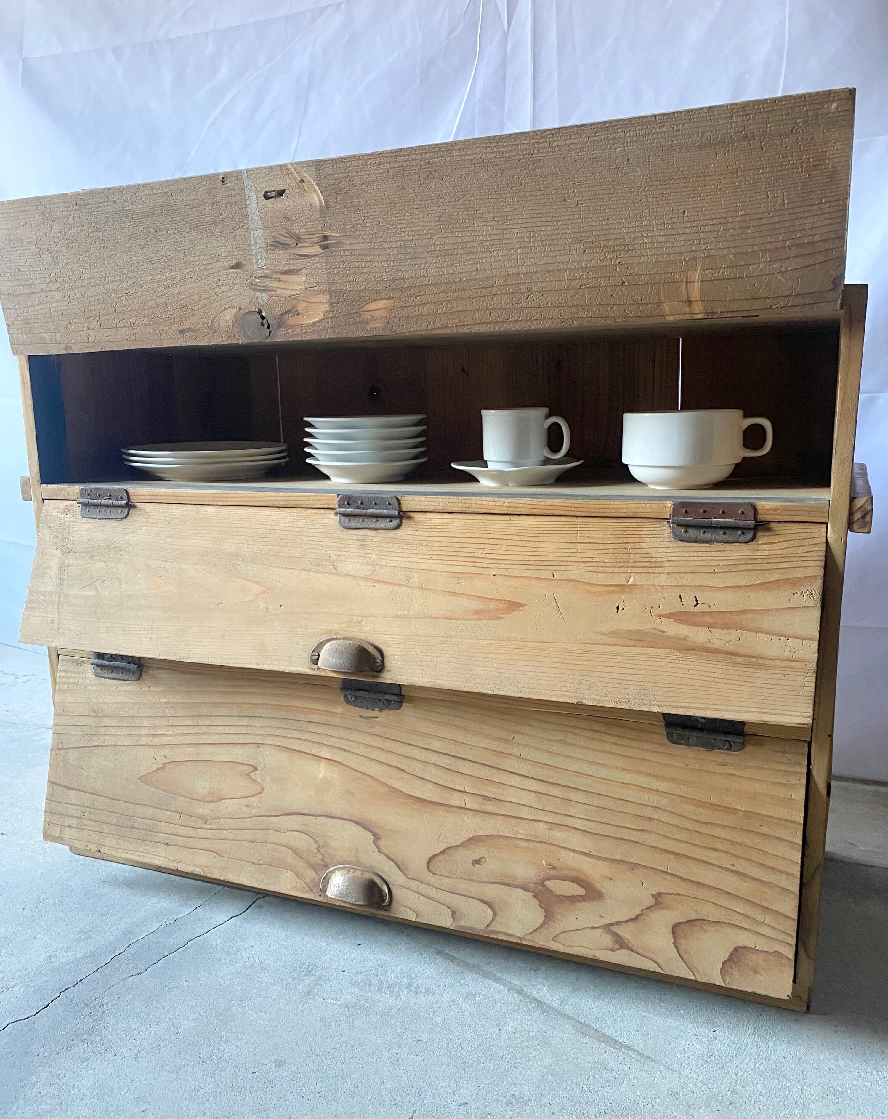 雰囲気あるしらきの風合いと味のある取手、パタパタ扉が可愛い収納棚。キッチンで食器やスパイスのストック棚としてやリビングや趣味部屋で小物や本の収納としても素敵です。