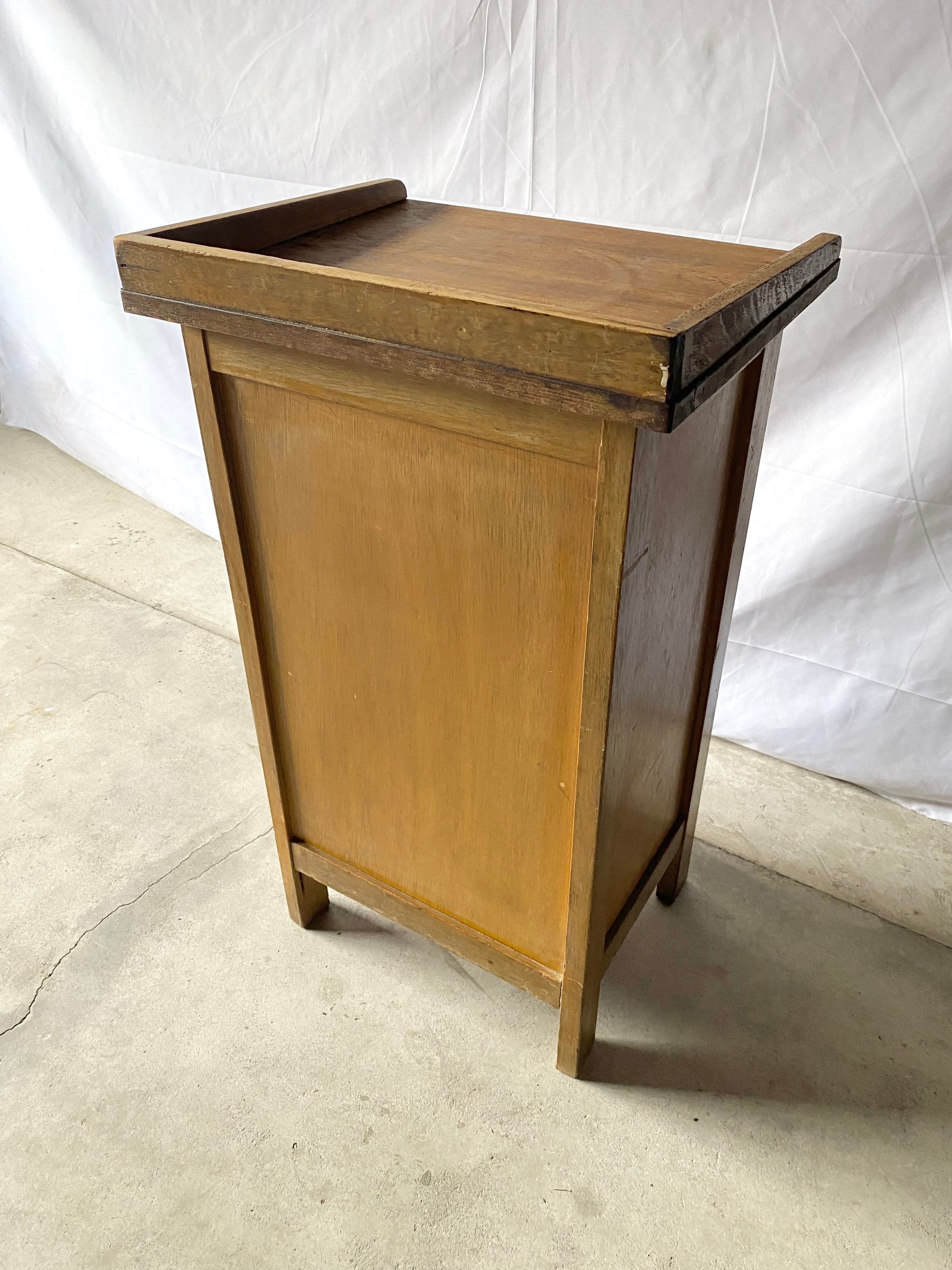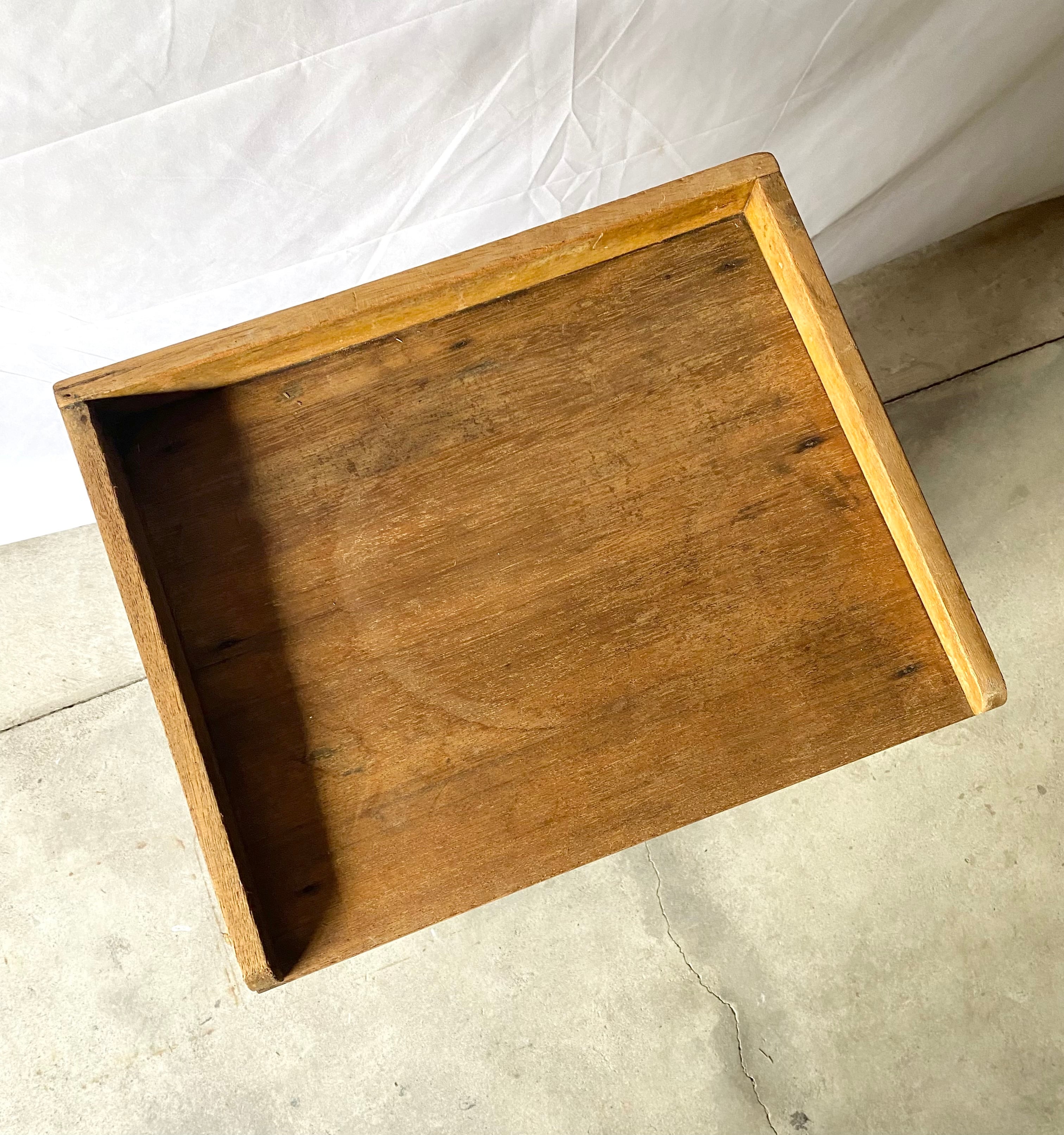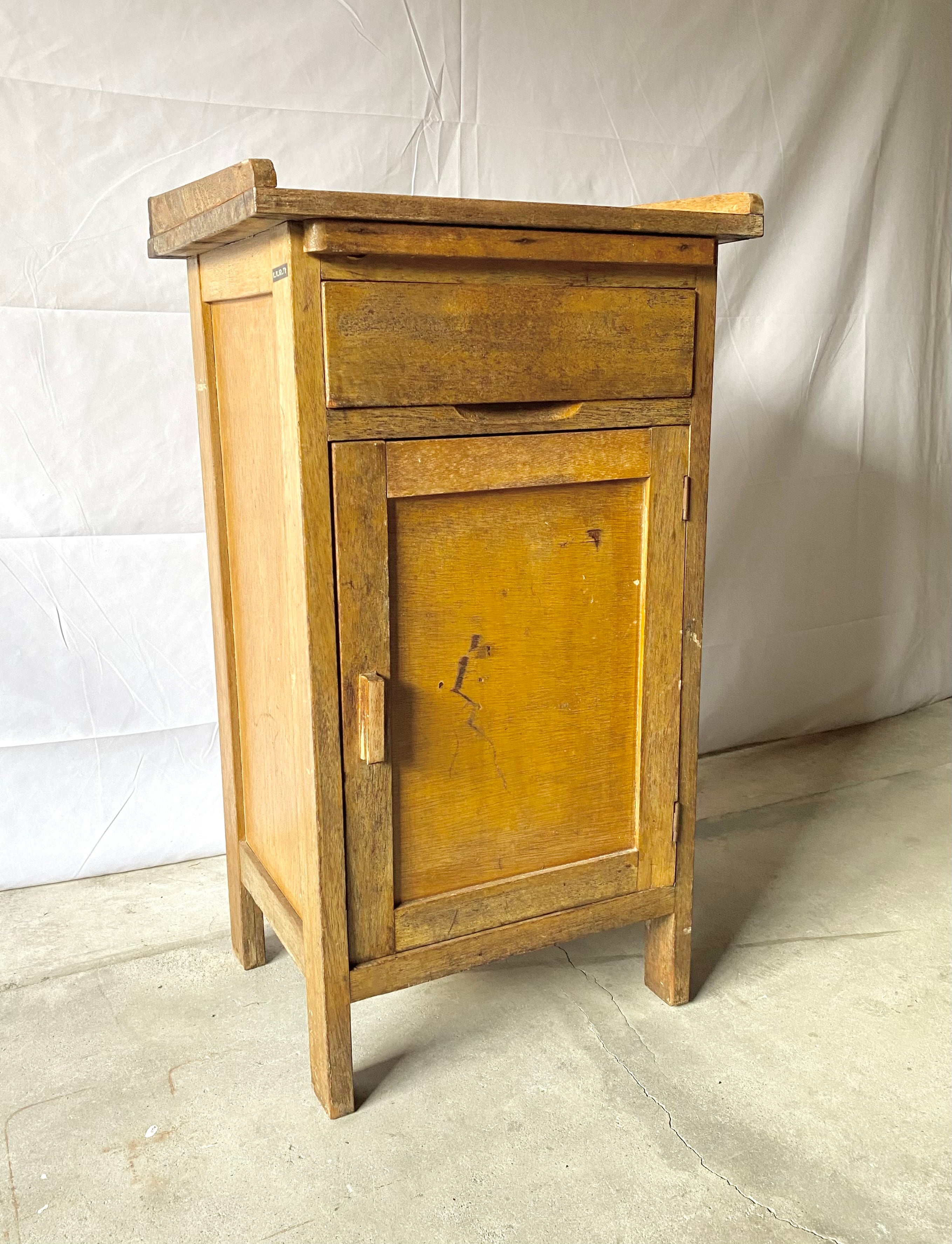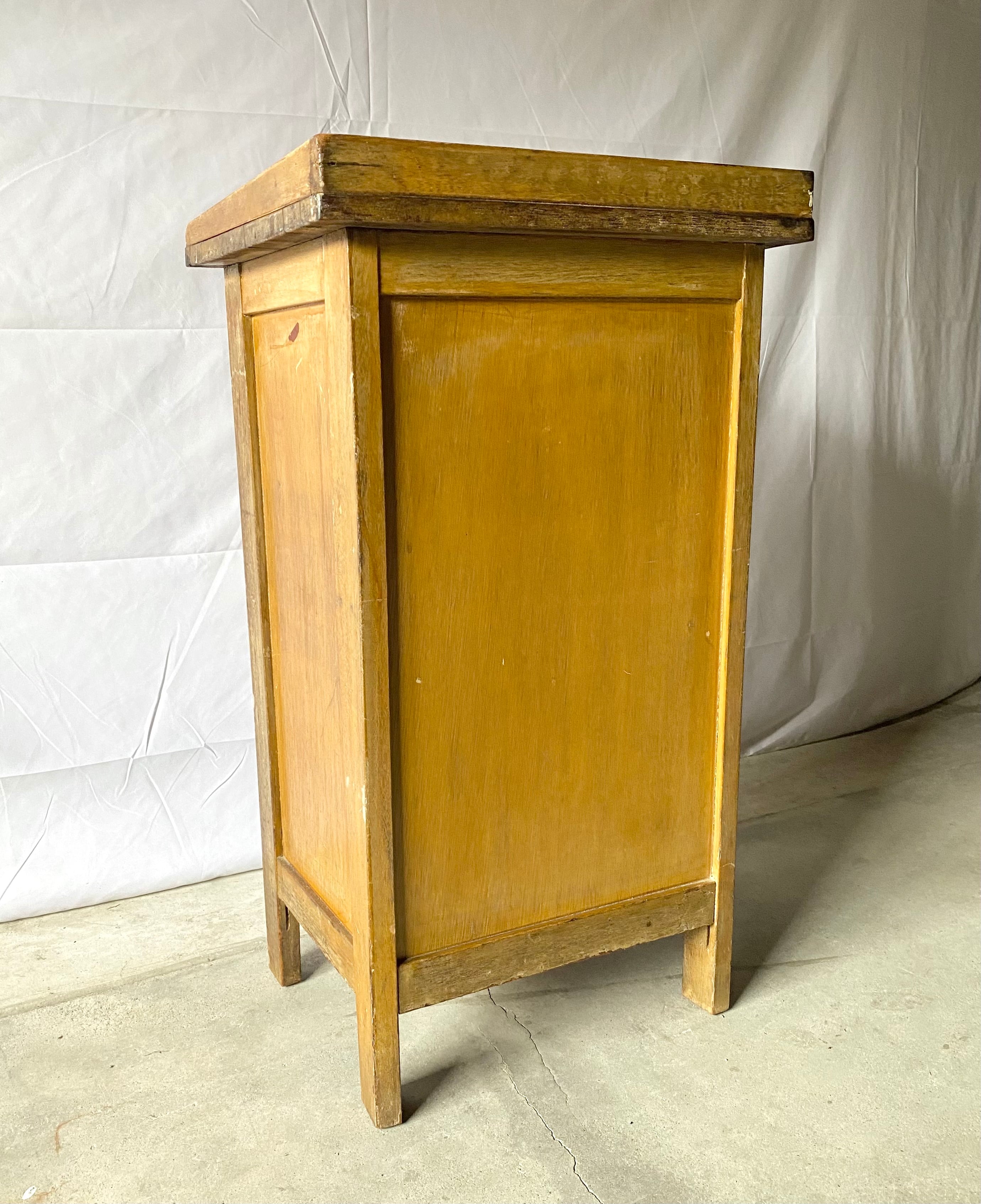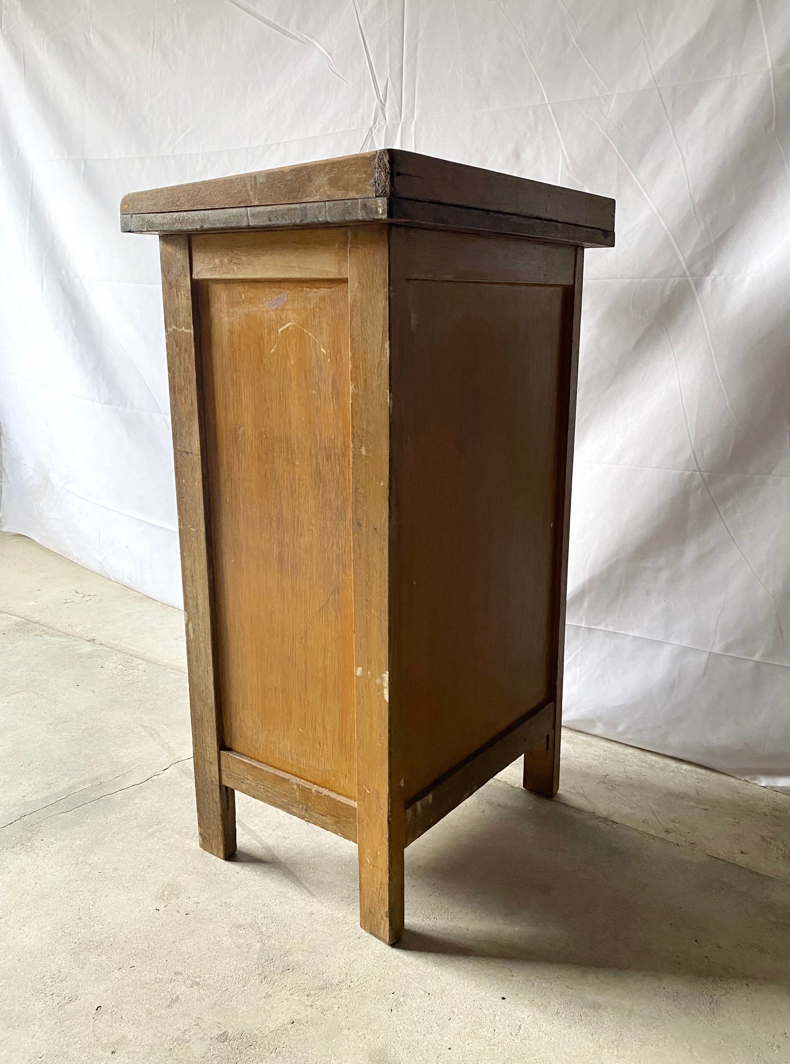 古い袖机になります。スレや剥げ、割れ、反り、サビ、当たりキズ、落としきれない汚れなどがあります。扉戸、引出し、スライド式天板の開閉は比較的スムーズに行なえます。全体的に状態も良いのでまだまだ実用的に活躍してくれます。