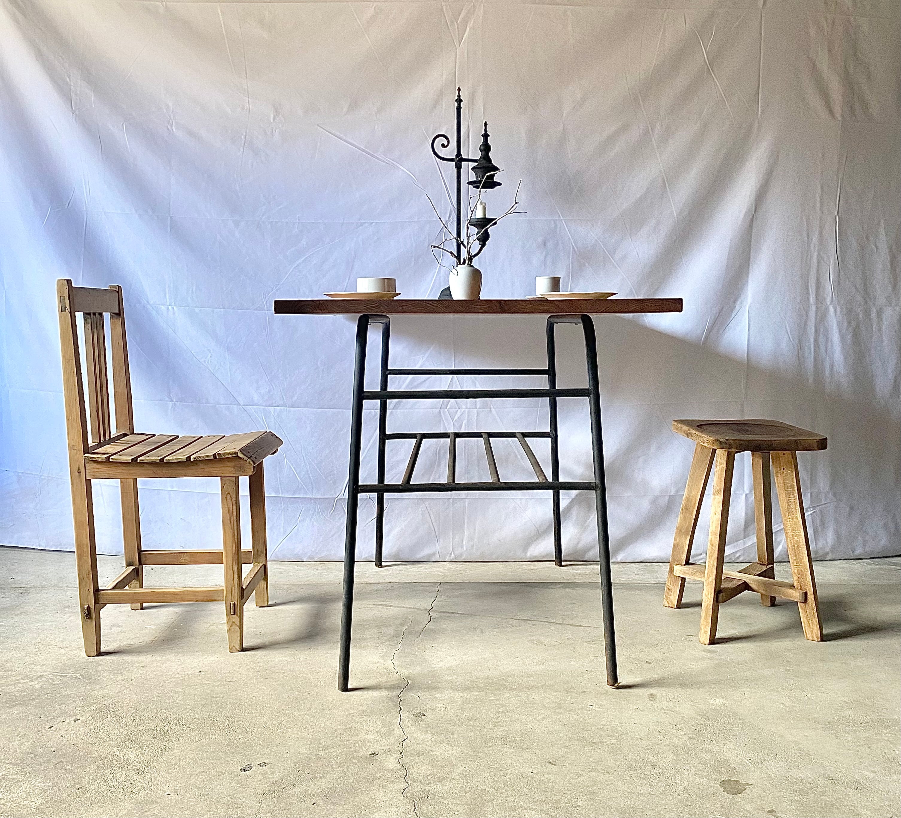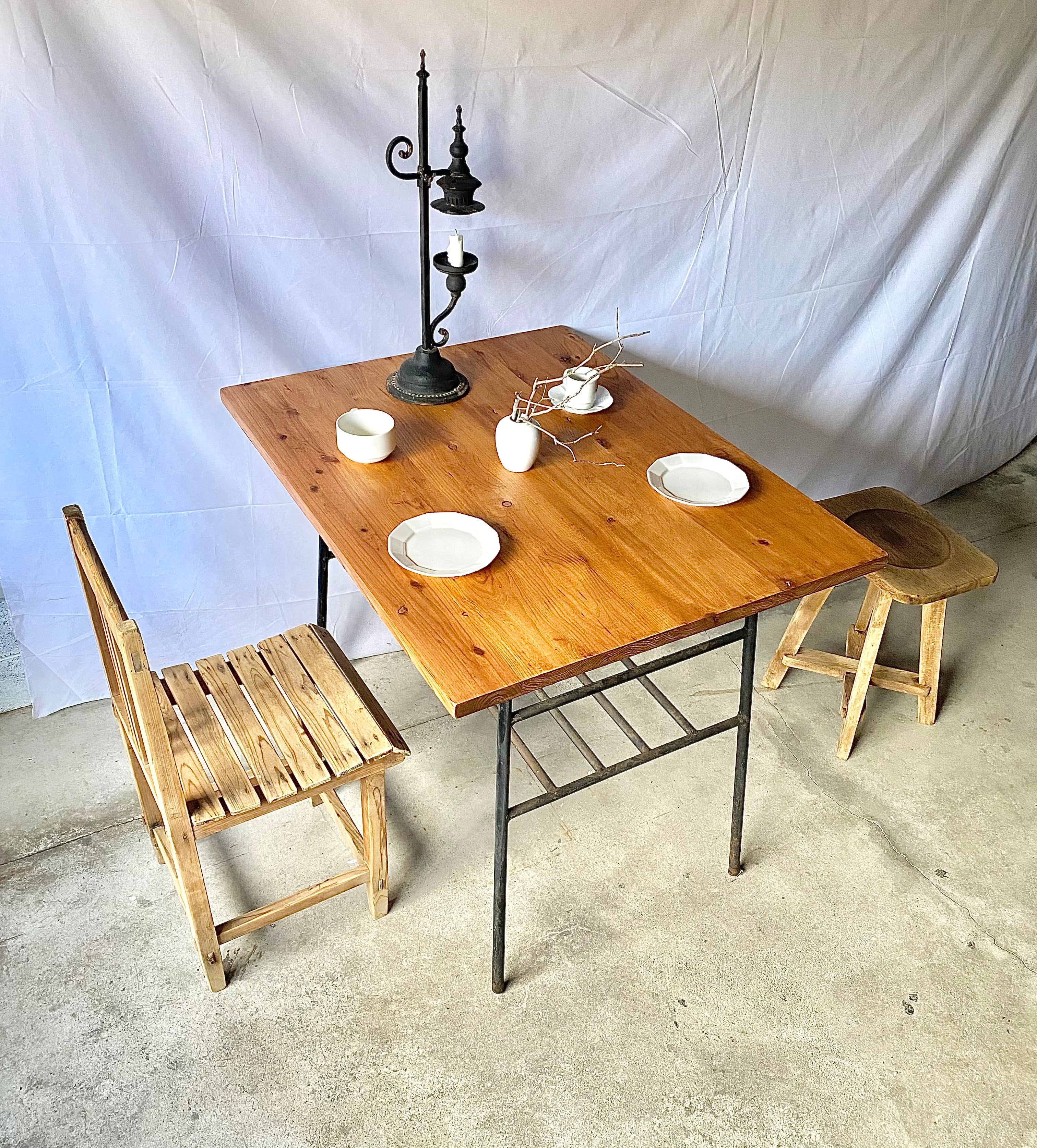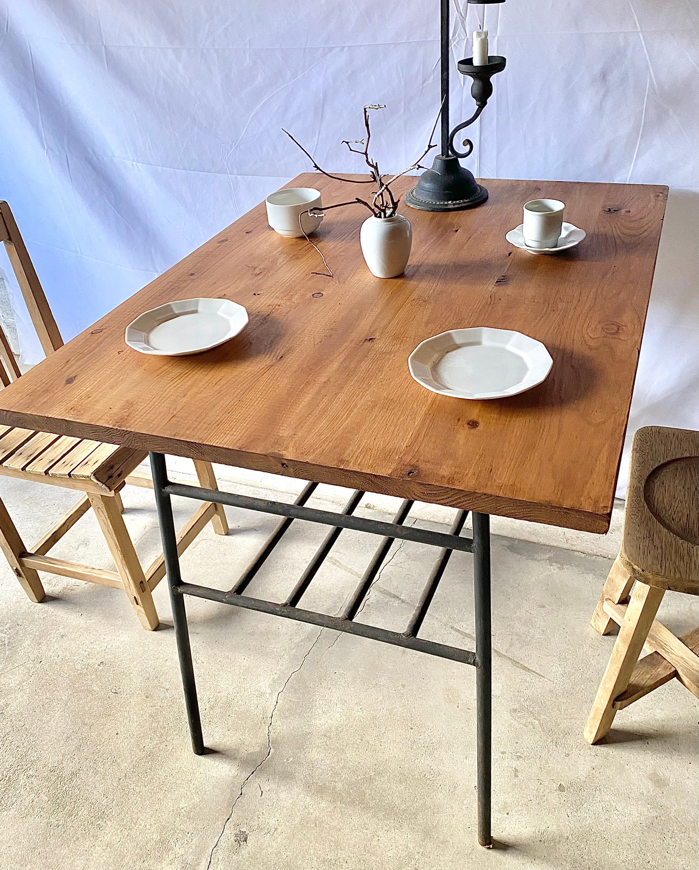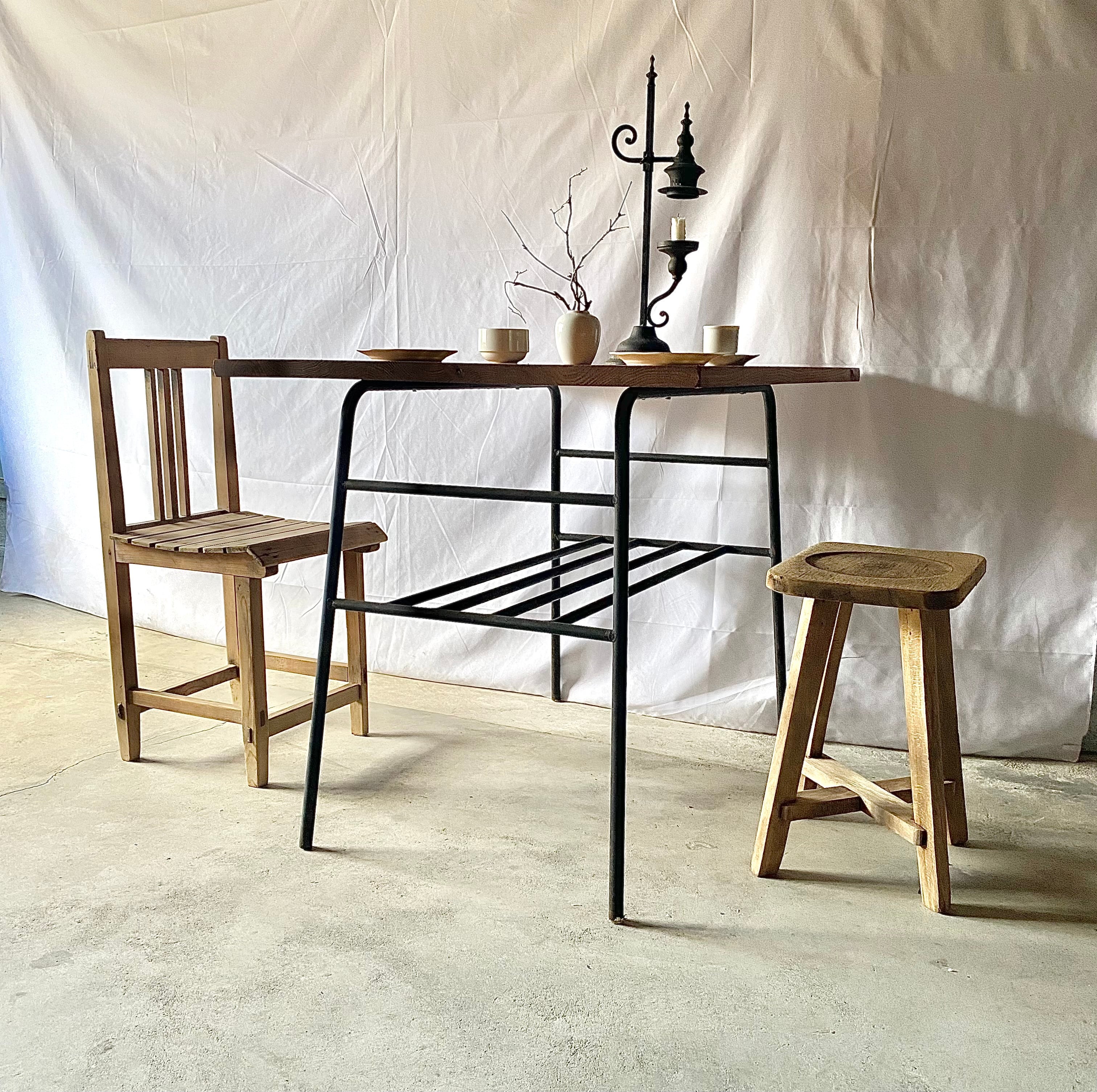古い鉄脚と新材のテーブルになります。スレや剥げ、反り、割れ、サビ、当たりキズ、落としきれない汚れなどがあります。古い鉄脚になりますので少しのがたつきはありますが、全体的に状態も良く、まだまだ実用的に活躍してくれます。