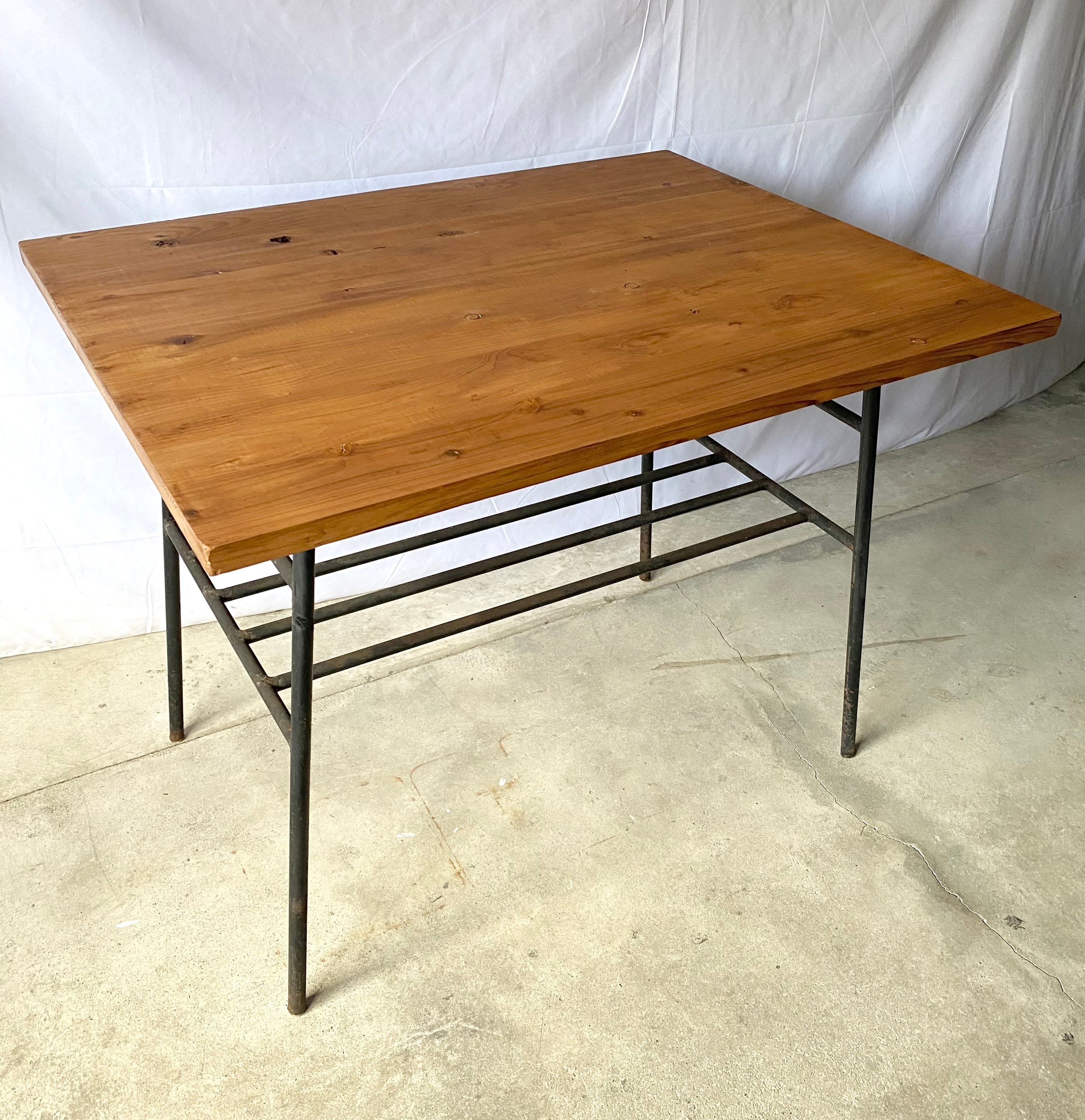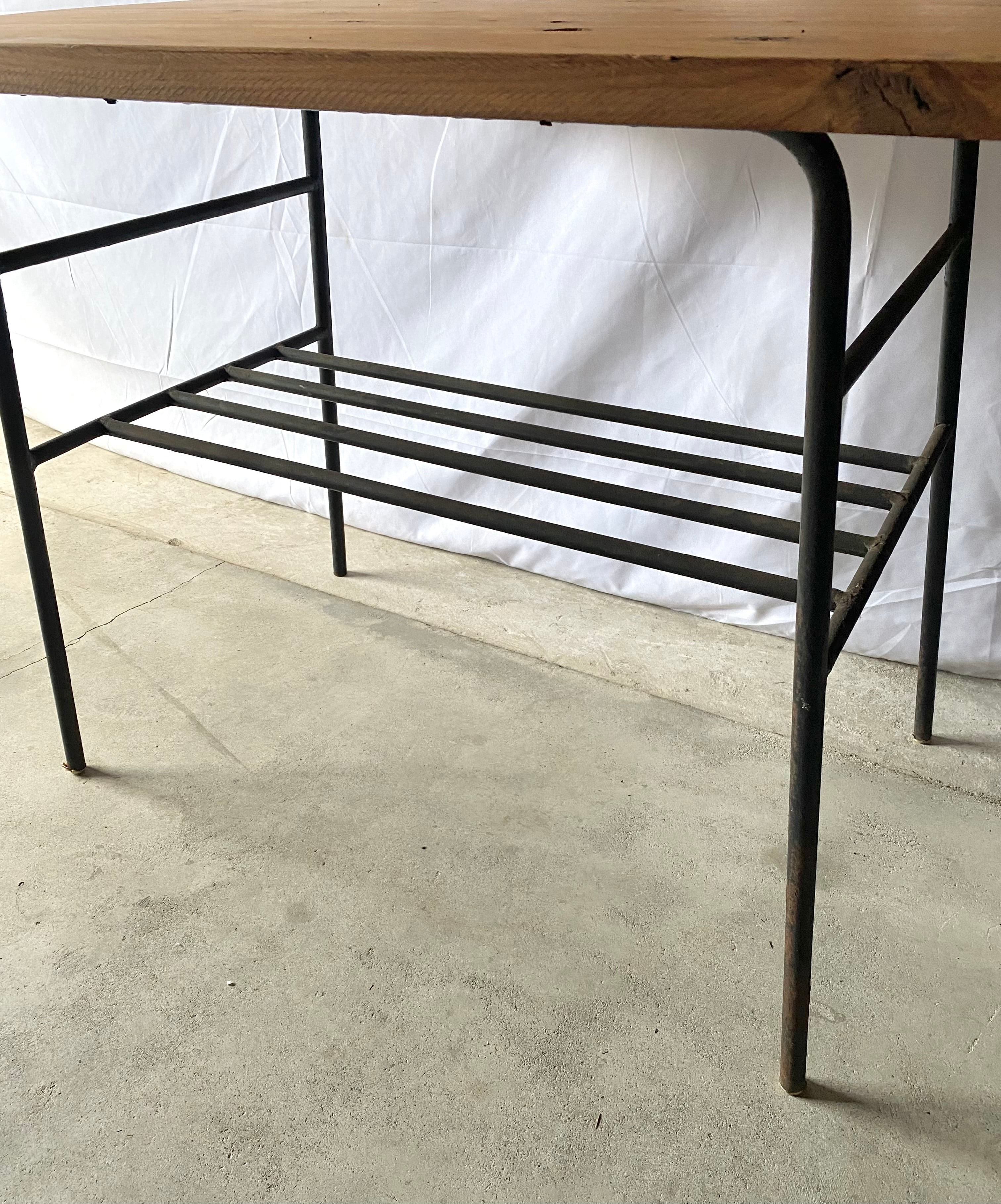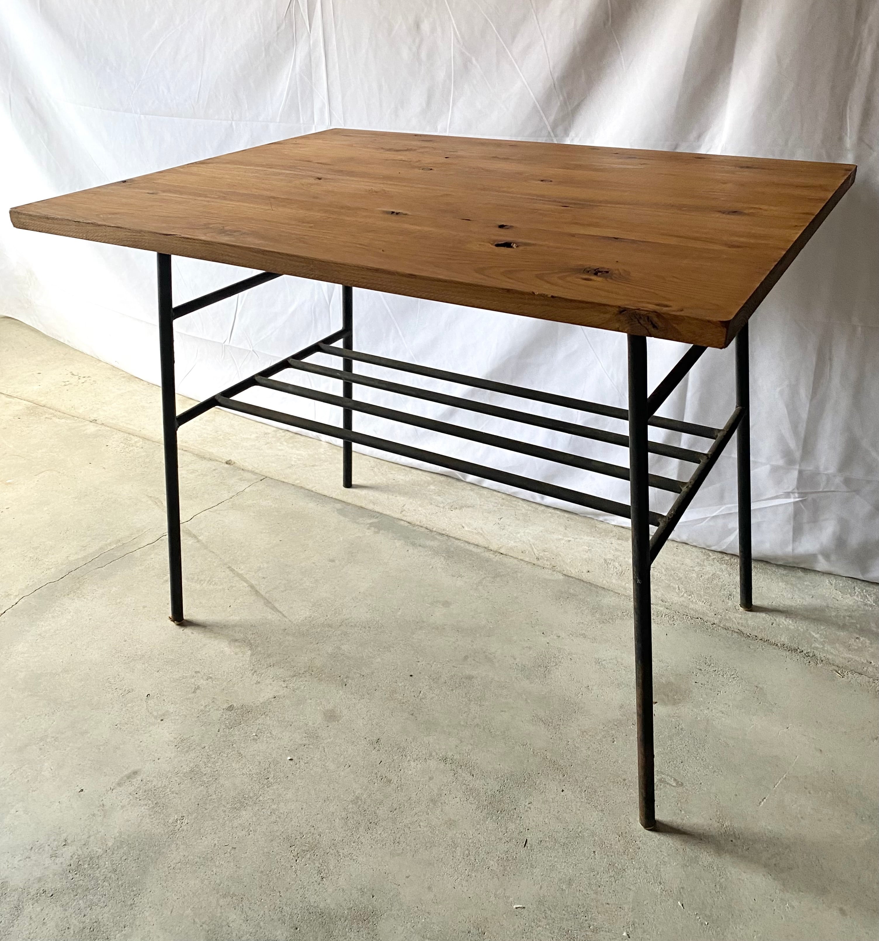 古い鉄脚と新材のテーブルになります。スレや剥げ、反り、割れ、サビ、当たりキズ、落としきれない汚れなどがあります。古い鉄脚になりますので少しのがたつきはありますが、全体的に状態も良く、まだまだ実用的に活躍してくれます。