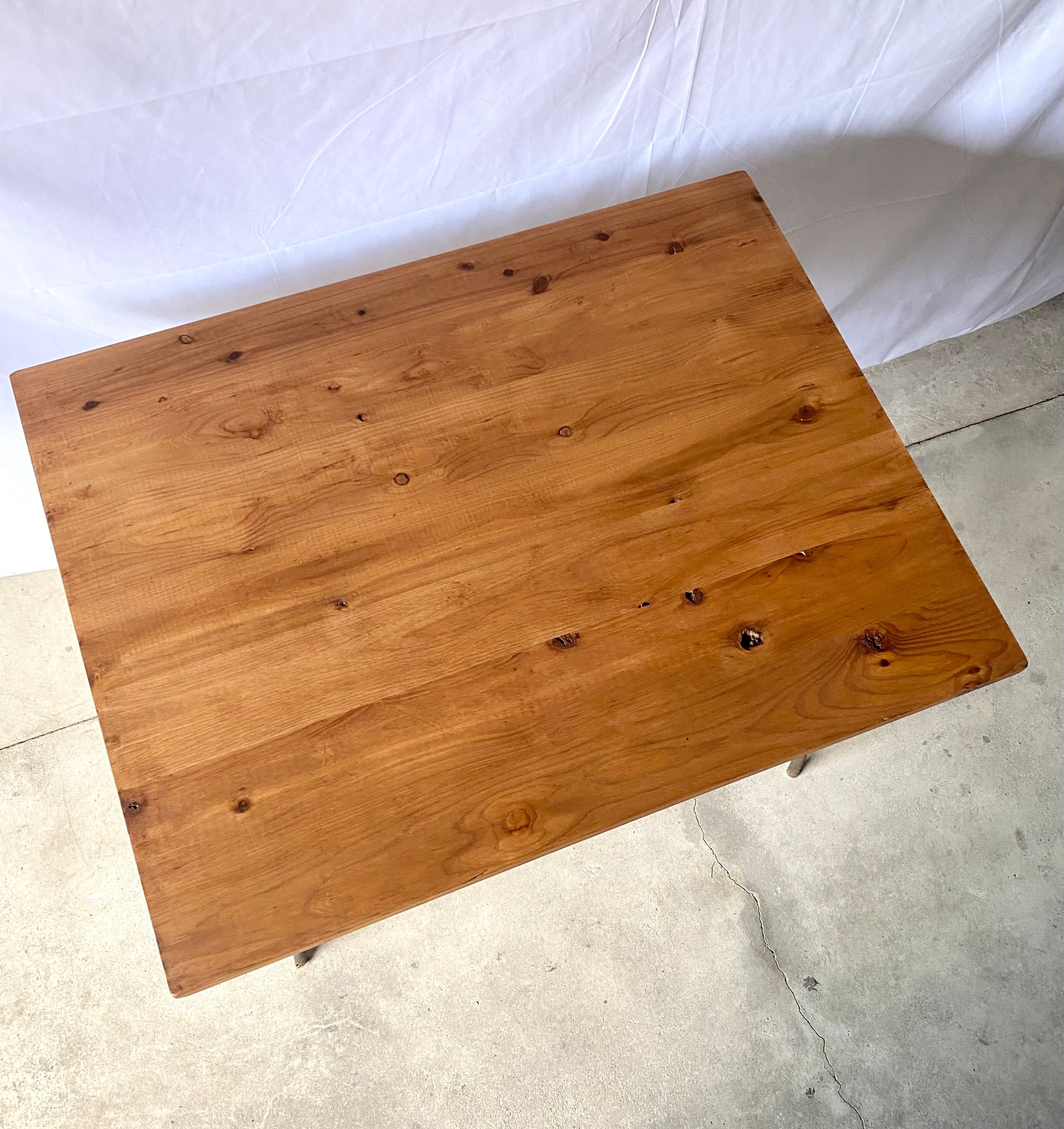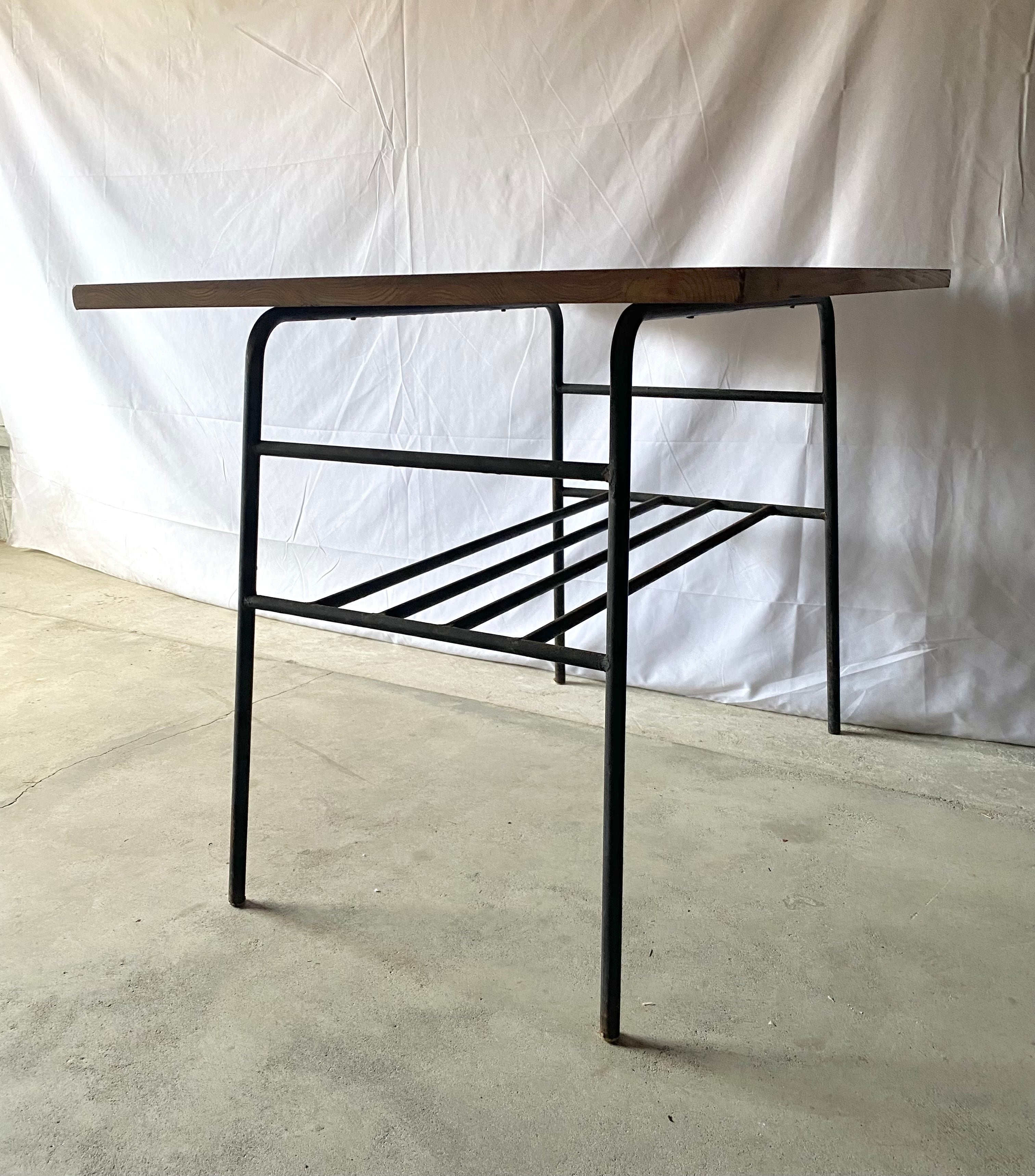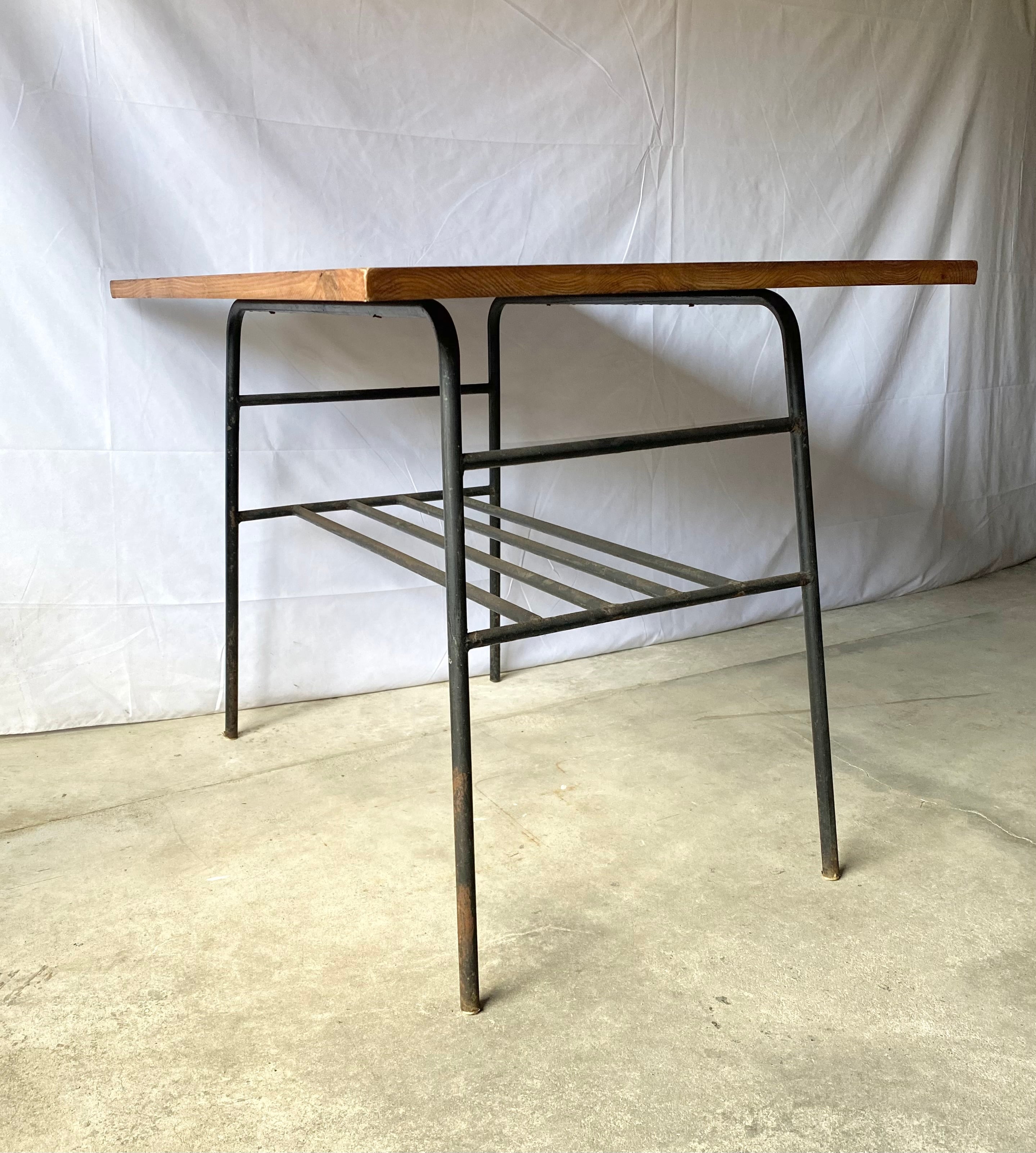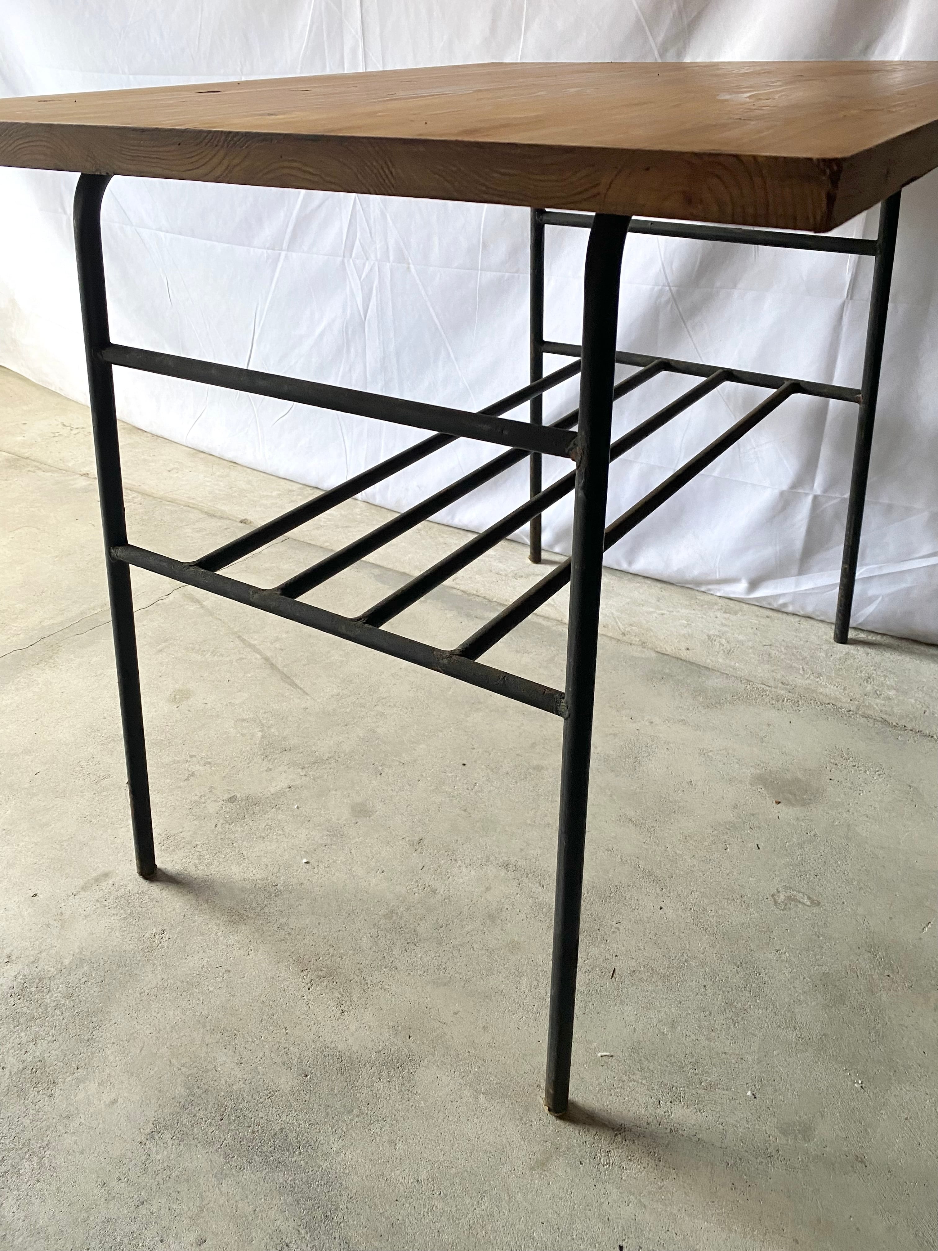 古い鉄脚と新材のテーブルになります。スレや剥げ、反り、割れ、サビ、当たりキズ、落としきれない汚れなどがあります。古い鉄脚になりますので少しのがたつきはありますが、全体的に状態も良く、まだまだ実用的に活躍してくれます。