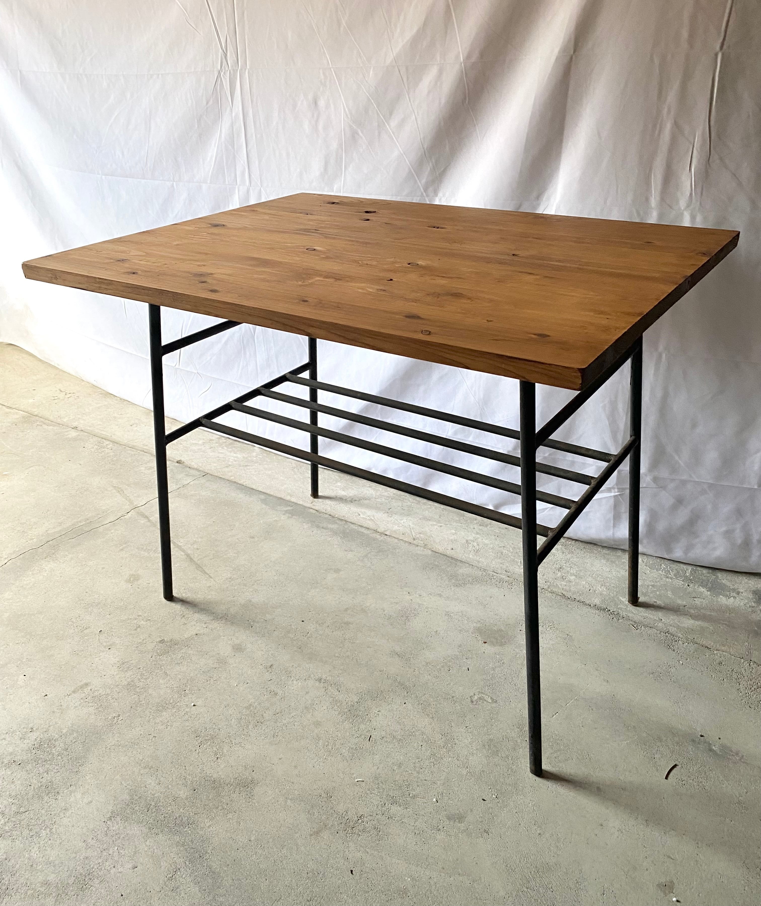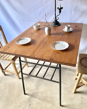 雰囲気の良い木板と古い鉄脚が良く馴染んだ鉄脚テーブル。天板下のオープンラックも雑誌などが置けるので便利です。ダイニングで2人掛けのテーブルとしてや日常の作業をするテーブルとしてもオススメです。味のあるテーブルひとつプラスするだけで雰囲気あるお部屋作りが叶いそうです。