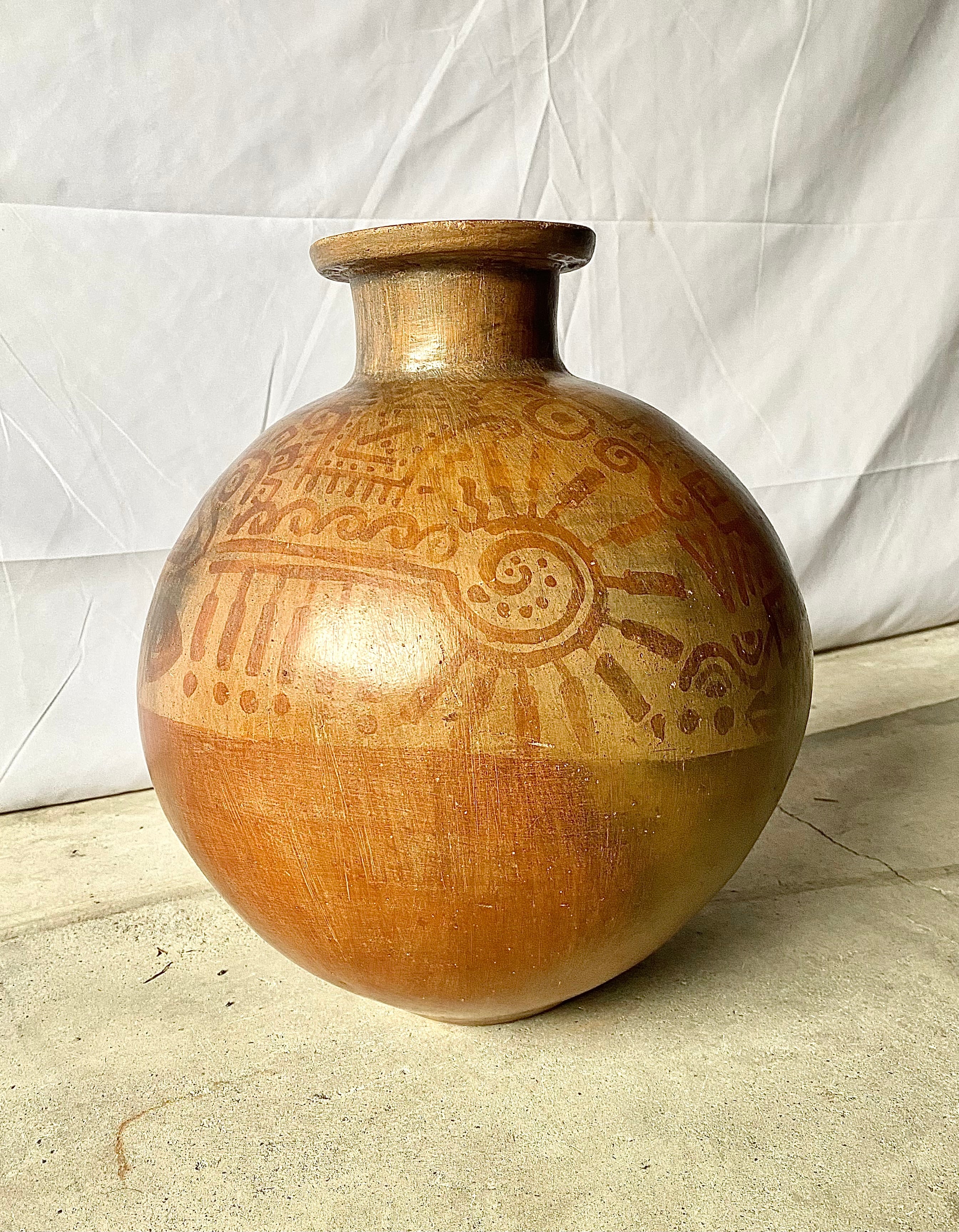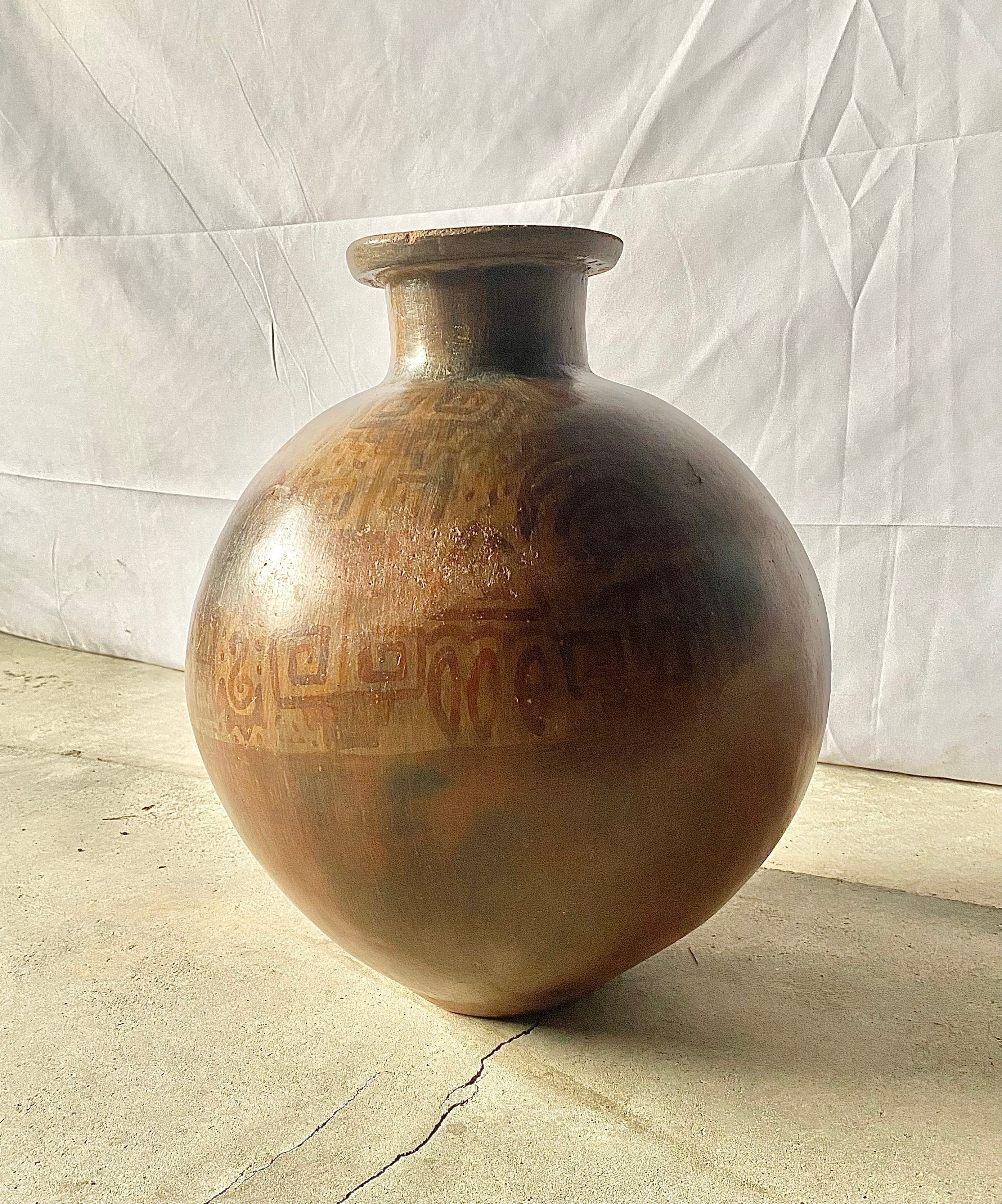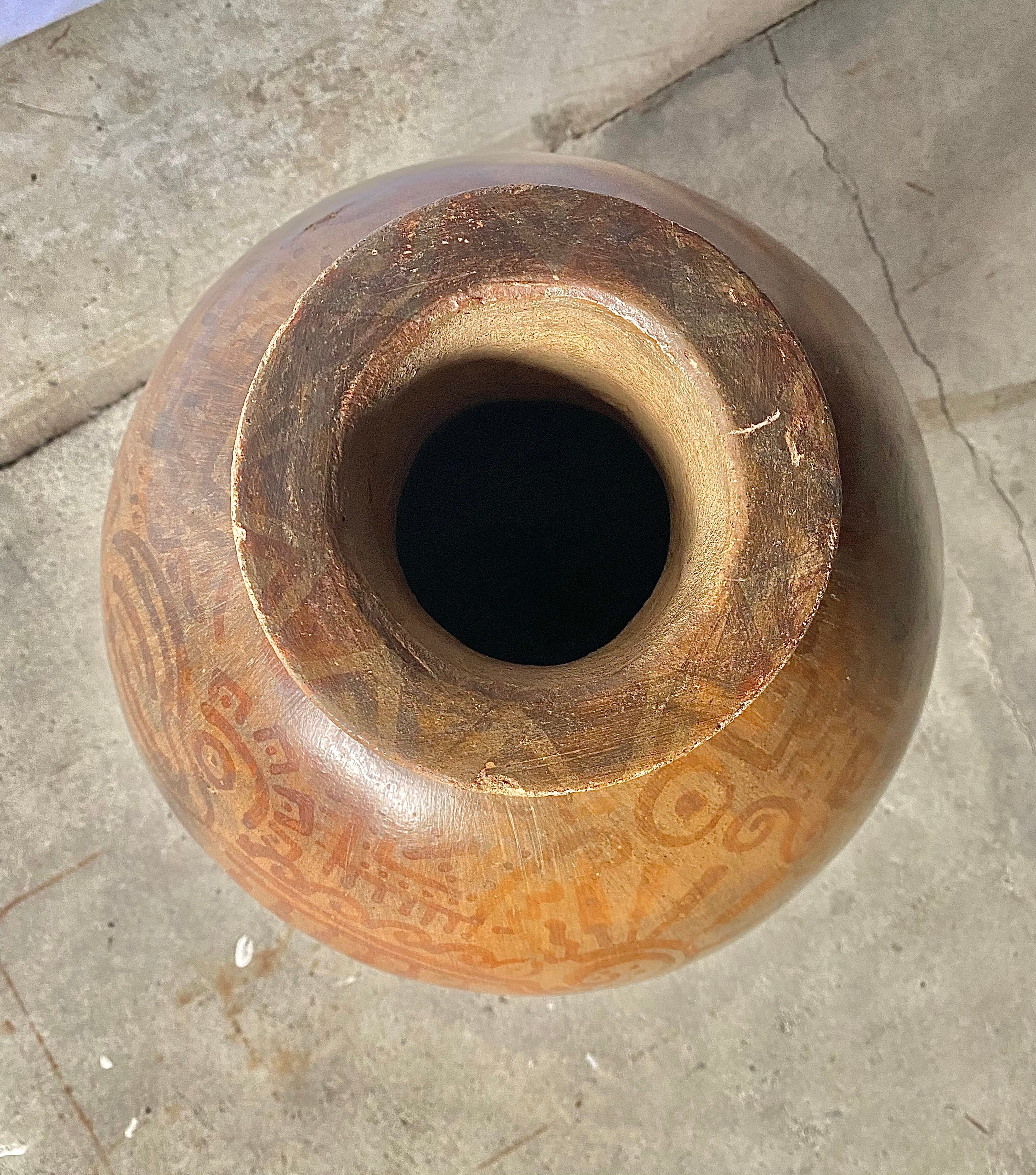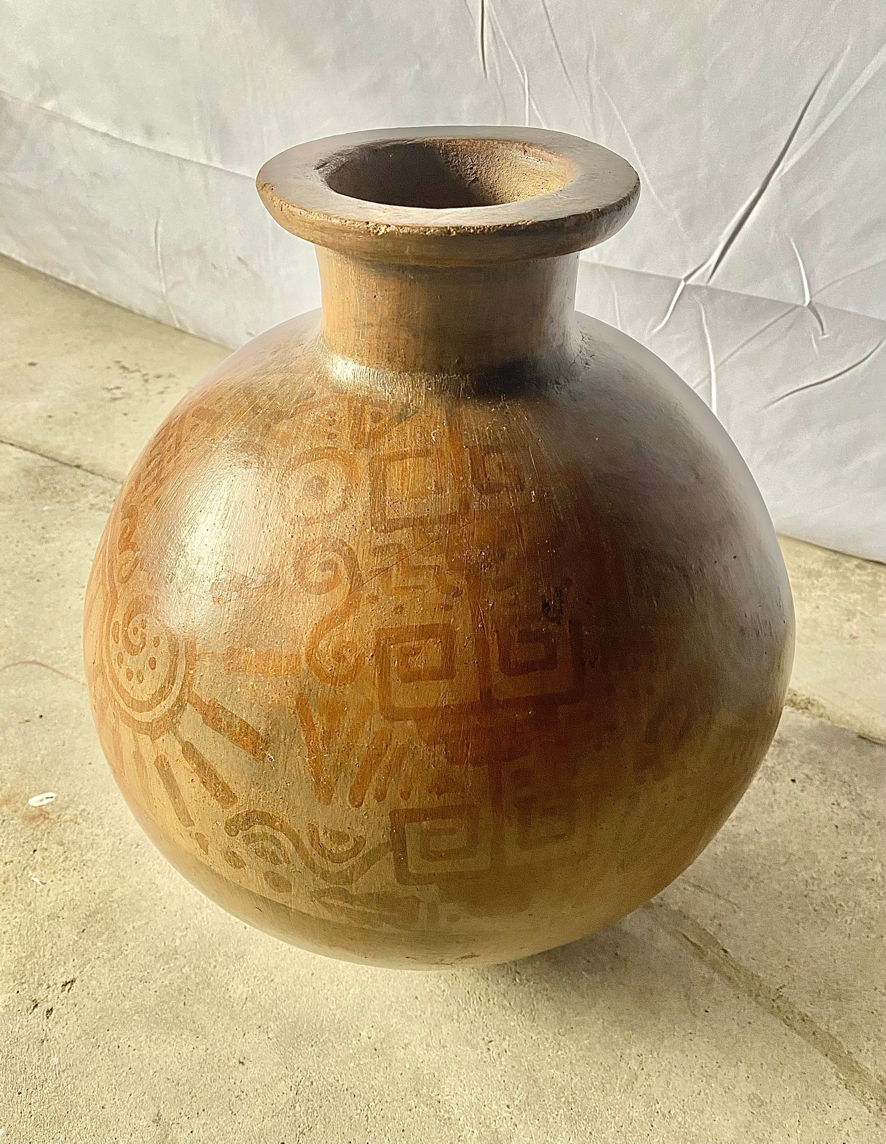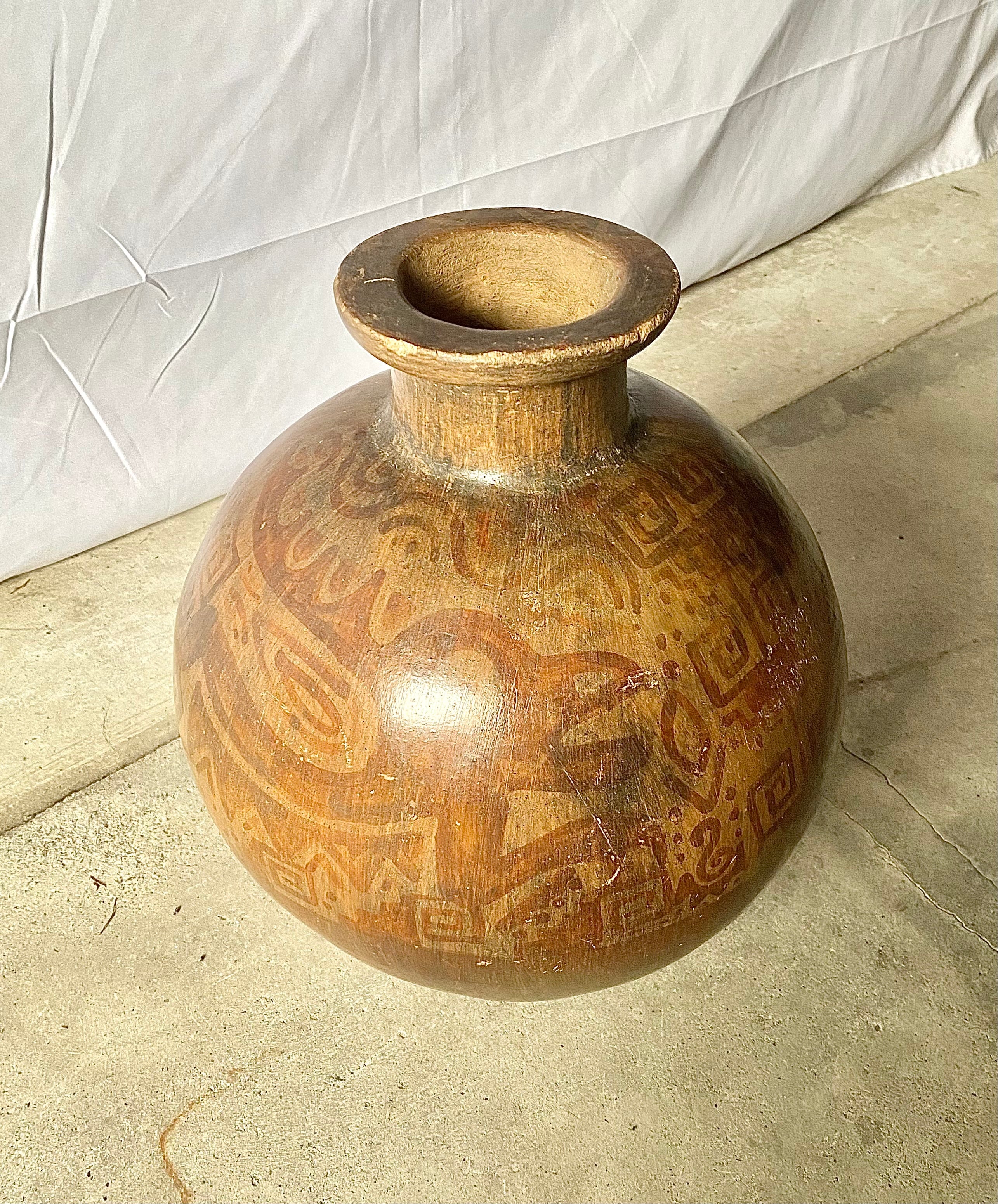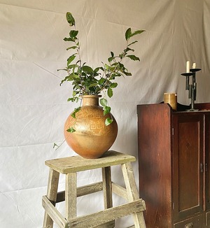 象形文字を思わせる個性的な柄が入った木製壺。飾り台や棚上、卓上、カウンター上で切り花や枝木を挿して飾るとお部屋が華やかになります。床の間などでそのままオブジェとして飾っても格好良いです。