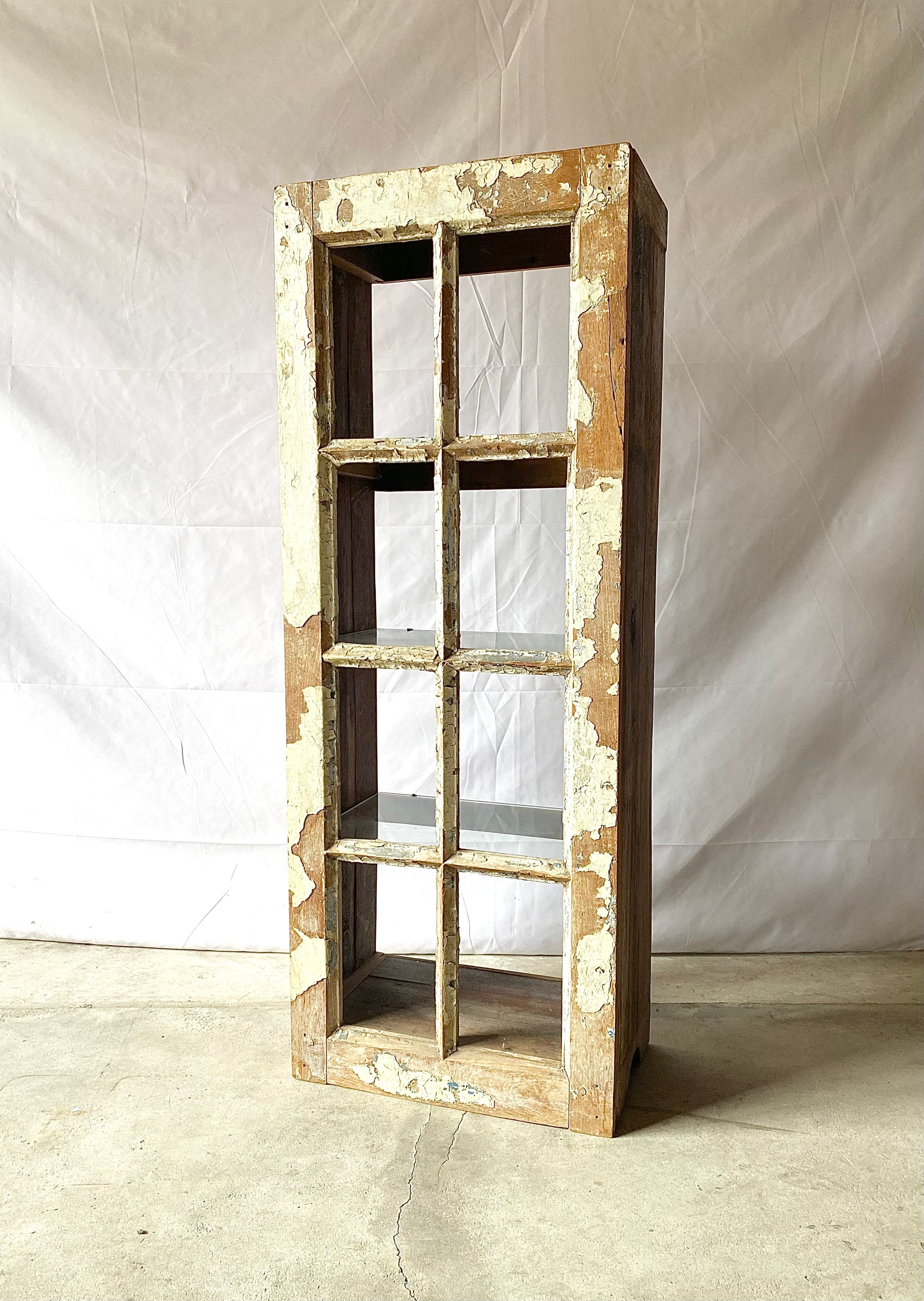 シャビーシックな佇まい、すらっとした背のある姿が素敵な棚。両面オープンになっているので2つの雰囲気を楽しめます。お部屋の日の入る窓際に置いて、小物や植物を飾ると感じ良く写りそうです。