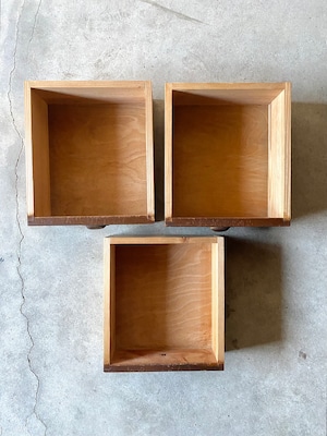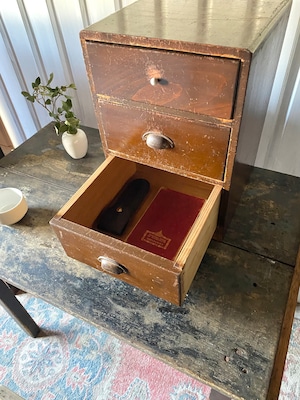 経年変化の雰囲気ある木肌と味のある取手がアクセントの小引出し。お部屋の卓上やカウンター上、棚脇に置いて、細々した物や本、ステーショナリーの収納としても素敵です。