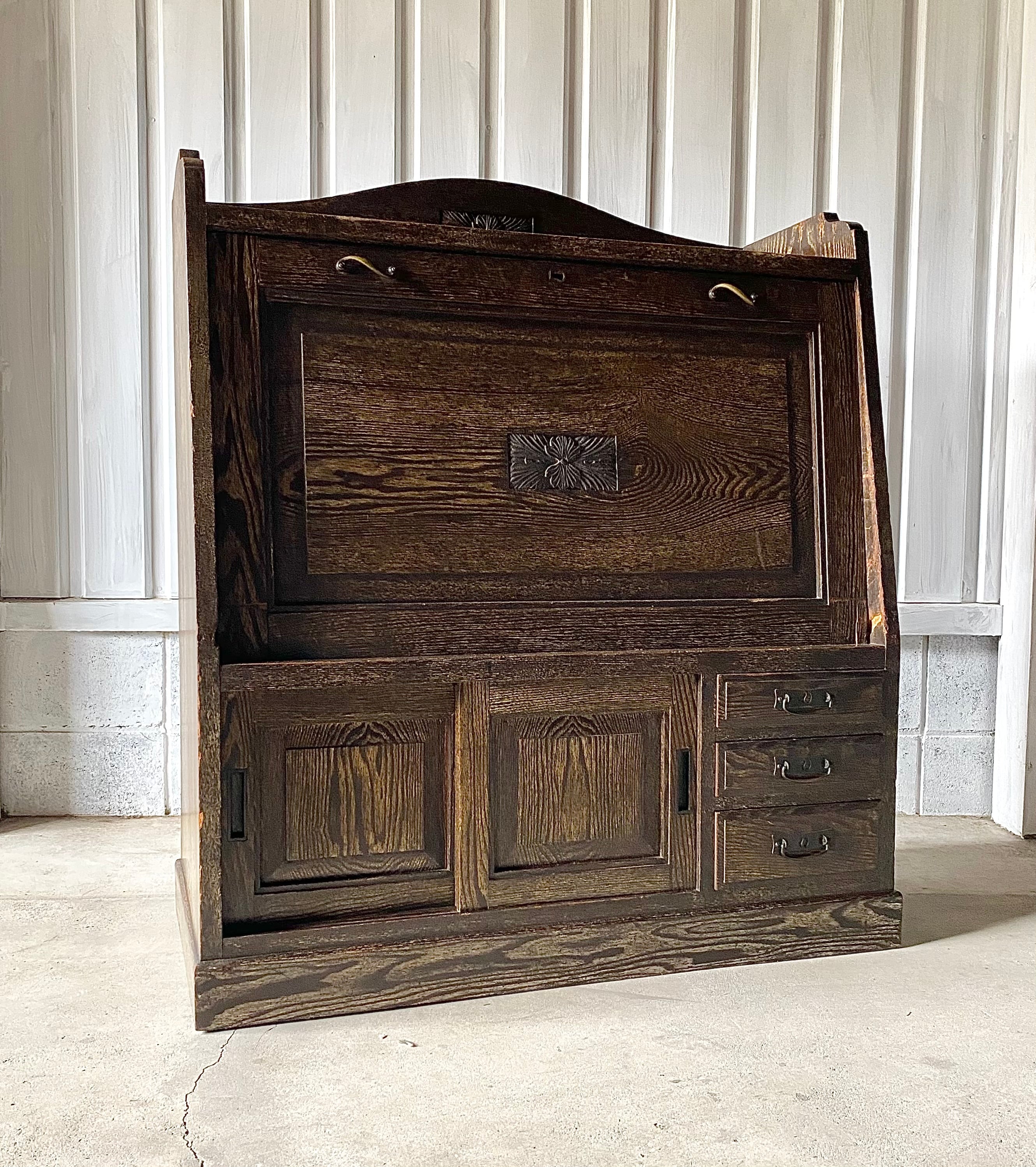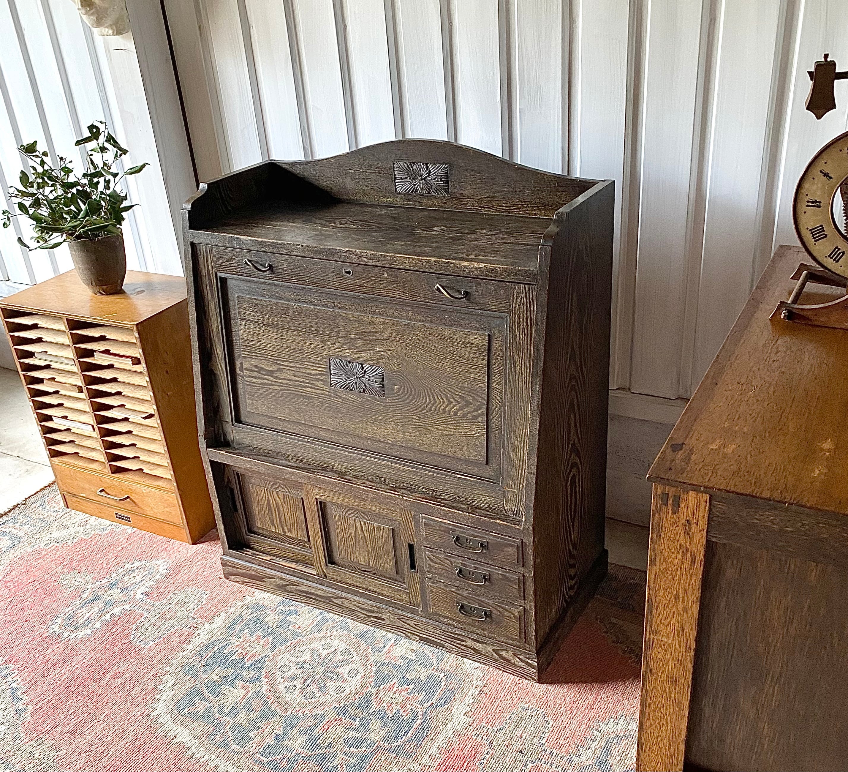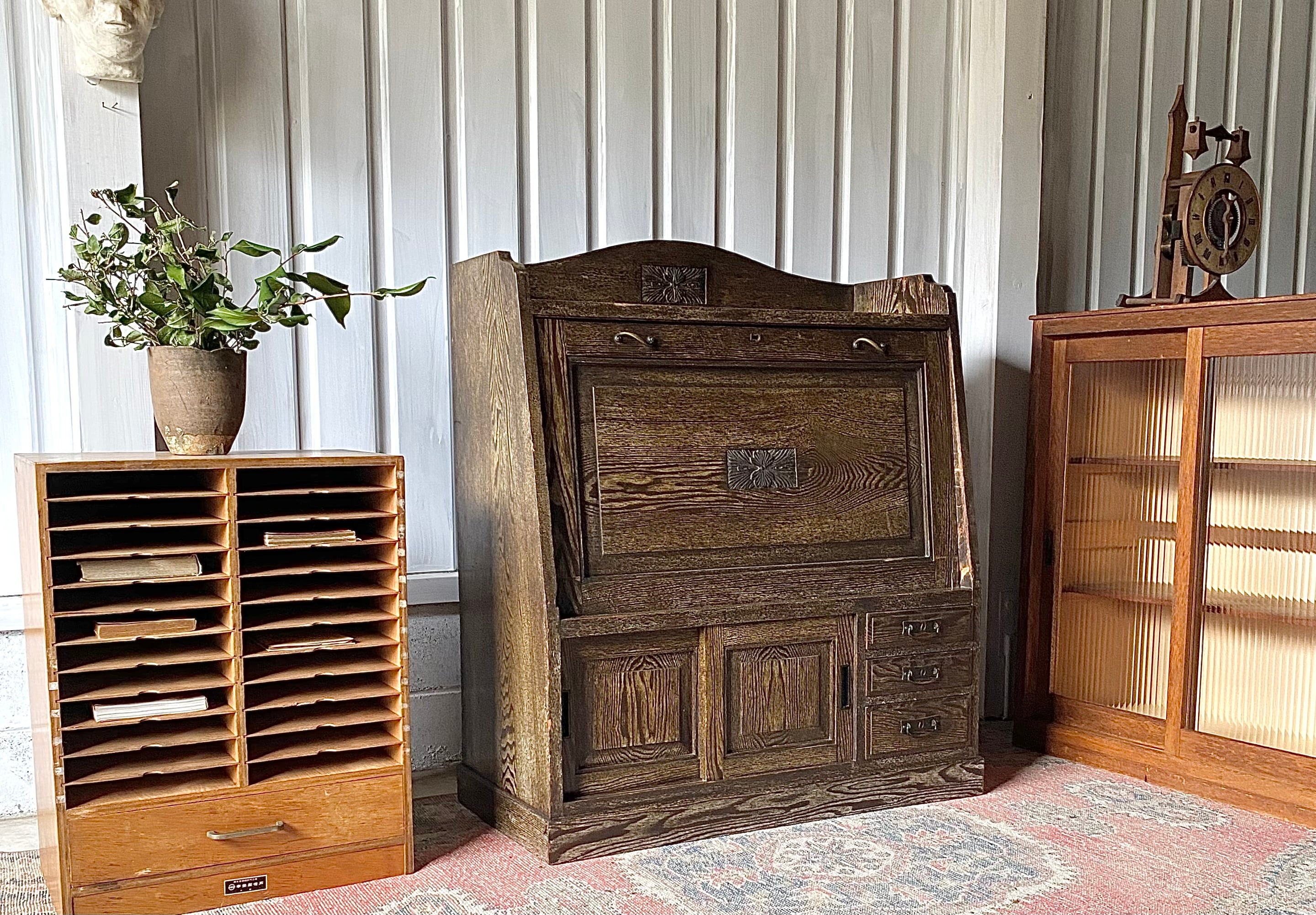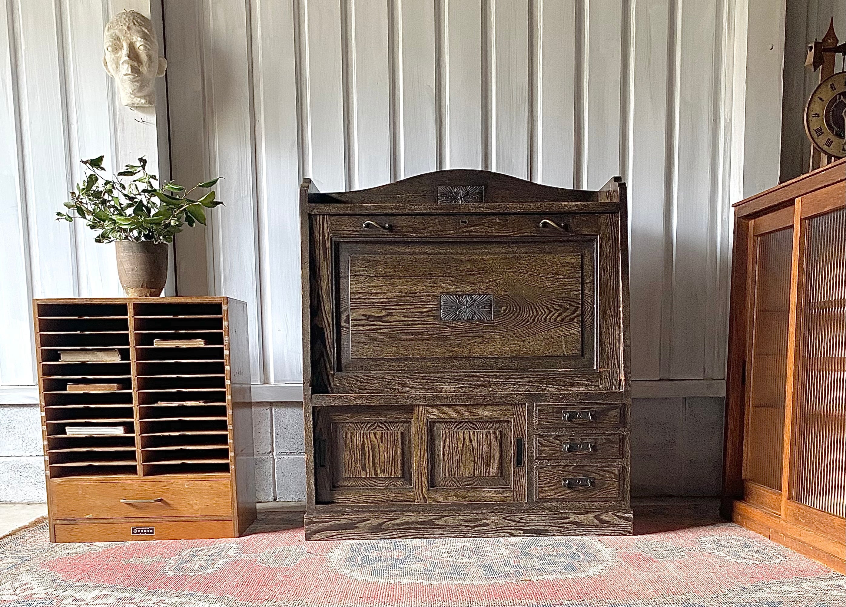 重厚感と品の良さ、個性のある姿が感じ良いビューロー。しっかりとしていて装飾などこだわりのこもった品です。後ろ姿まで素敵。アトリエやリビングで本や小物、紙物、道具、パーツ入れとしても素敵です。ただそこにあるだけで惚れ惚れする佇まいです。
