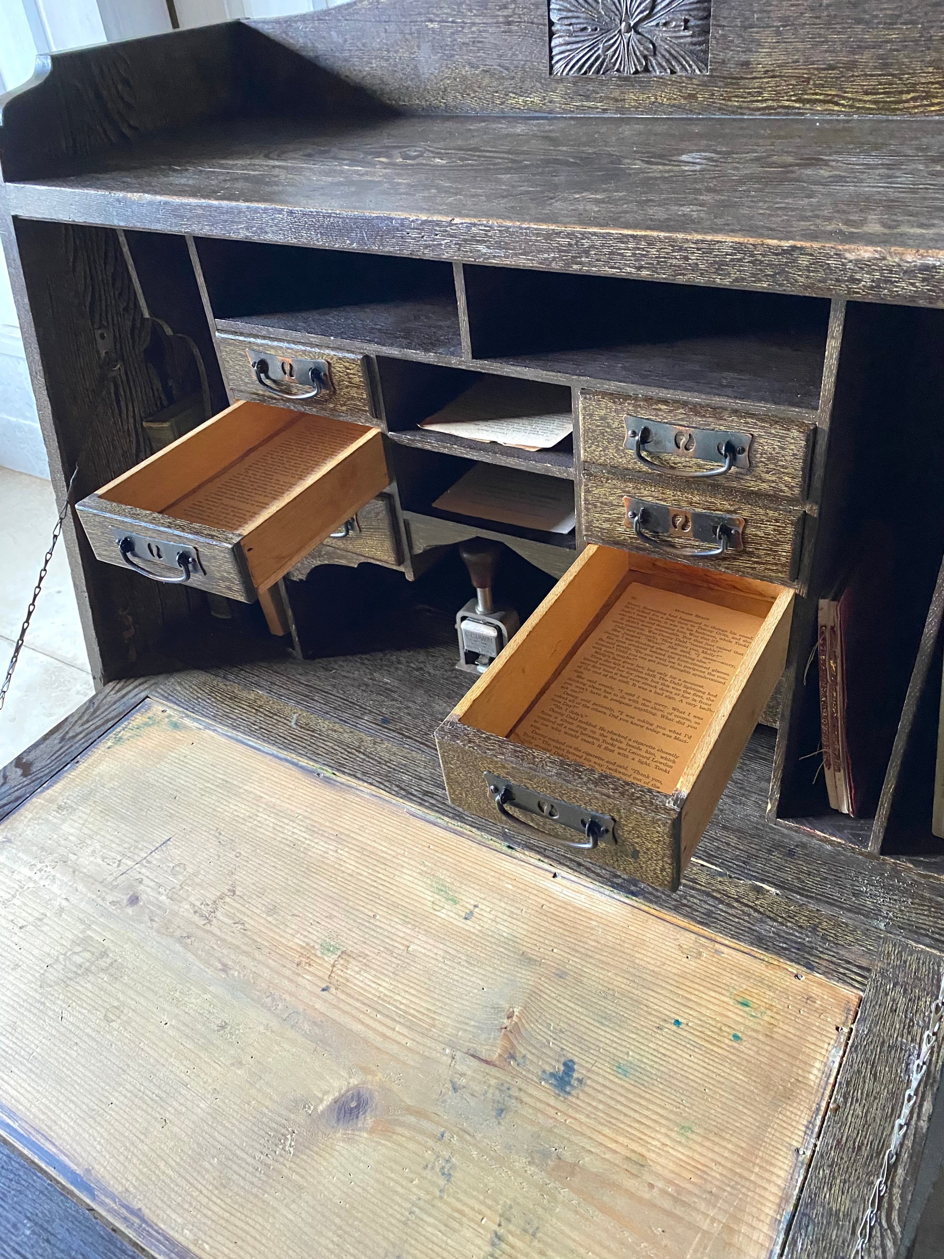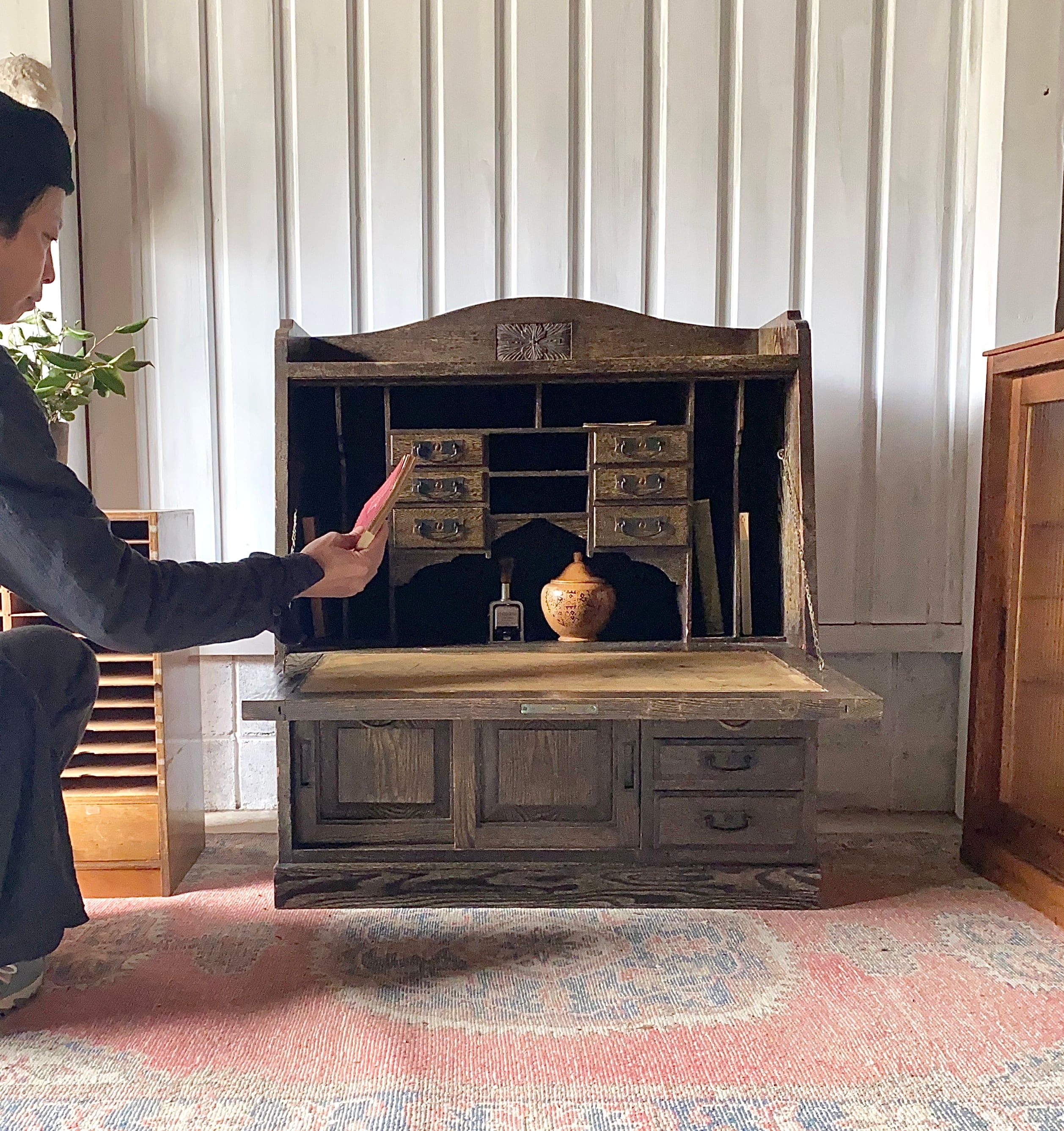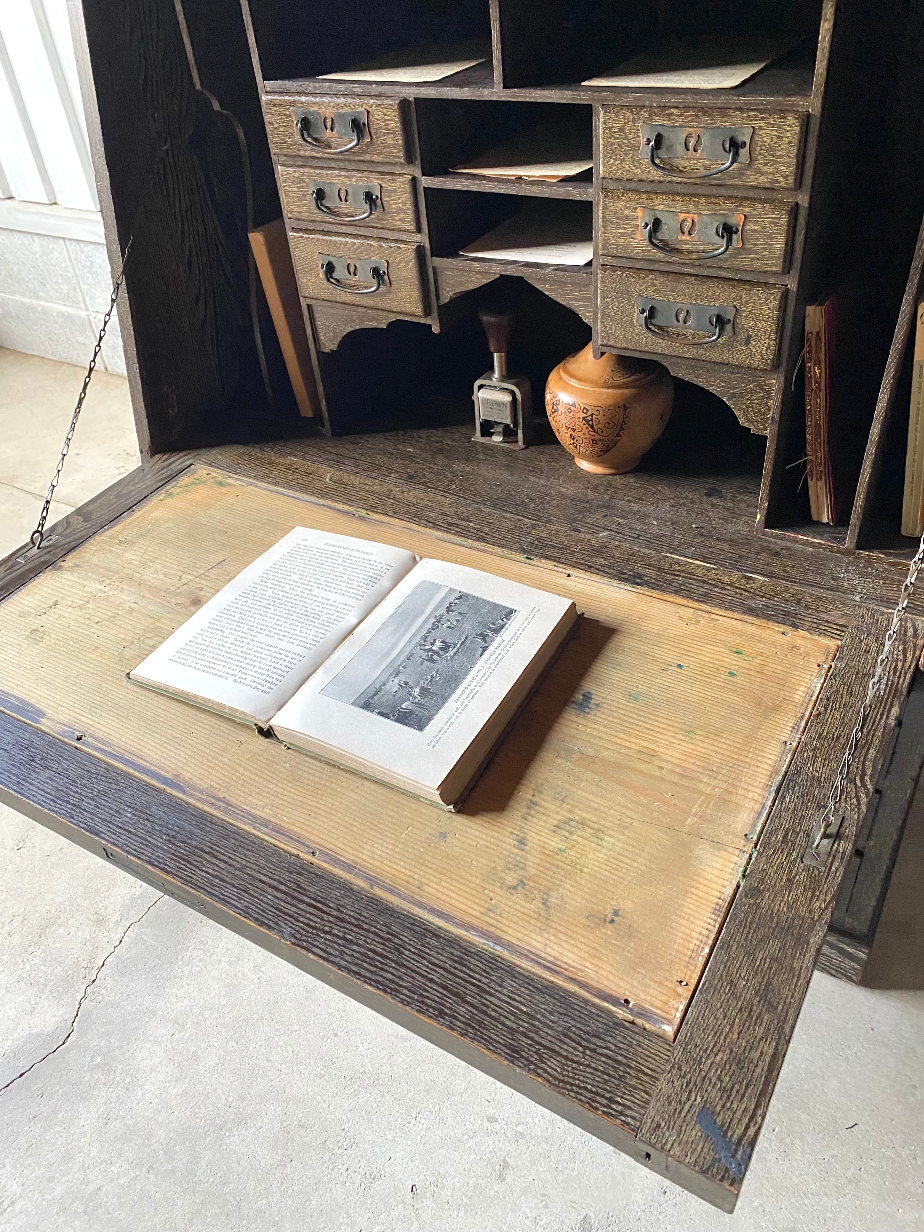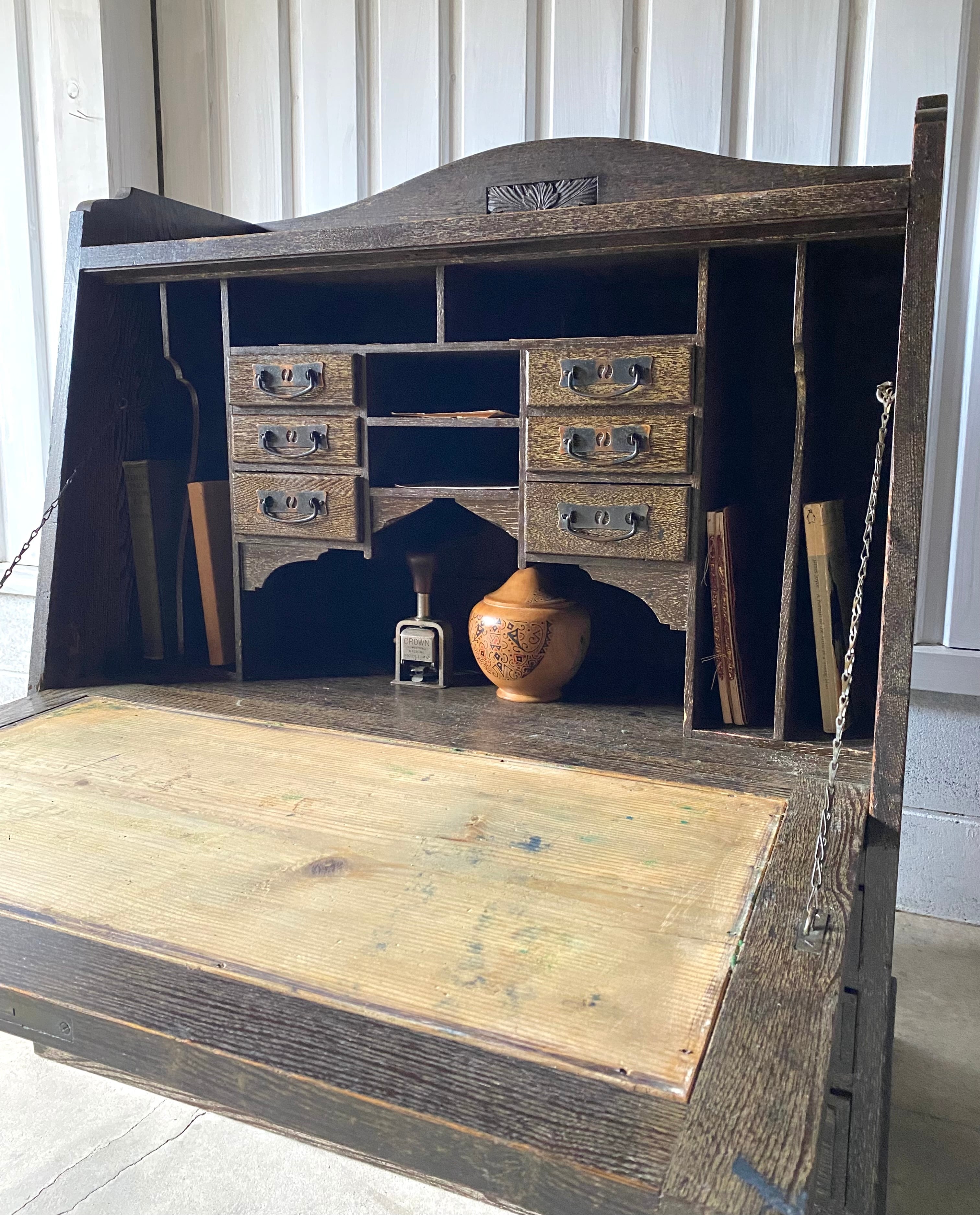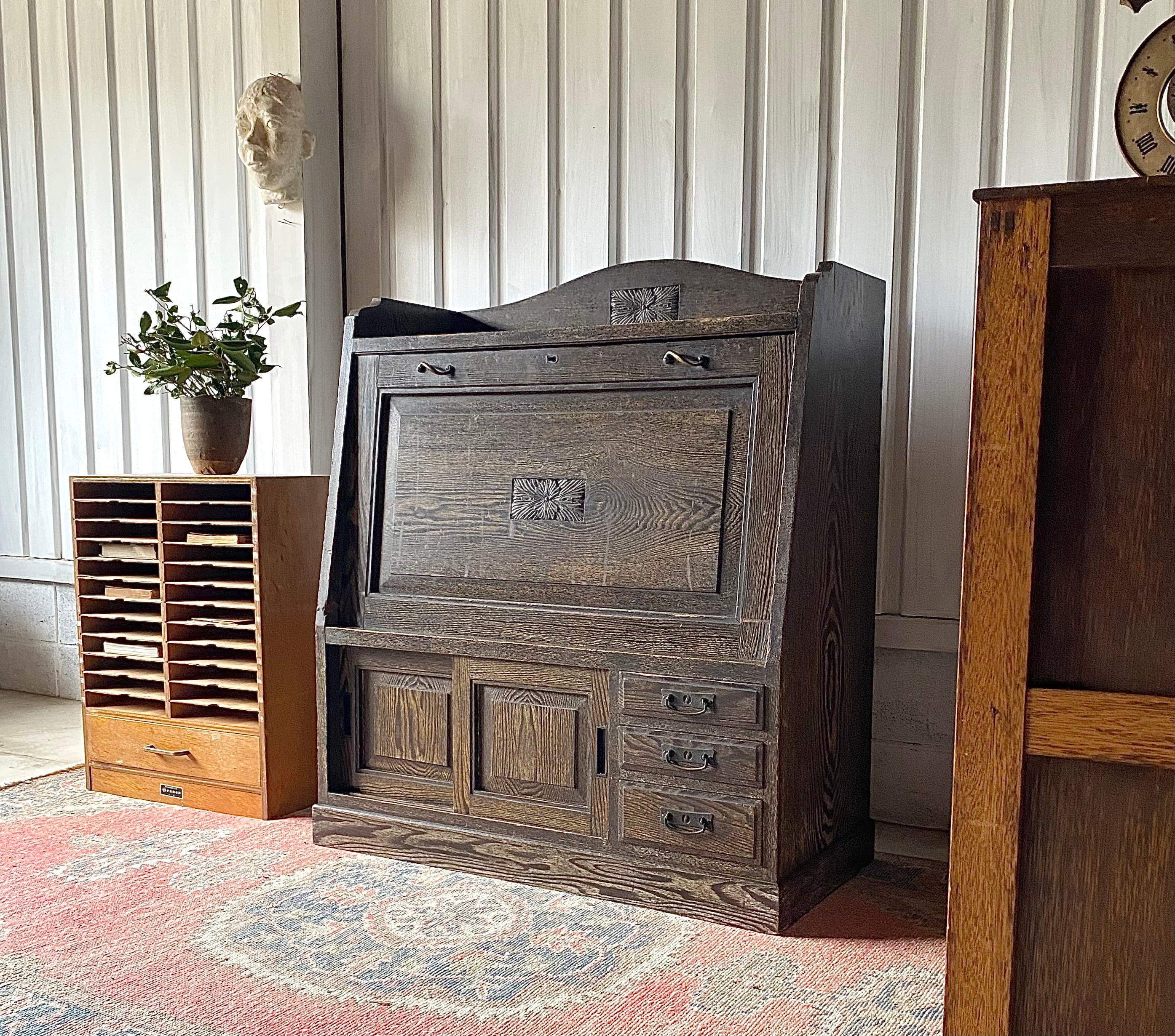 重厚感と品の良さ、個性のある姿が感じ良いビューロー。しっかりとしていて装飾などこだわりのこもった品です。後ろ姿まで素敵。アトリエやリビングで本や小物、紙物、道具、パーツ入れとしても素敵です。ただそこにあるだけで惚れ惚れする佇まいです。