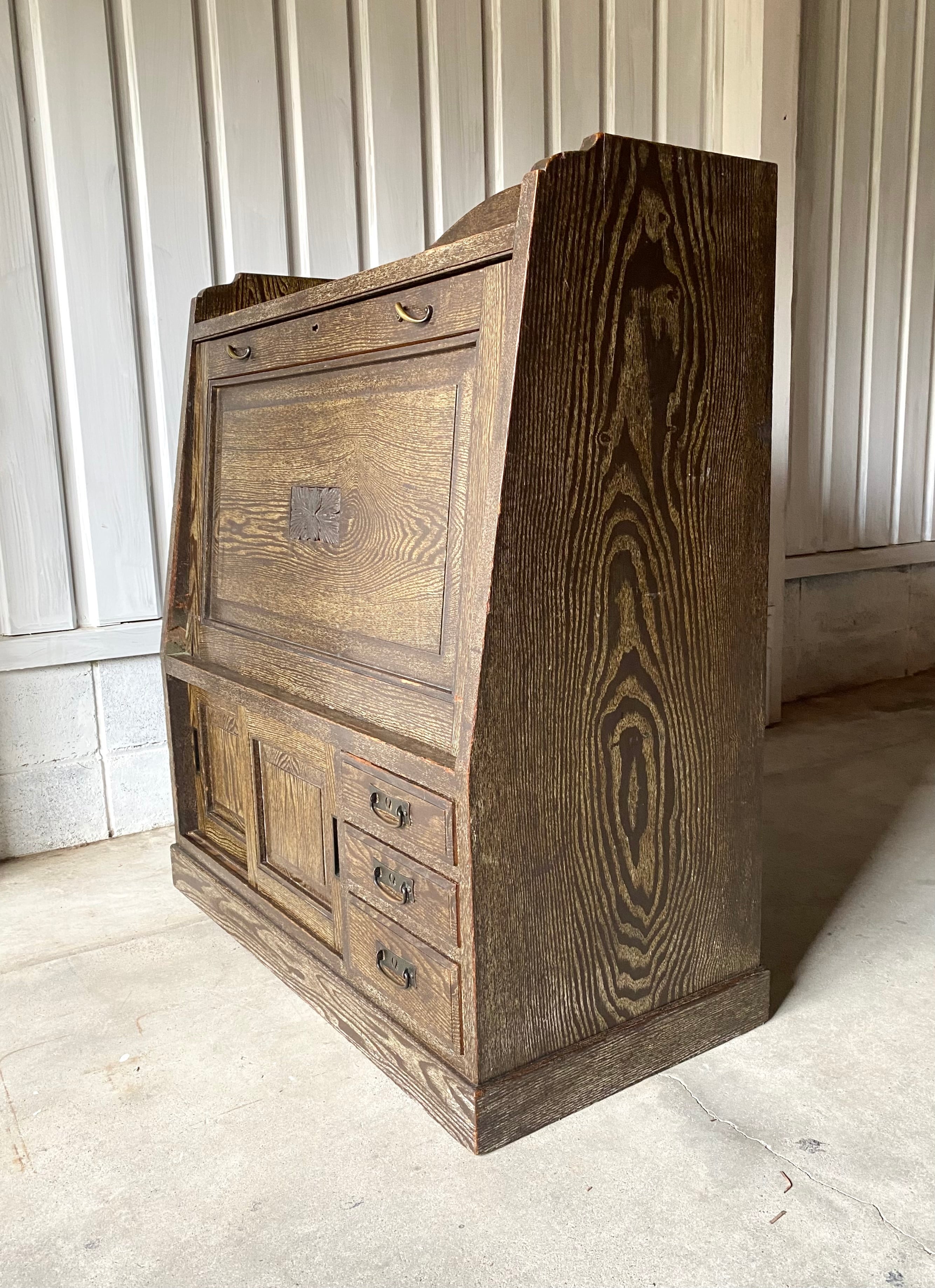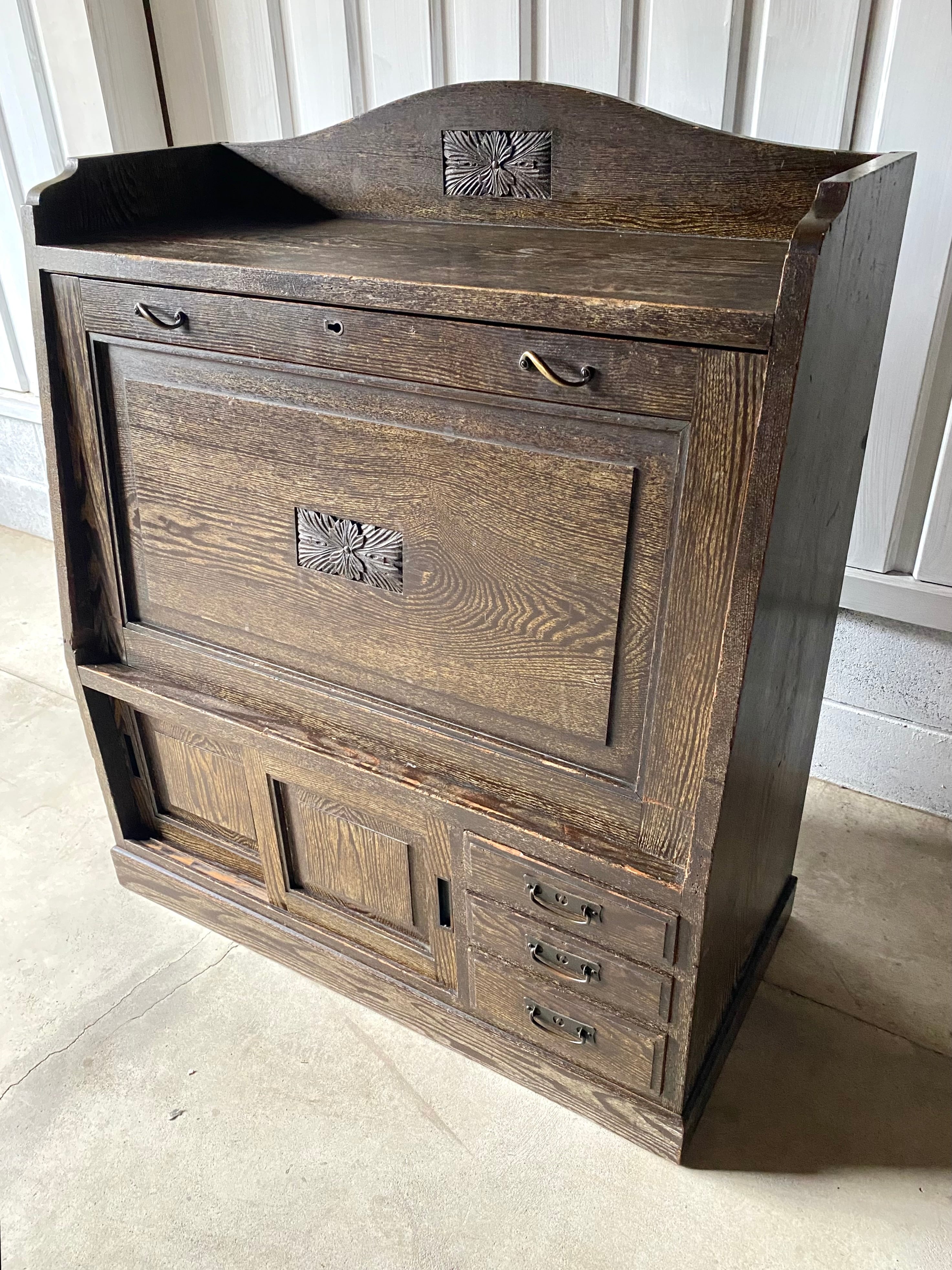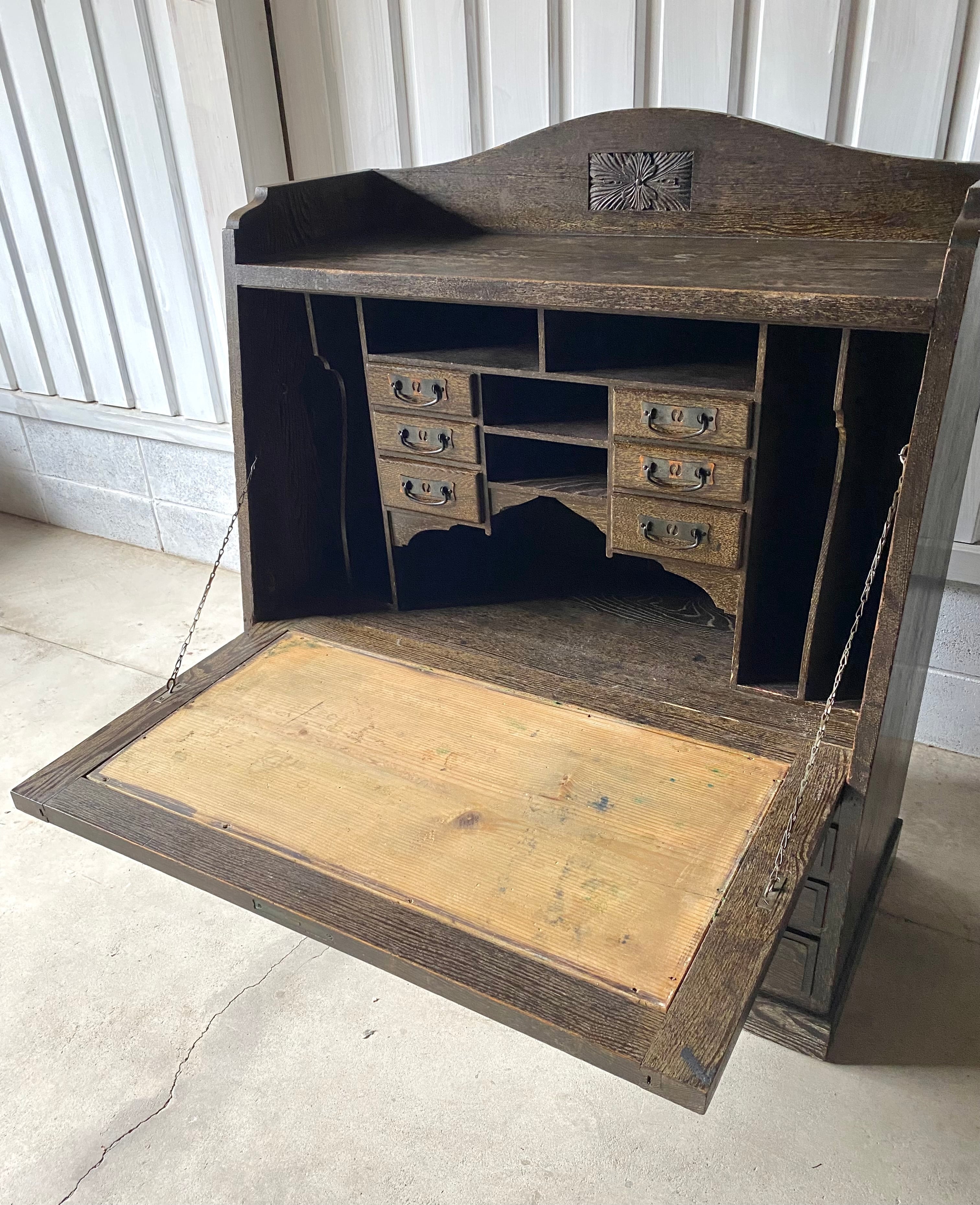 古いビューローになります。スレや欠け、当たりキズ、禿げ、隙間、落としきれない汚れなどがあります。扉戸、引出し、引戸の開閉はスムーズに行えます。全体的に状態も良いのでまだまだ実用的に活躍してくれます。