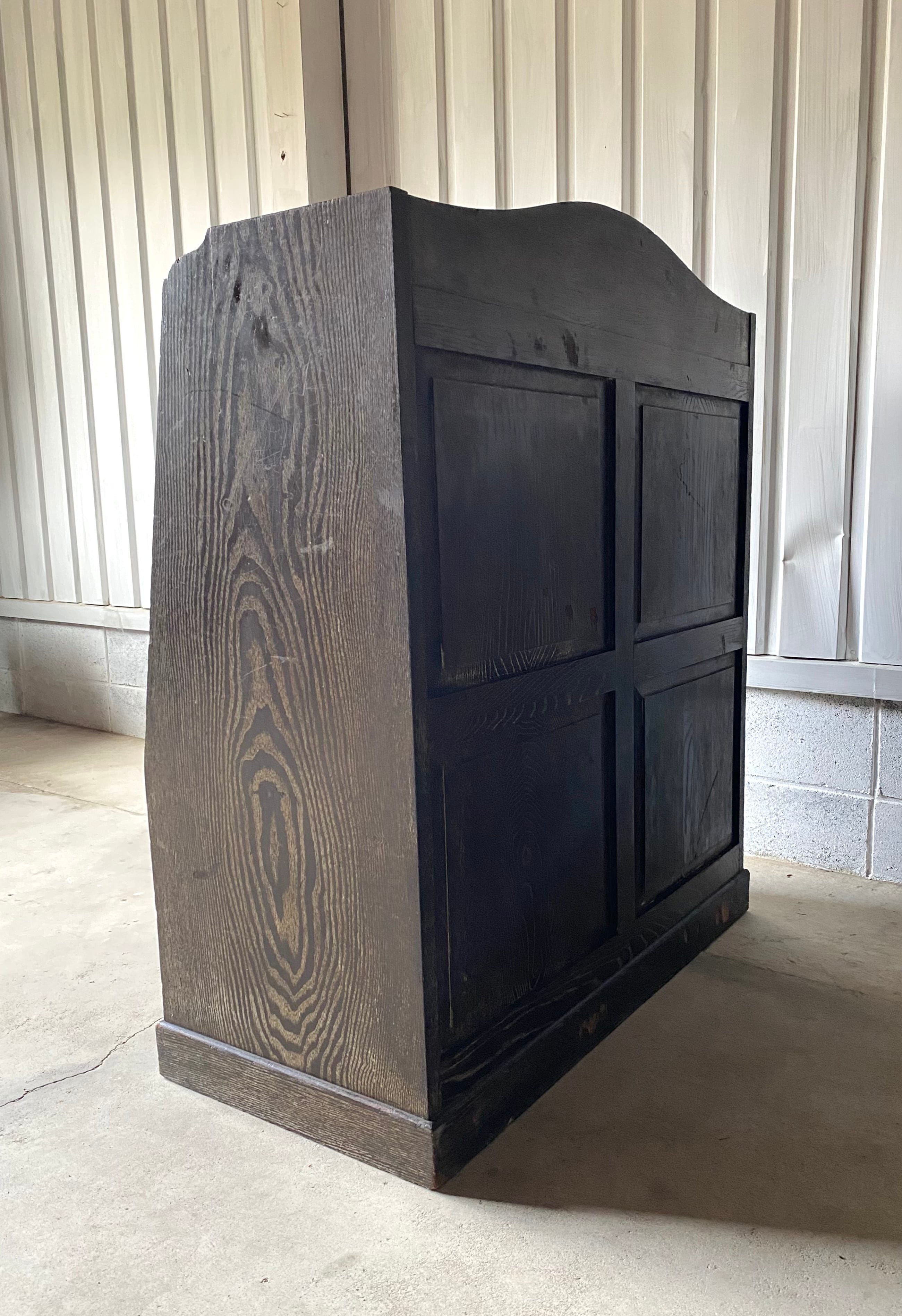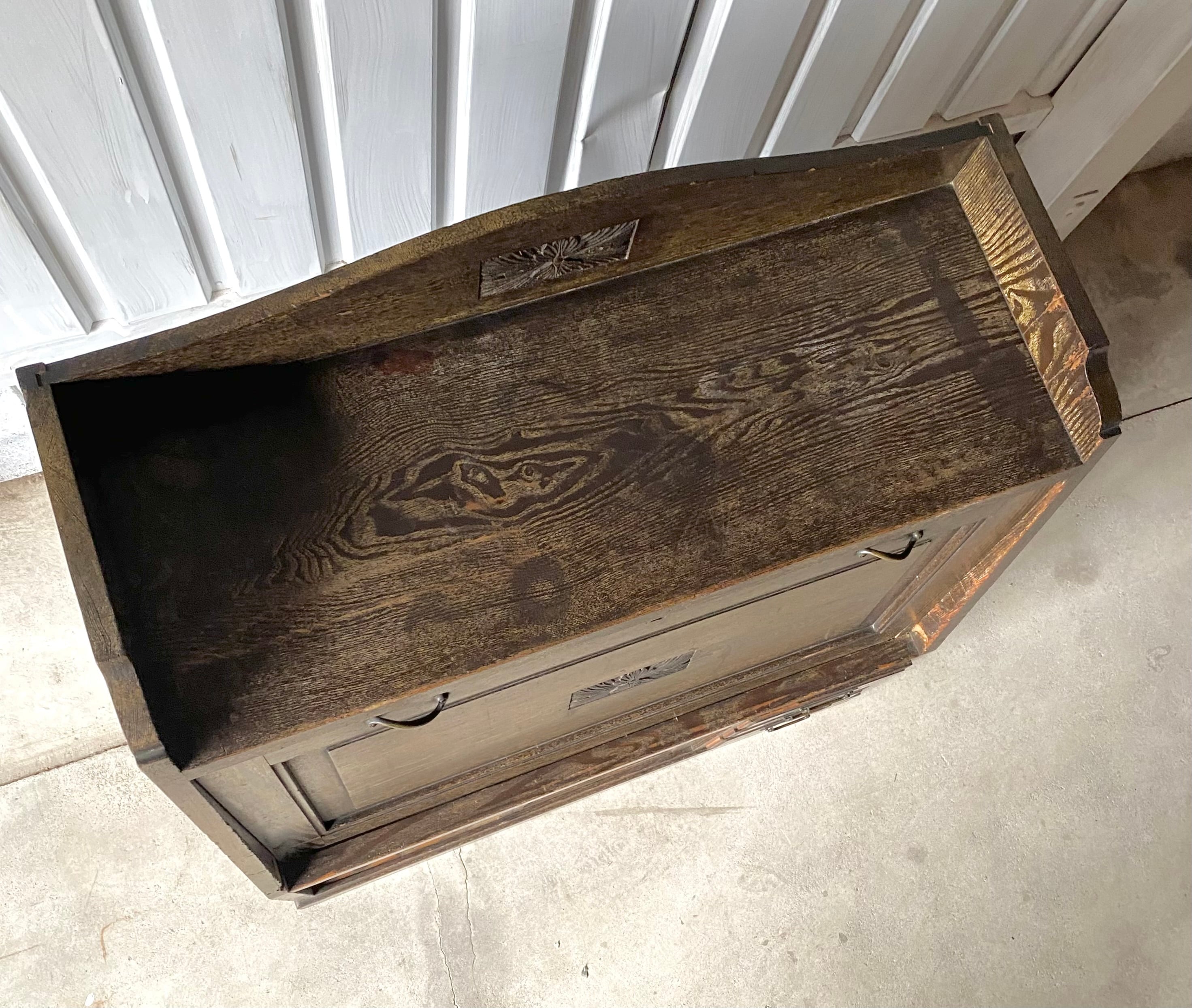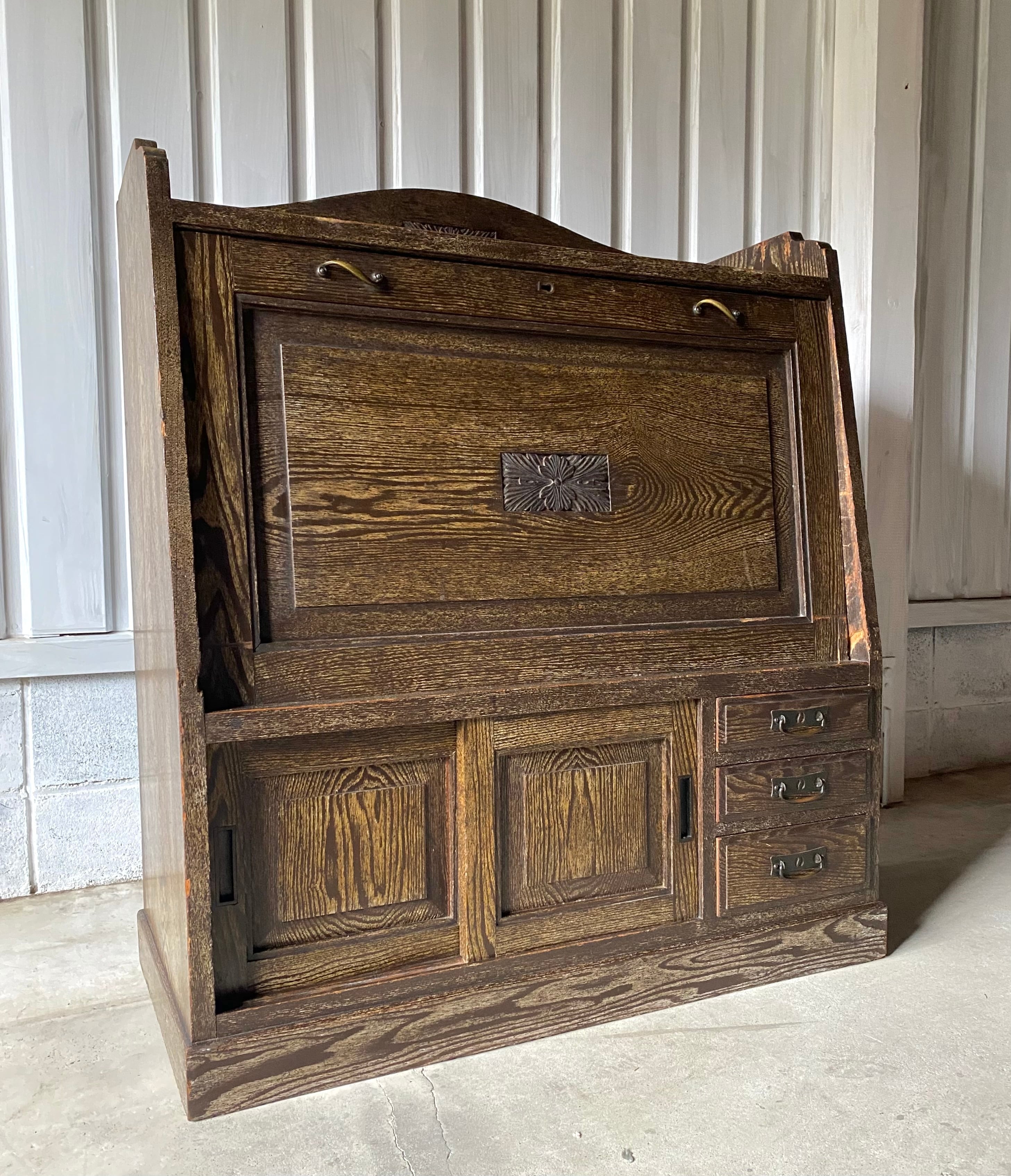 古いビューローになります。スレや欠け、当たりキズ、禿げ、隙間、落としきれない汚れなどがあります。扉戸、引出し、引戸の開閉はスムーズに行えます。全体的に状態も良いのでまだまだ実用的に活躍してくれます。