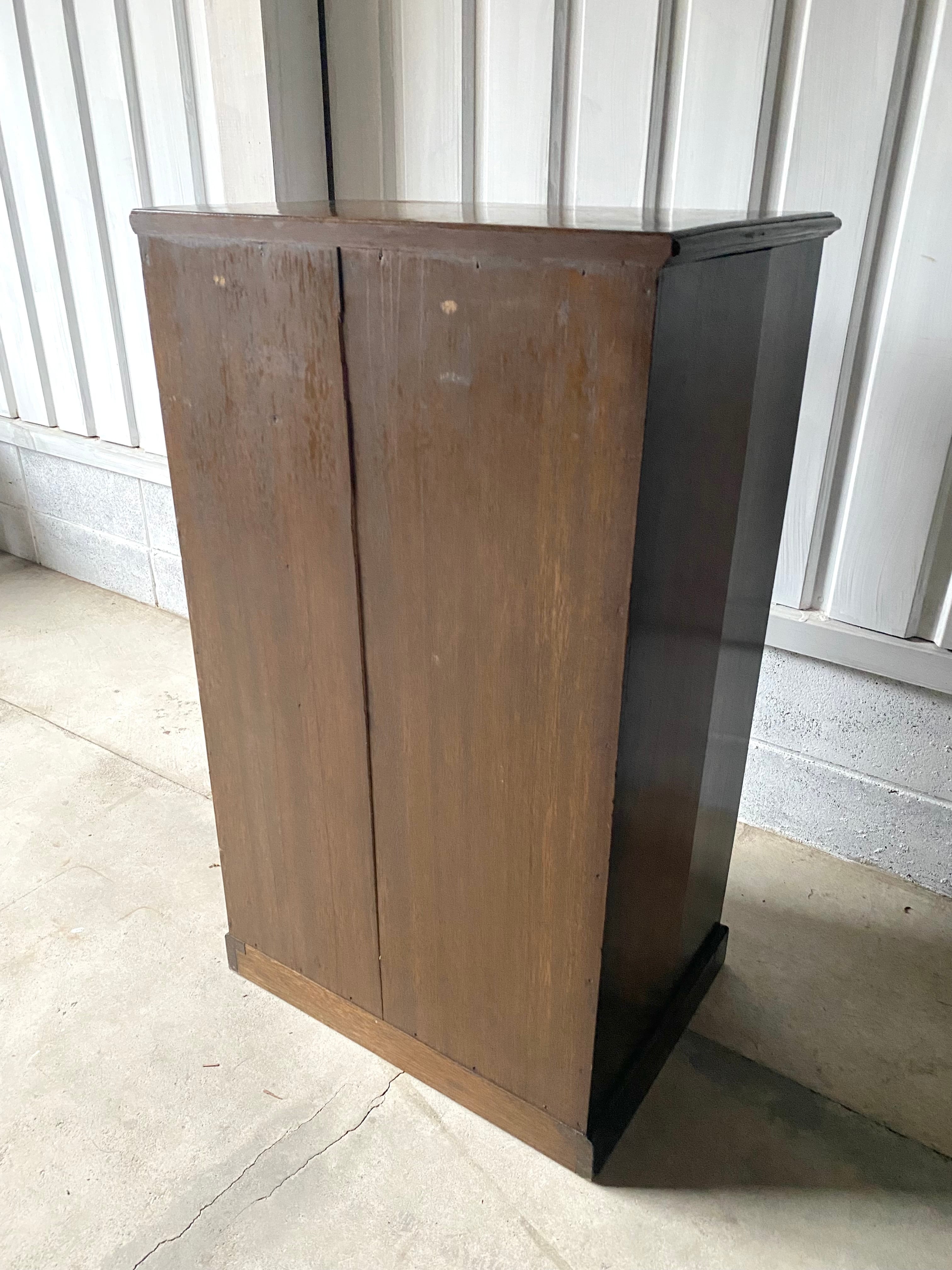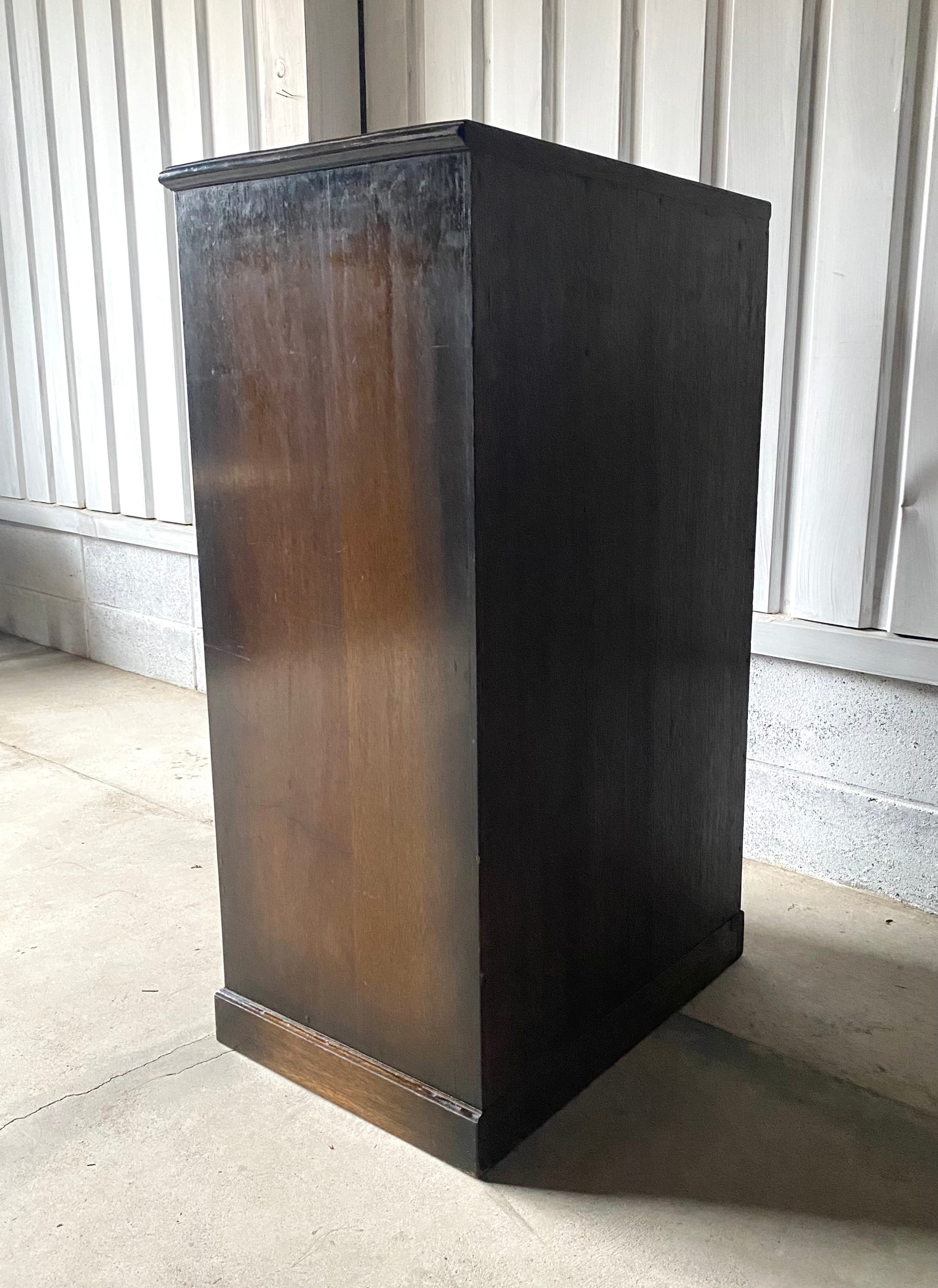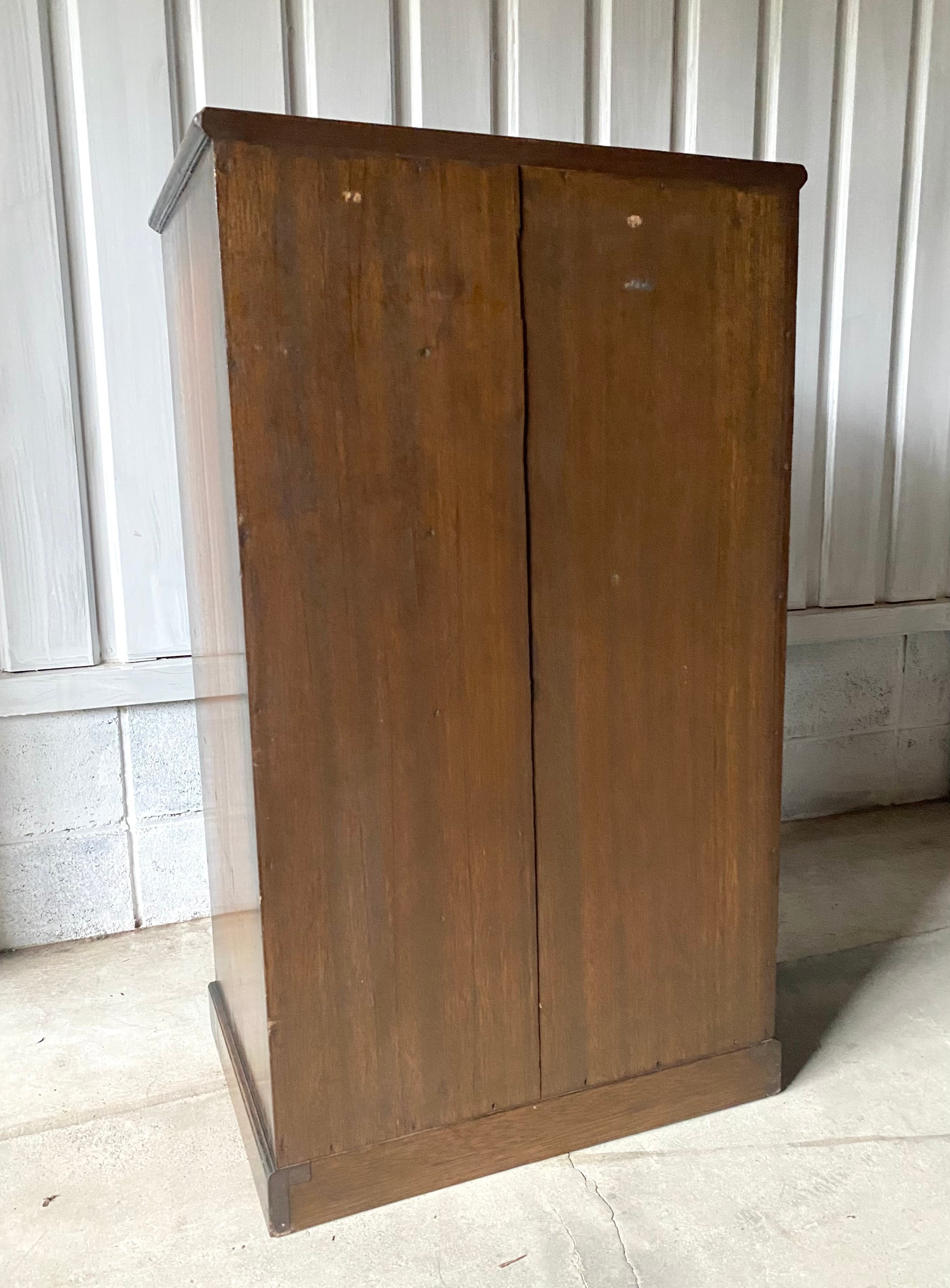 古い収納棚になります。スレや欠け、当たりキズ、禿げ、サビ、落としきれない汚れなどがあります。引出し、扉戸の開閉は比較的スムーズに行えます。全体的に状態も良いのでまだまだ実用的に活躍してくれます。