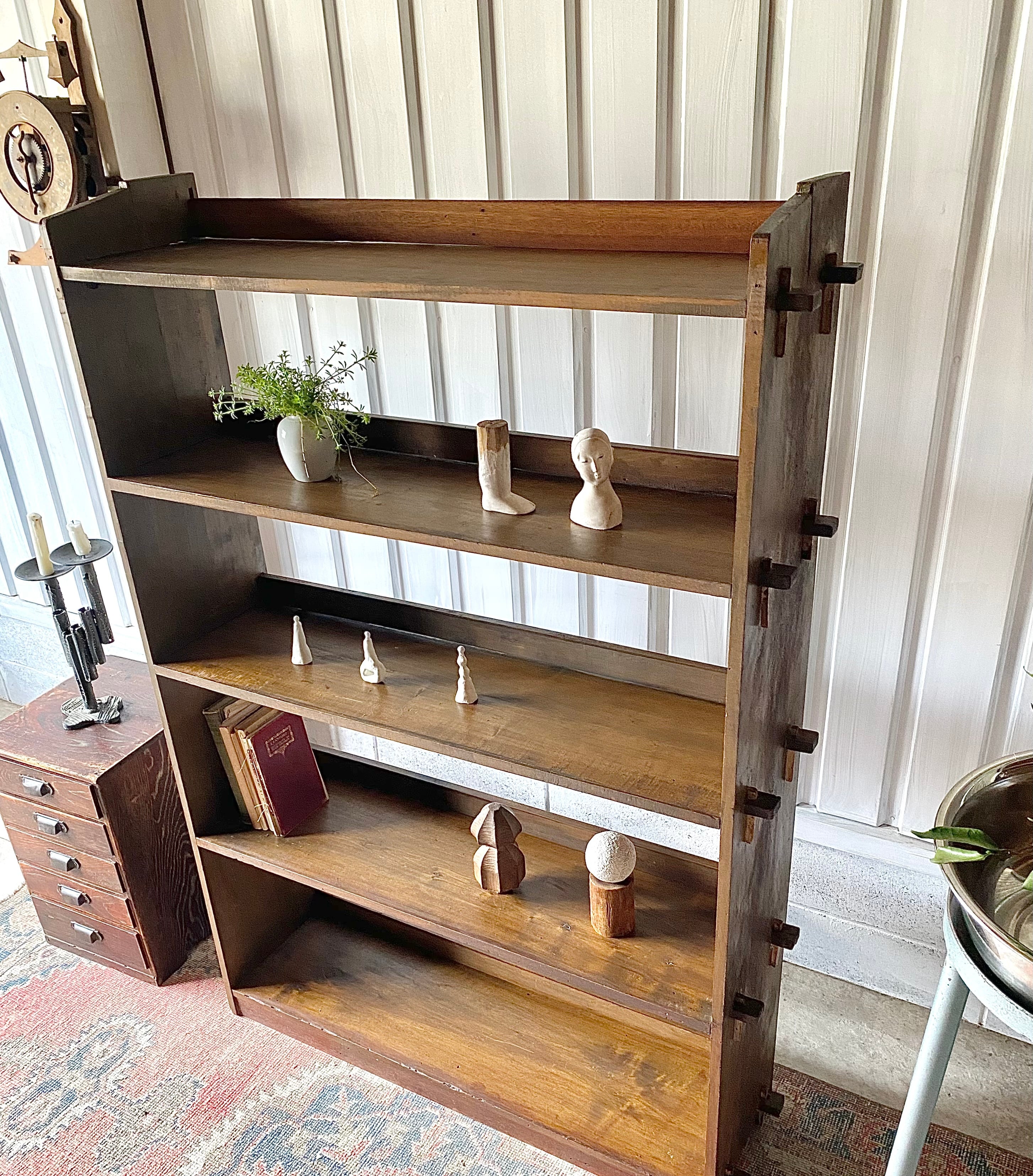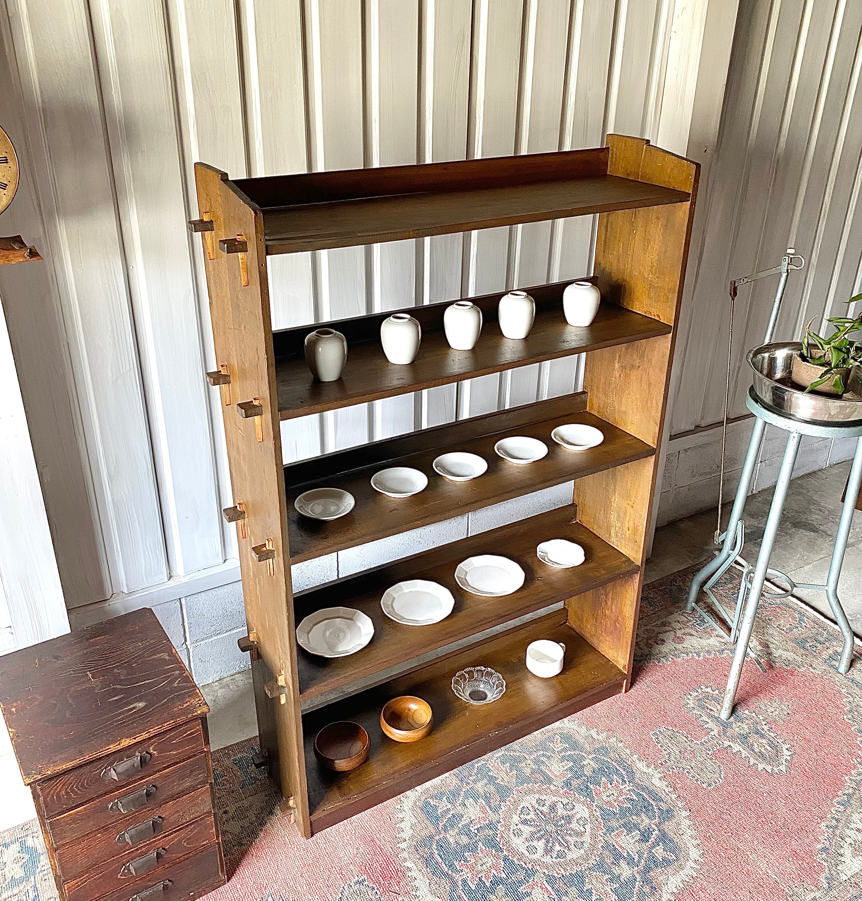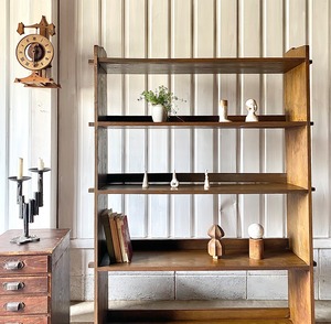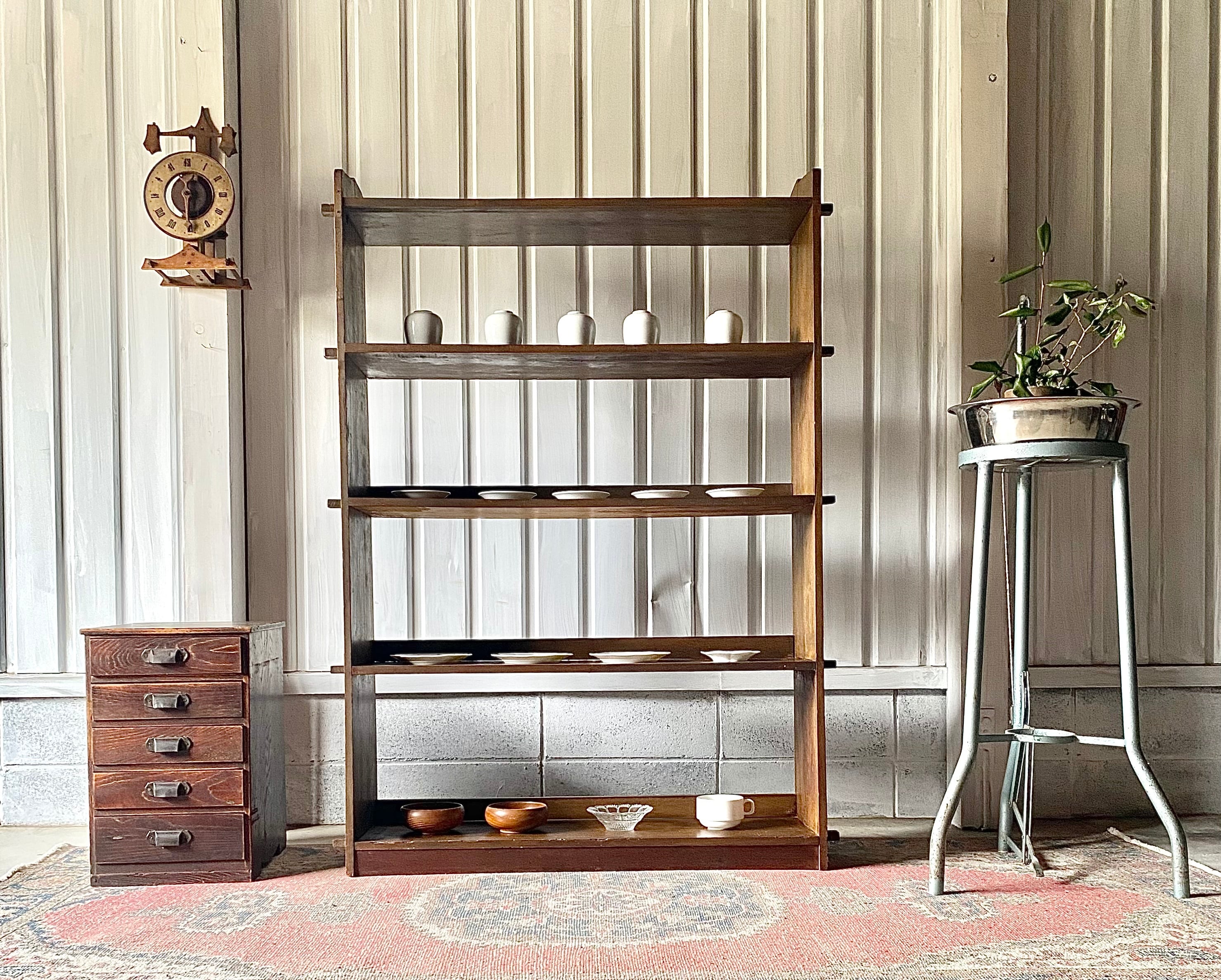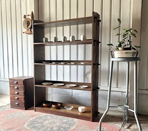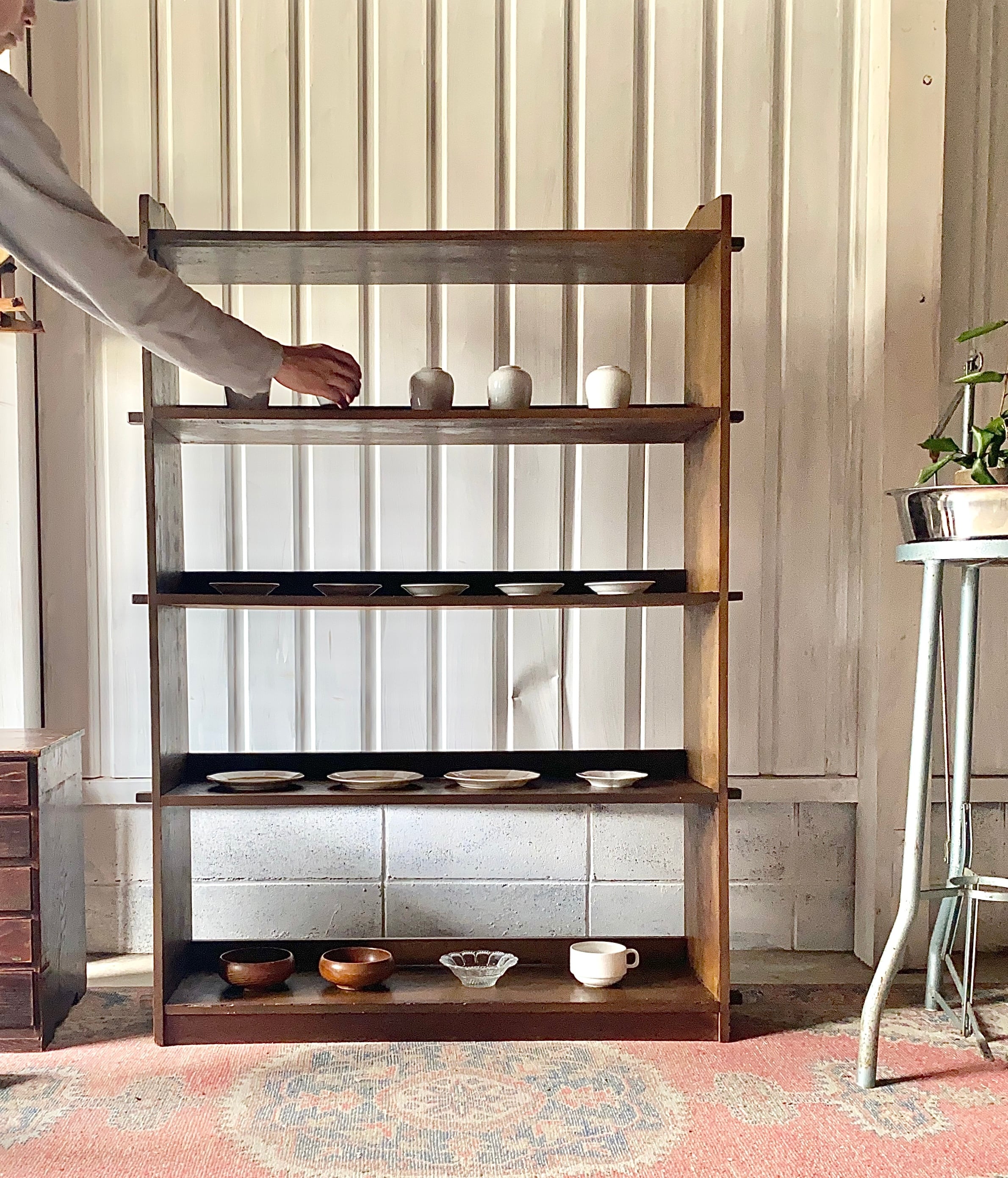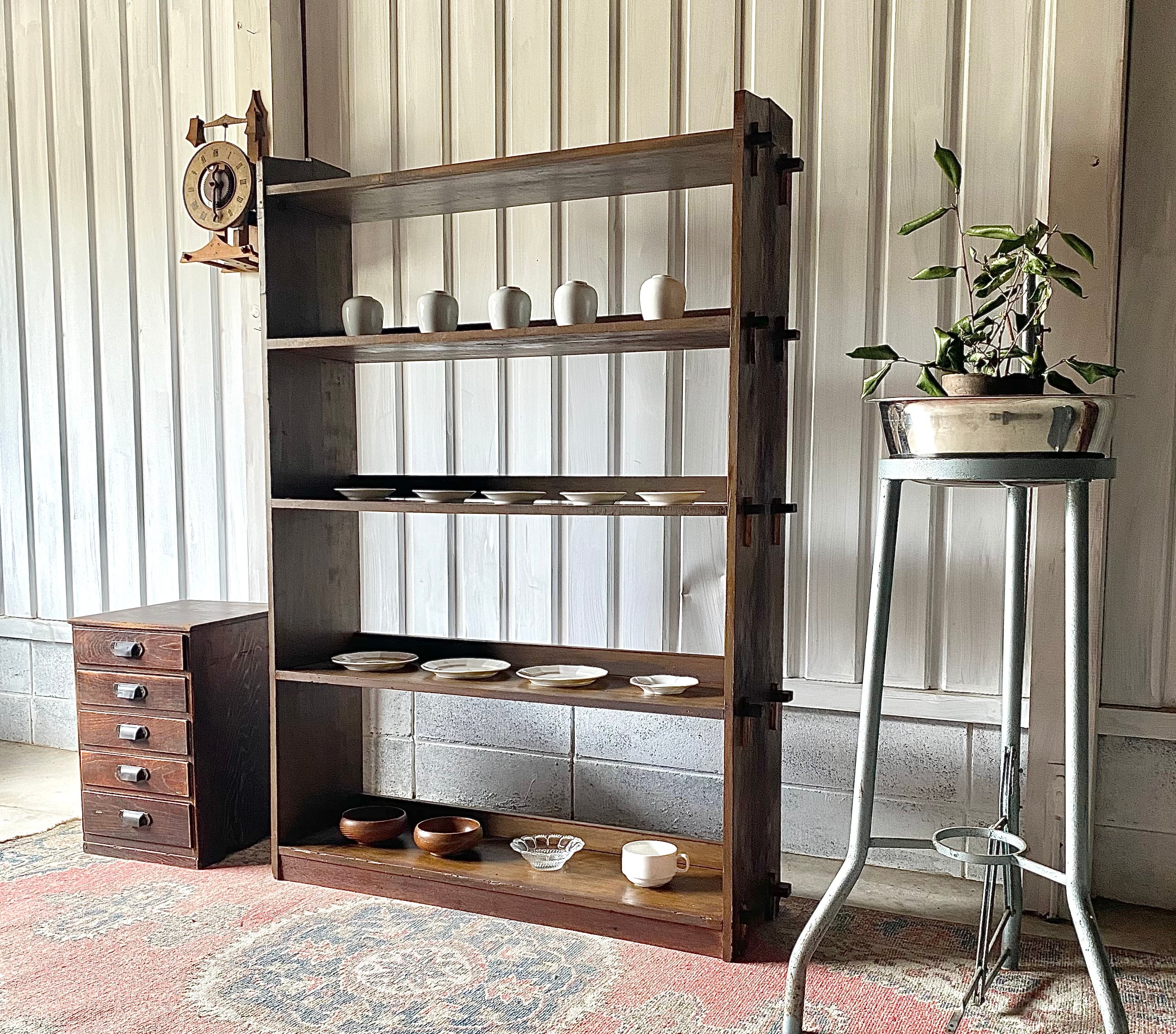 経年変化の味のある木肌、堂々とした佇まいが頼もしい楔棚。釘を使わず楔で組み立てられたしっかりとした造りの棚です。キッチンやリビング、趣味部屋などでお気に入りの食器や小物、植物をディスプレイしながら収納すると目に見える景色が楽しくそうです。