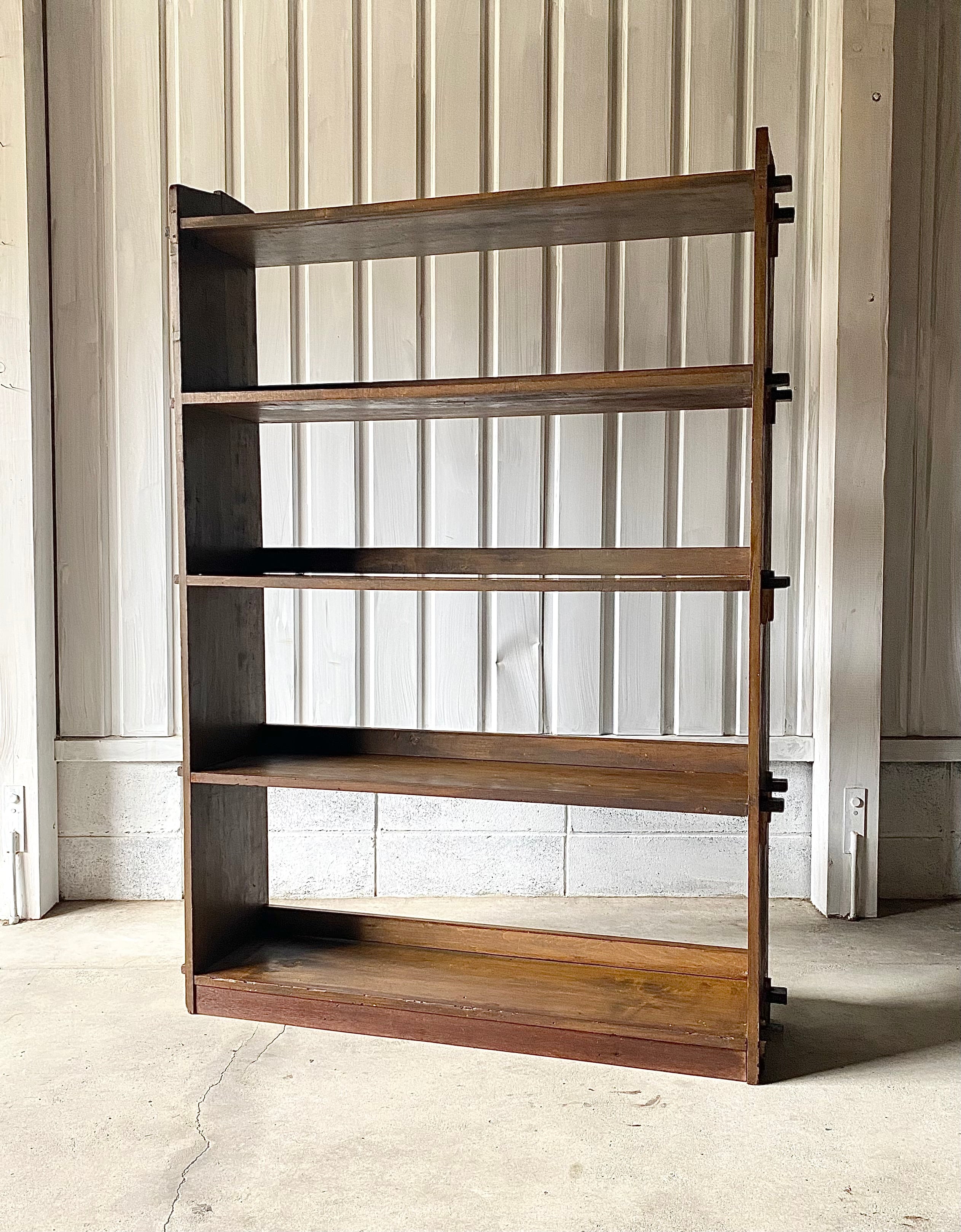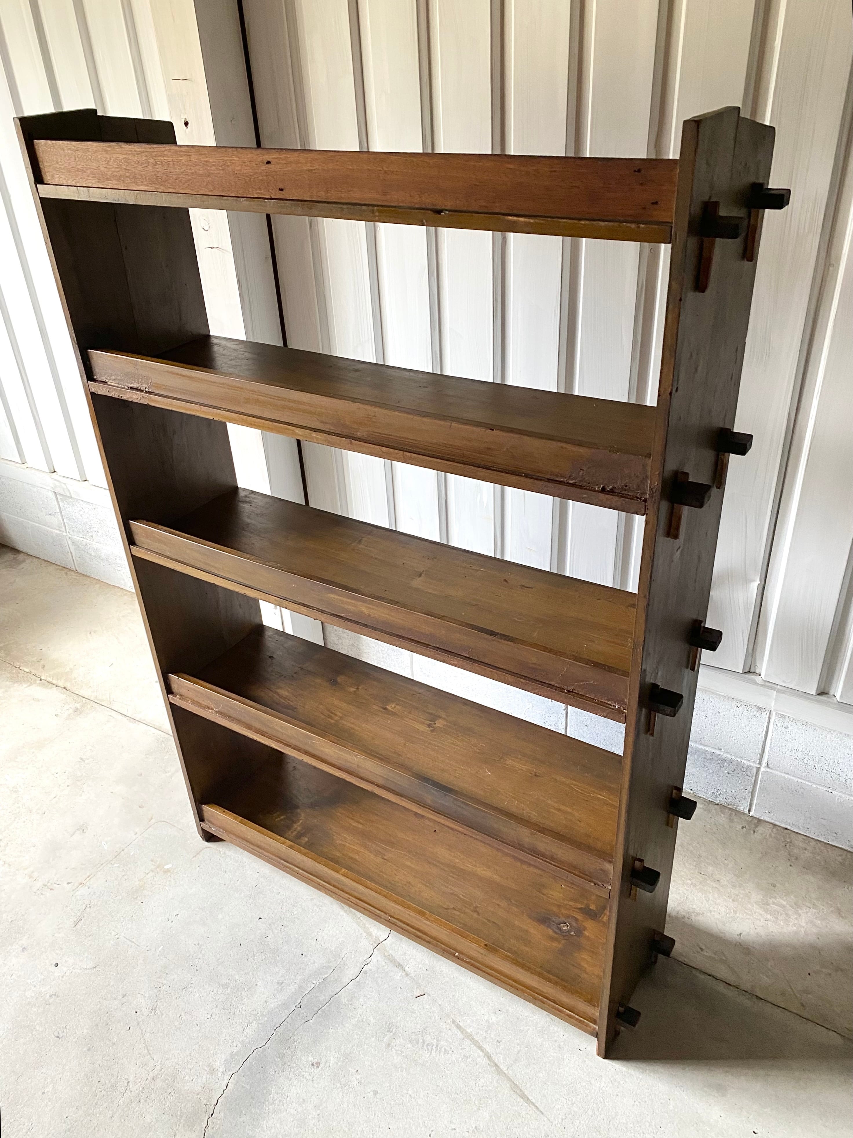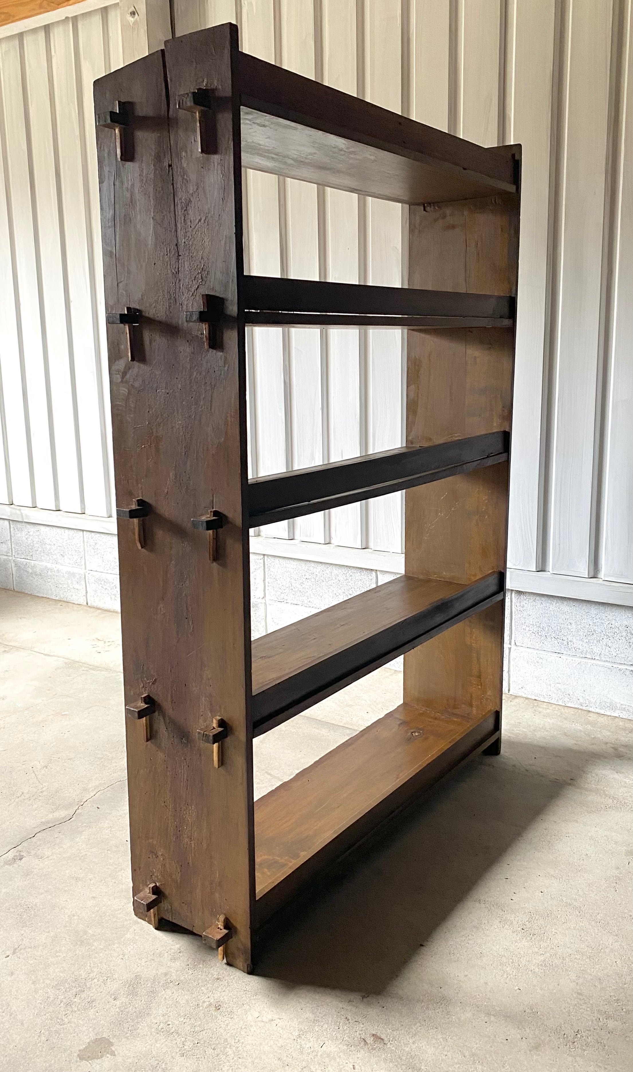 古い楔棚になります。スレや欠け、当たりキズ、禿げ、虫食いによる少しの木屑、隙間、落としきれない汚れなどがあります。少しのぐらつきはありますが、全体的に状態も良いのでまだまだ実用的に活躍してくれます。