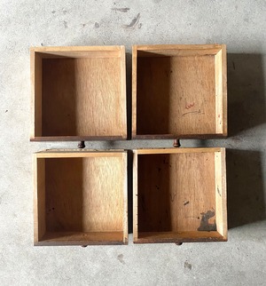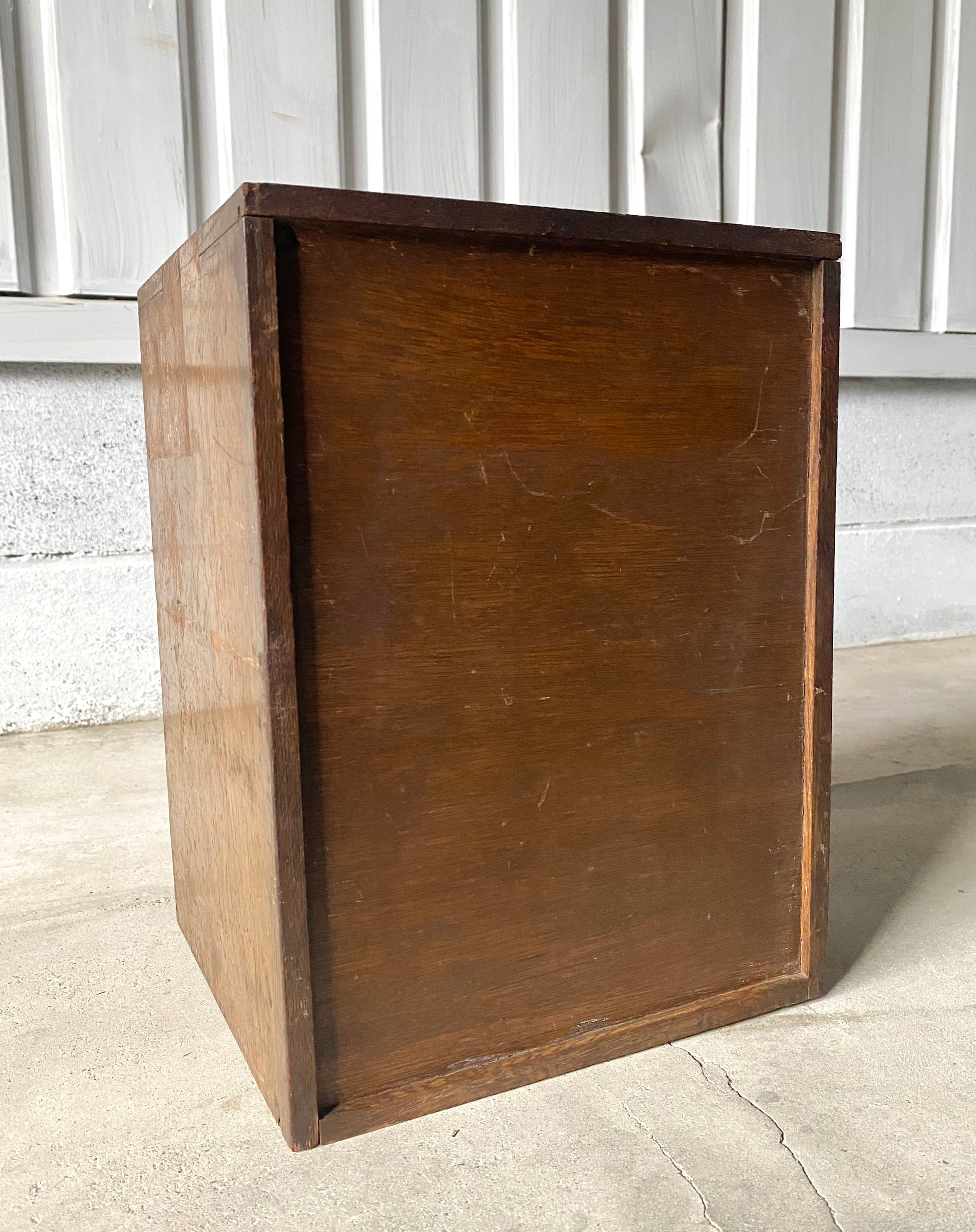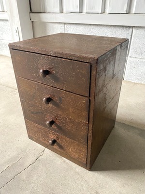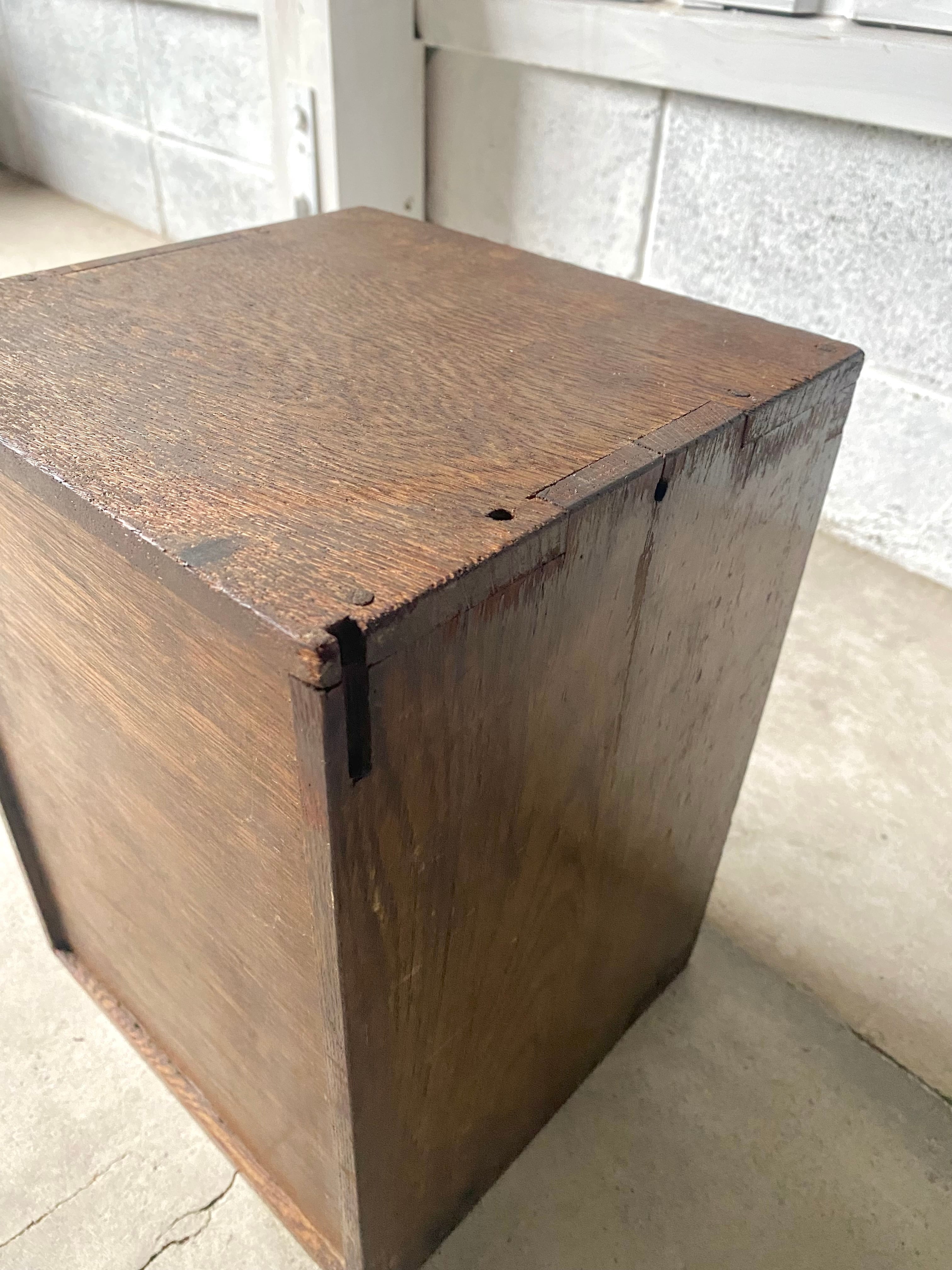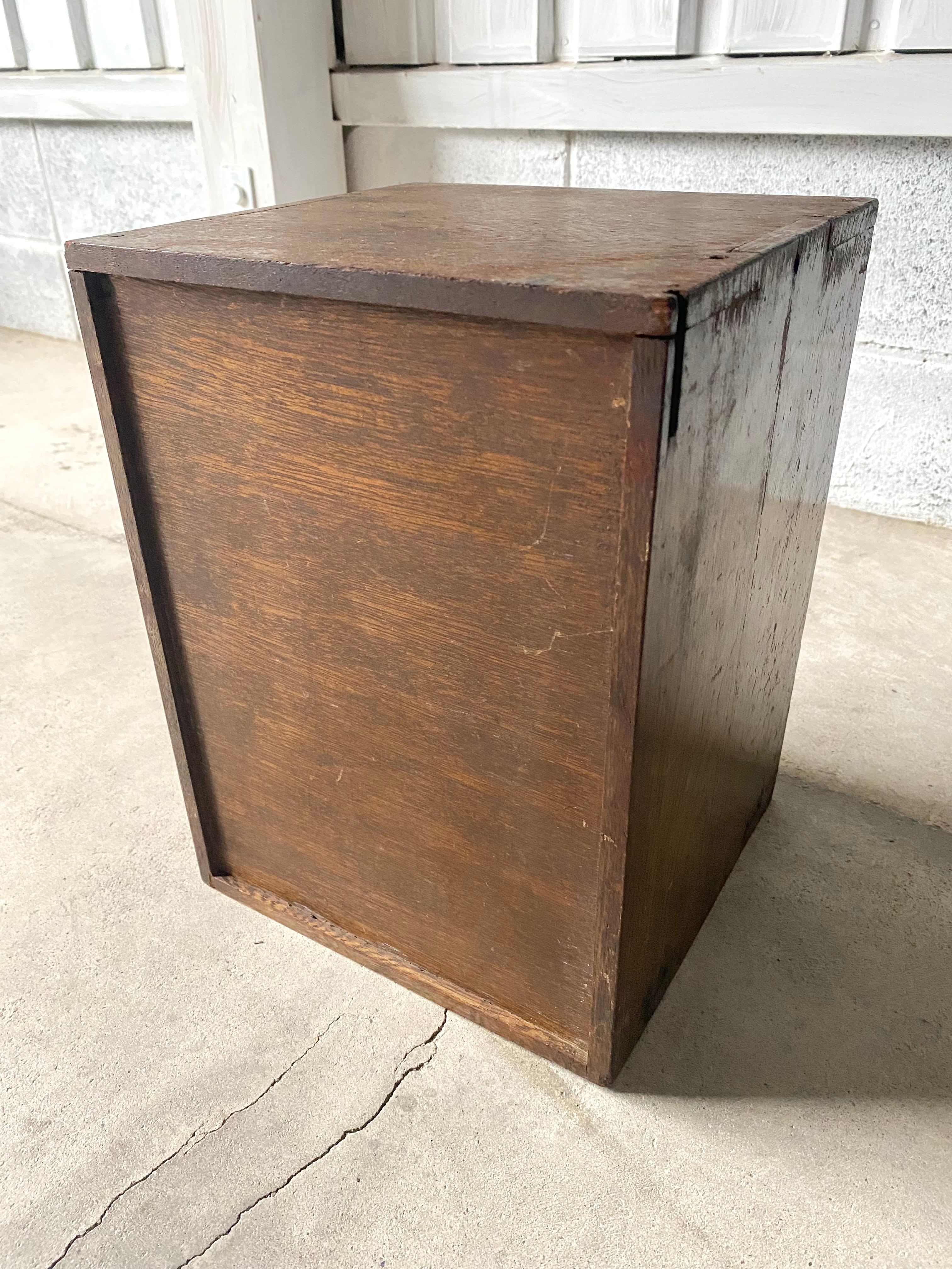 古い小引き出しになります。スレや欠け、当たりキズ、禿げ、隙間、落としきれない汚れなどがあります。引出しの開閉はスムーズに行えます。全体的に状態も良いのでまだまだ実用的に活躍してくれます。