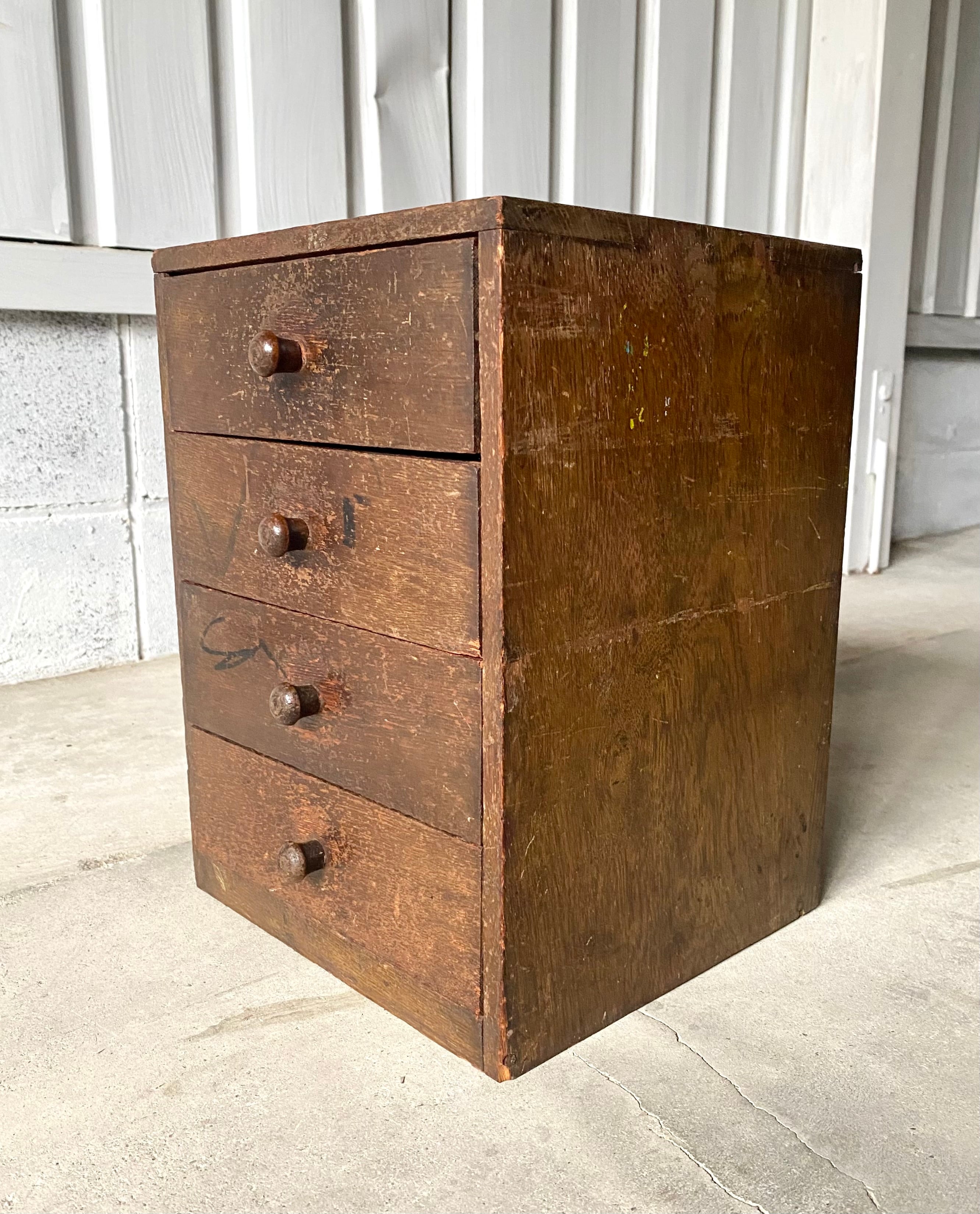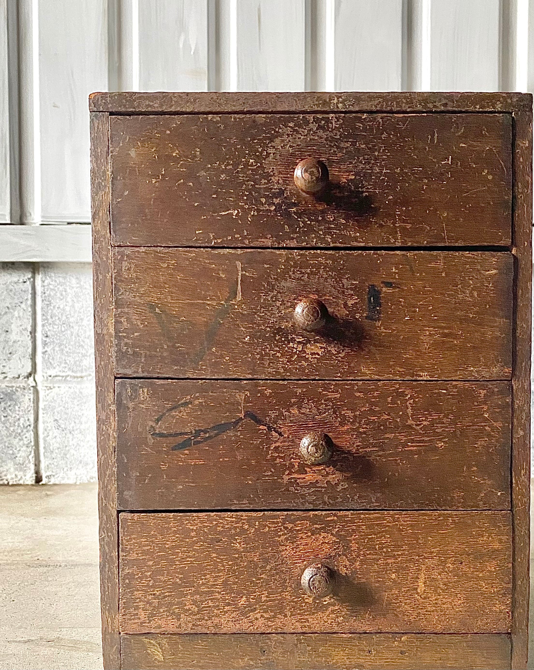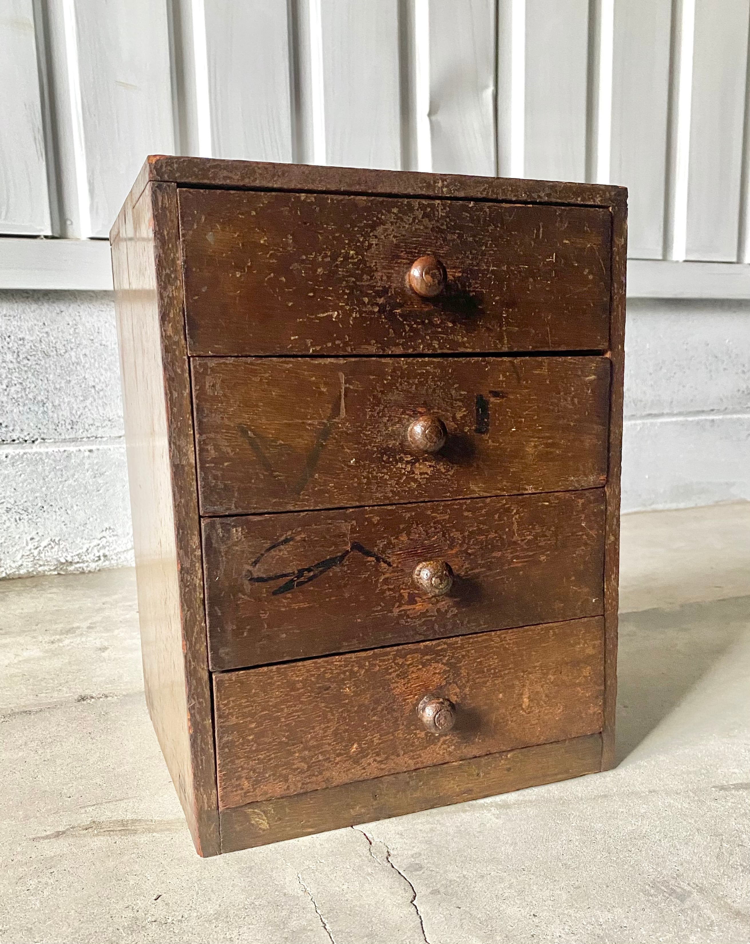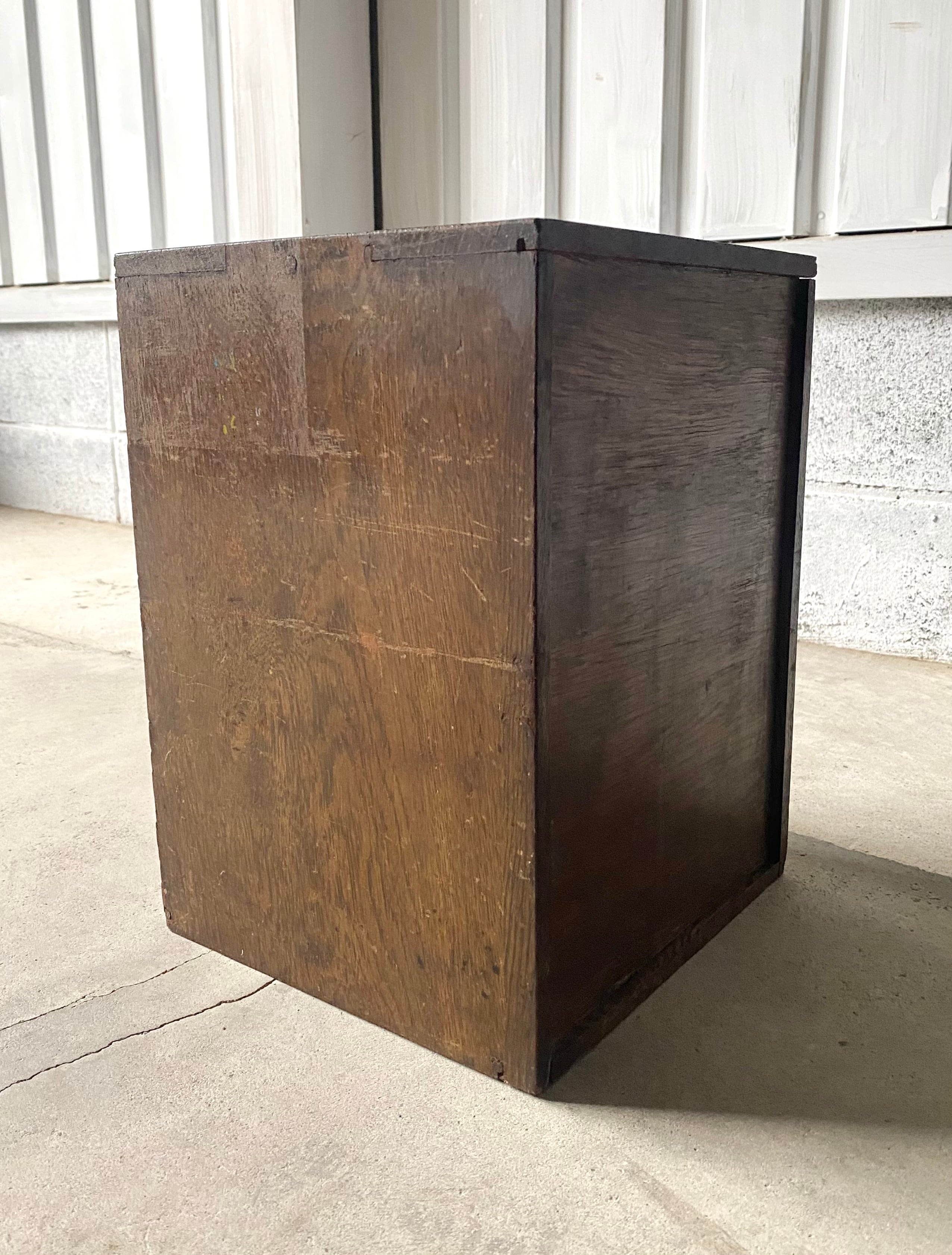 古い小引き出しになります。スレや欠け、当たりキズ、禿げ、隙間、落としきれない汚れなどがあります。引出しの開閉はスムーズに行えます。全体的に状態も良いのでまだまだ実用的に活躍してくれます。