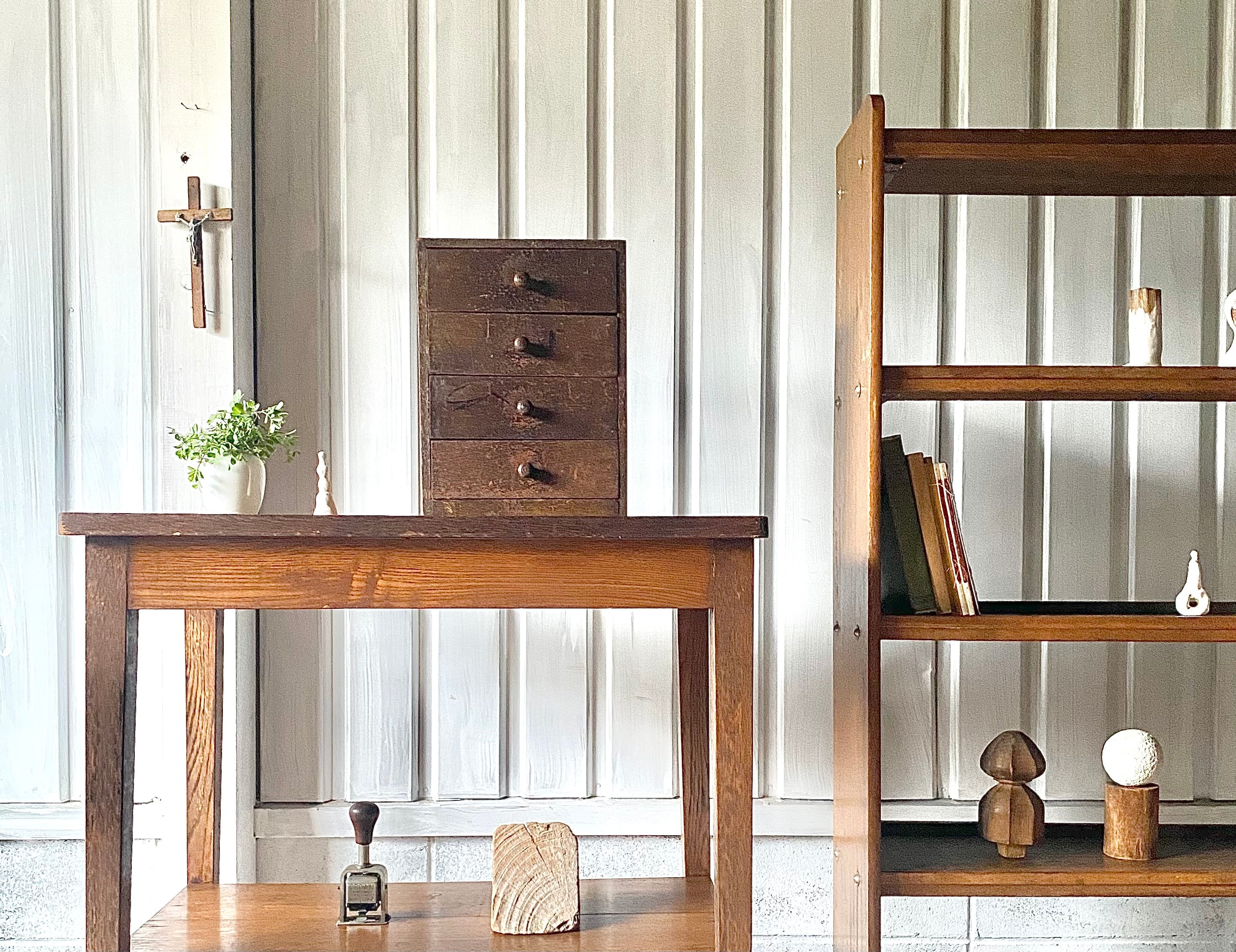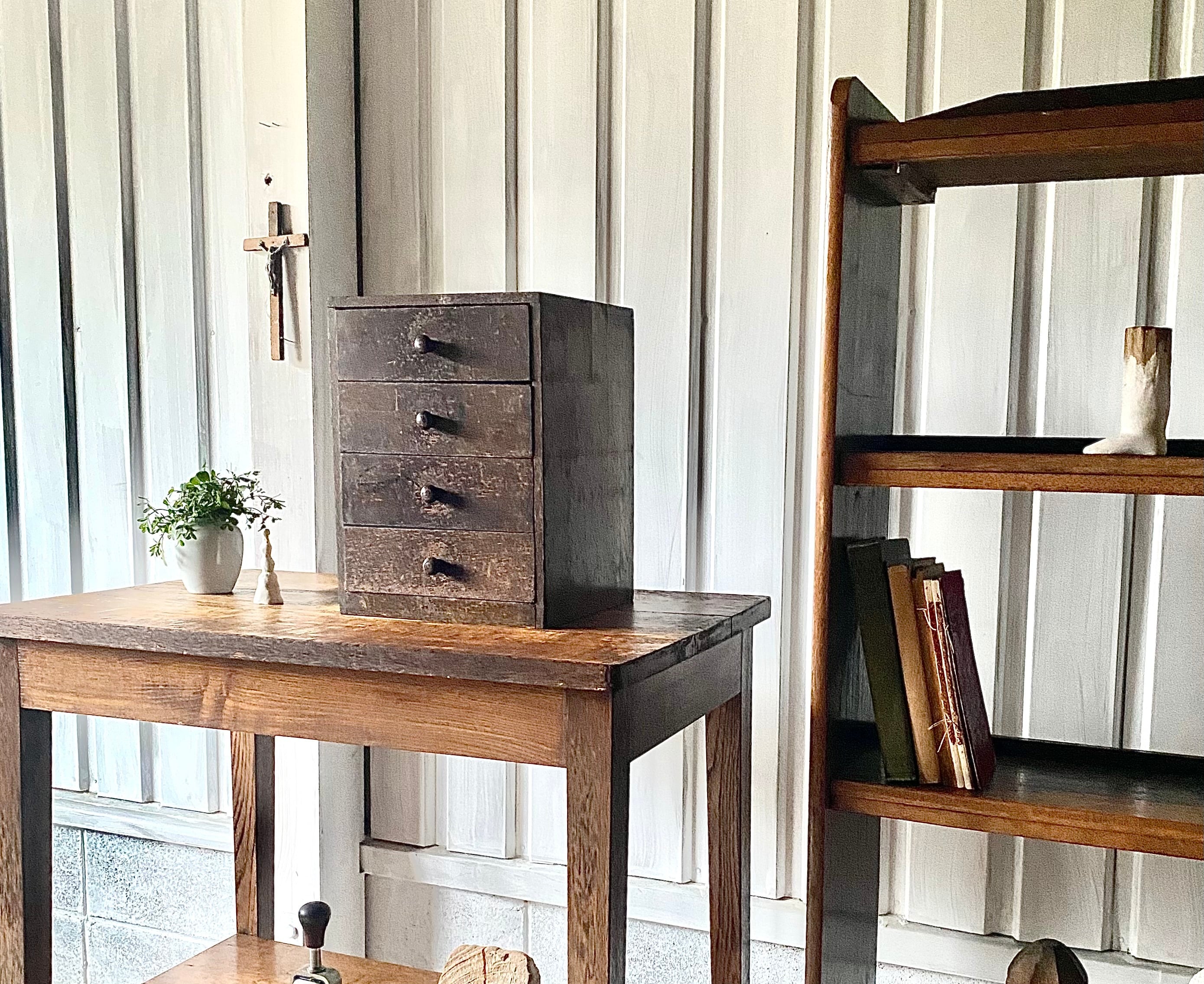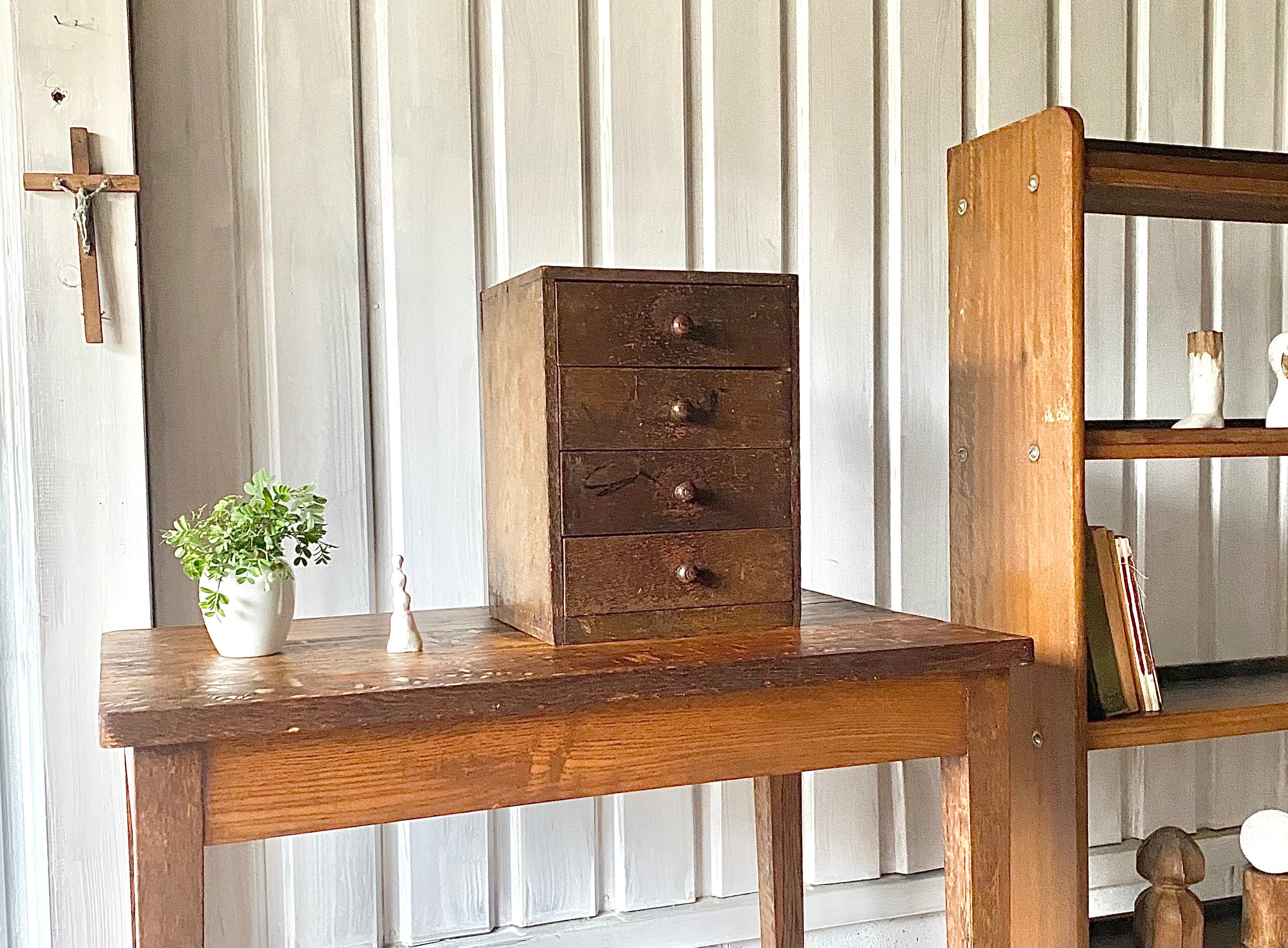 経年変化の味のある木肌と木製取手、小振りなサイズ感が可愛らしい小引出し。引出しの開閉はスムーズに行えます。お部屋の卓上やカウンター上、棚上に置いて、細々した物やパーツ、ステーショナリーの収納としても感じ良いです。