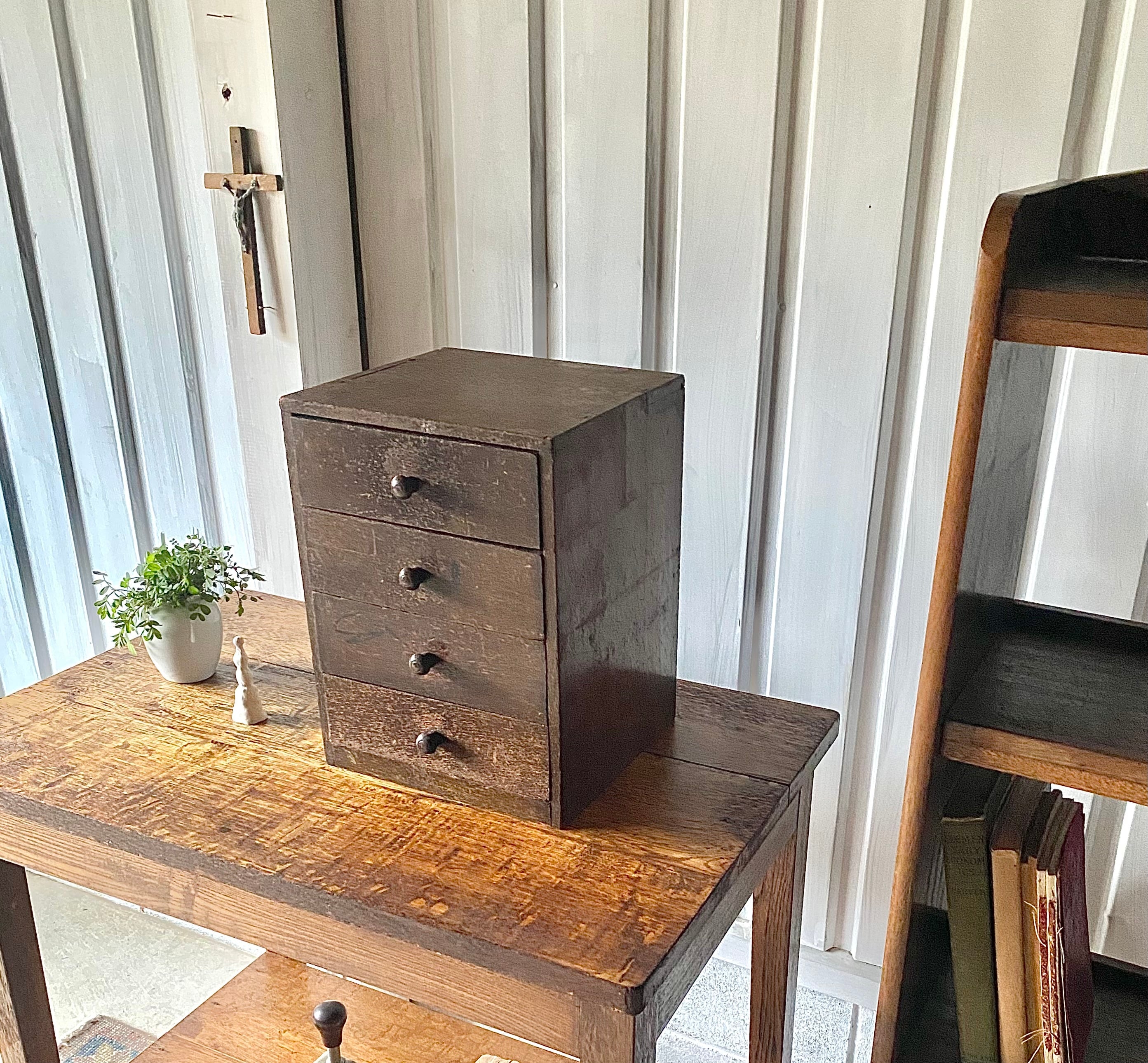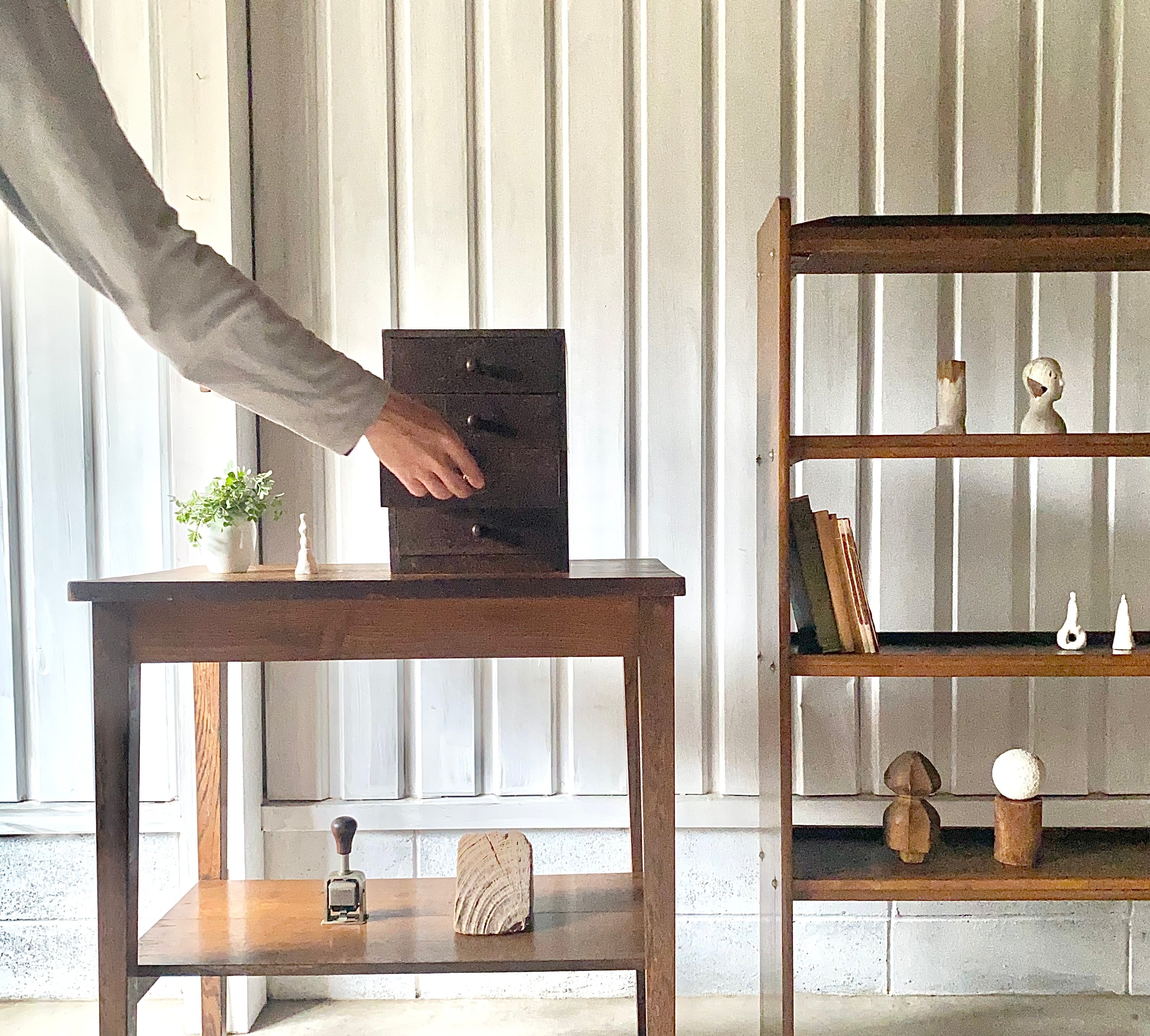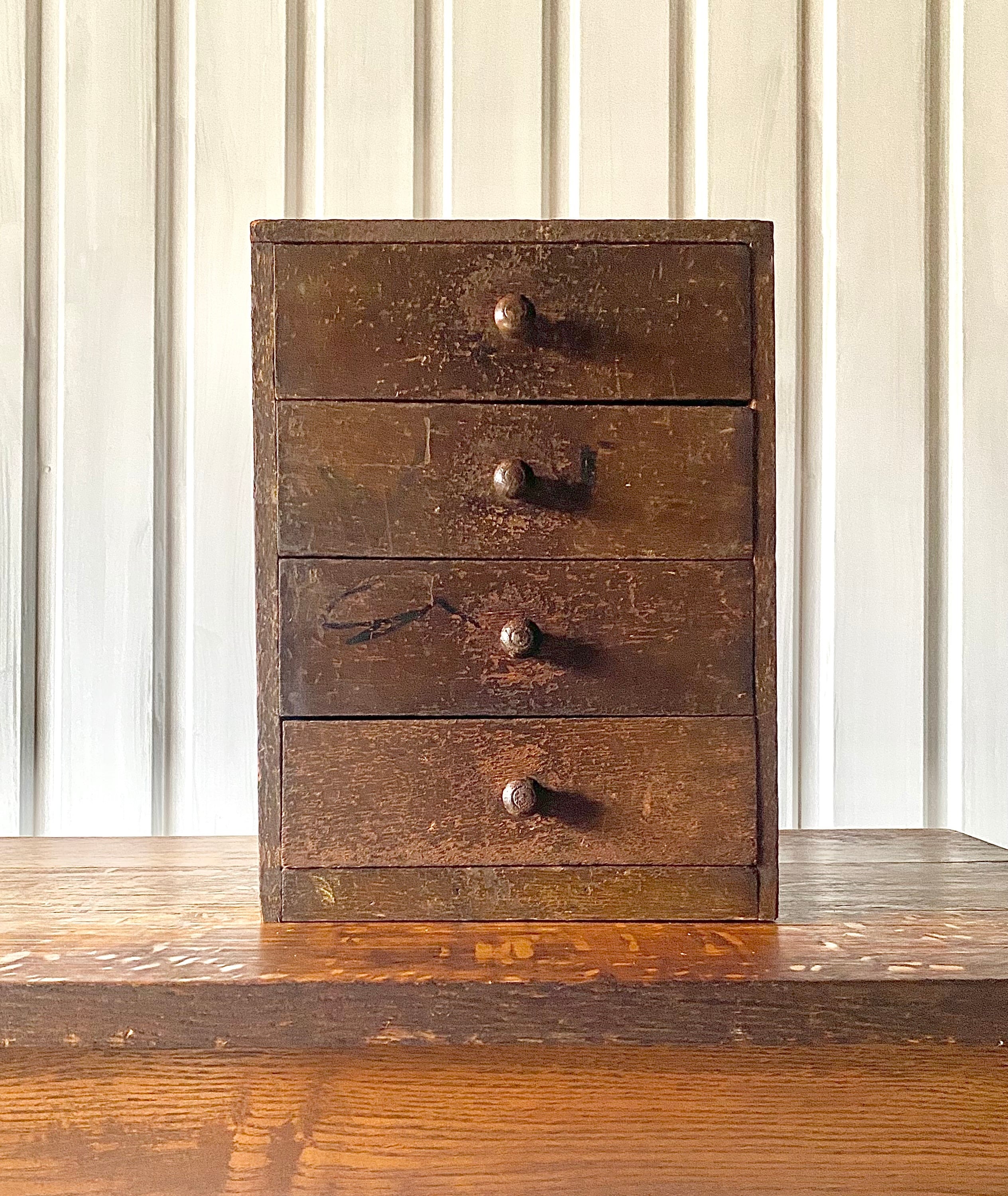 経年変化の味のある木肌と木製取手、小振りなサイズ感が可愛らしい小引出し。引出しの開閉はスムーズに行えます。お部屋の卓上やカウンター上、棚上に置いて、細々した物やパーツ、ステーショナリーの収納としても感じ良いです。