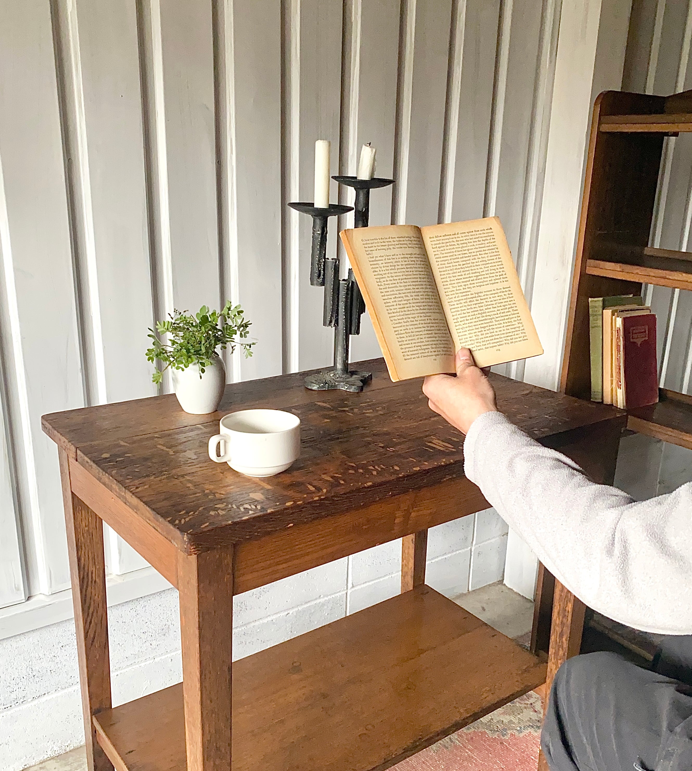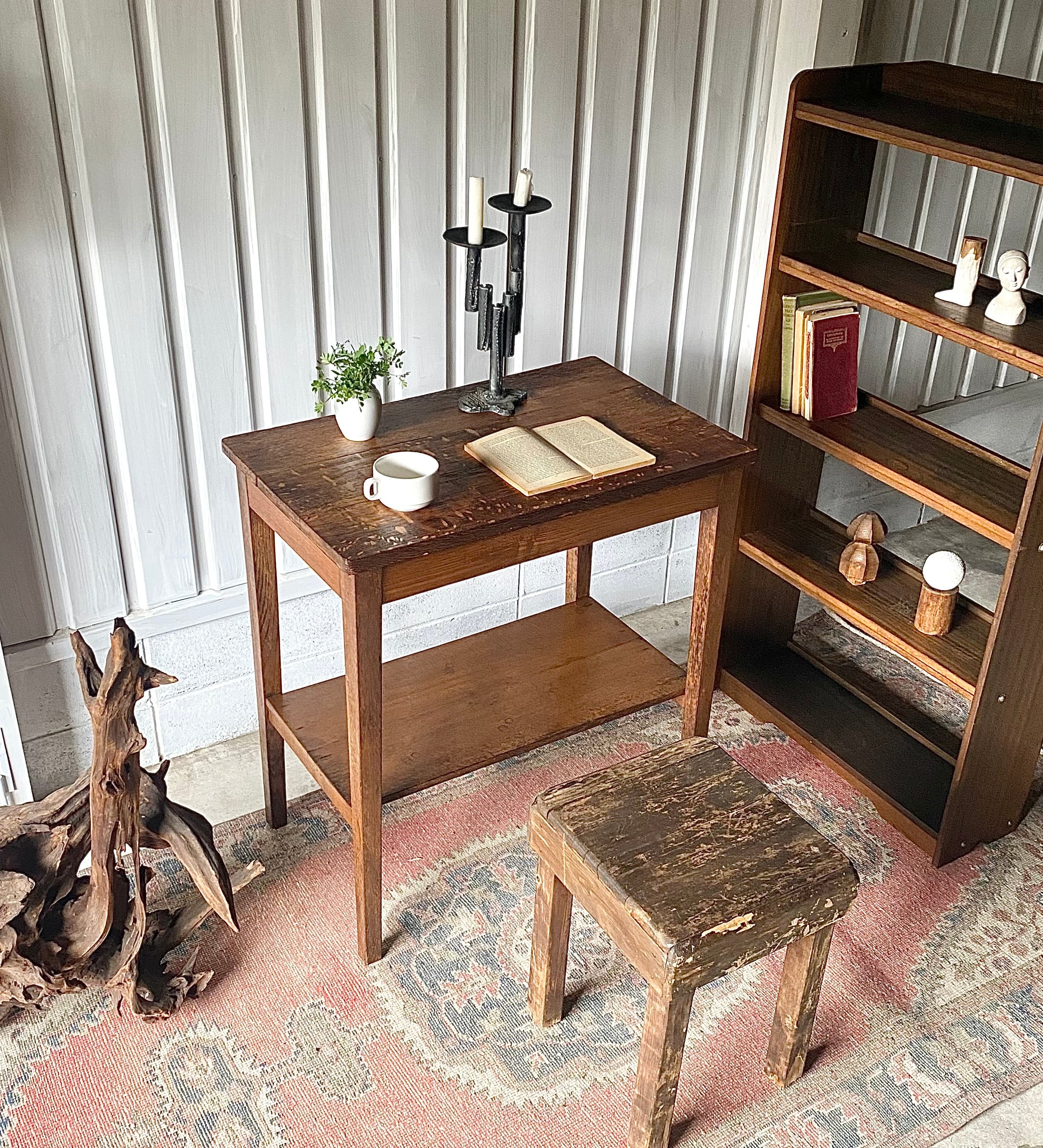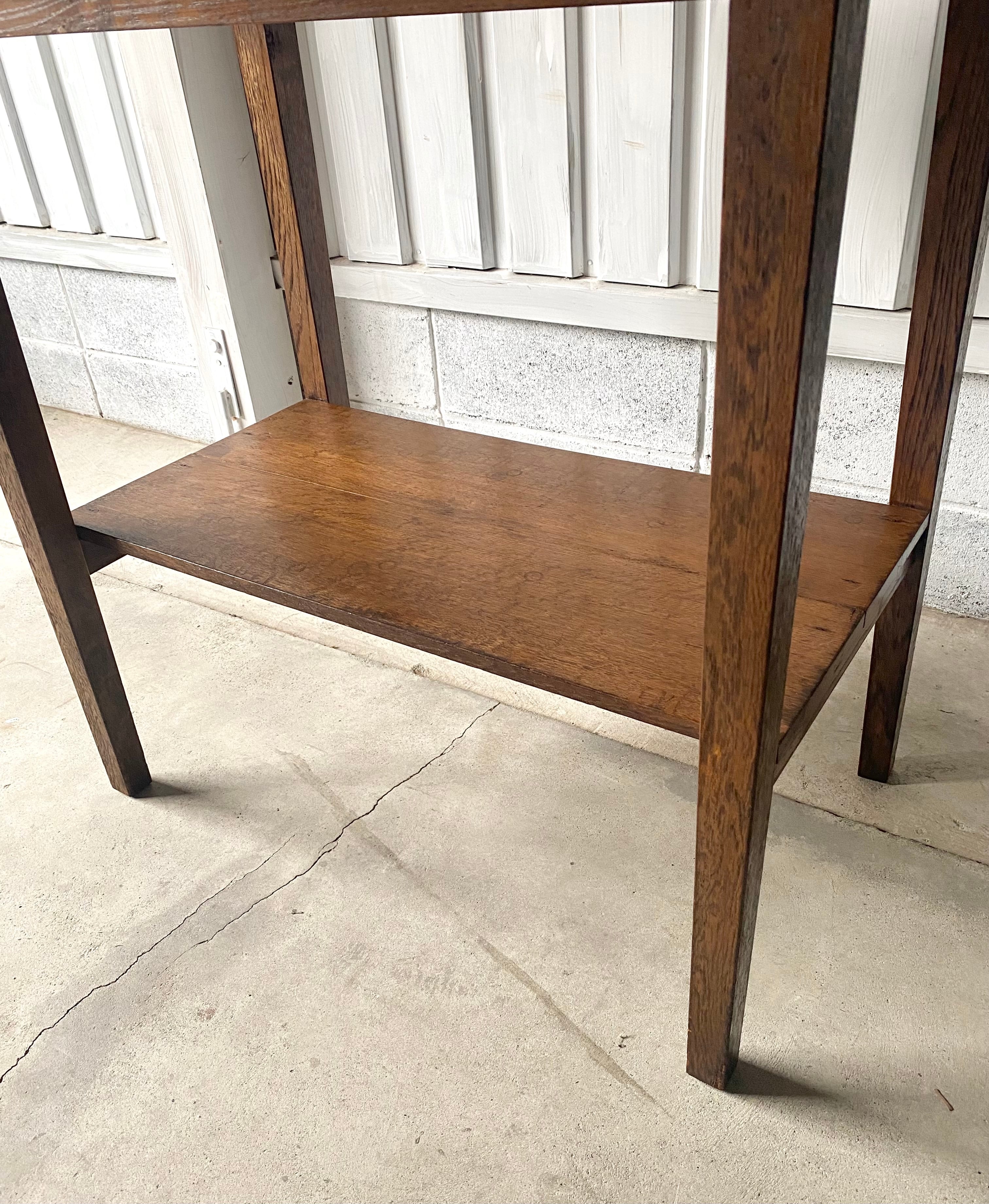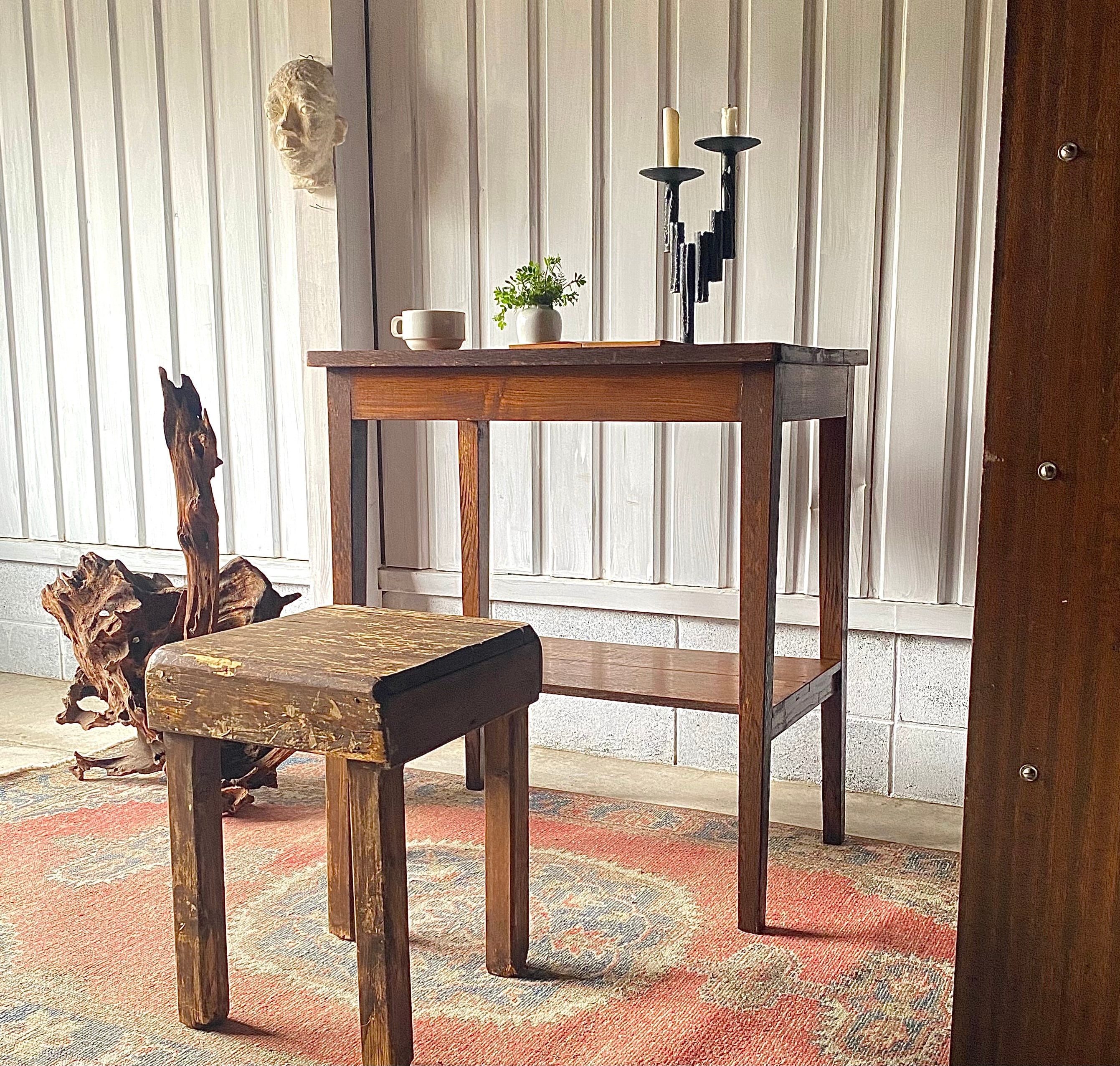 経年変化の雰囲気ある佇まい、すらっとした脚が綺麗なテーブル。天板下にはオープンラックがあり使い勝手も良いです。実用使いでパソコン作業や書物をする作業テーブルとしてや、お気に入りのコレクションや植物を飾る台としても素敵です。