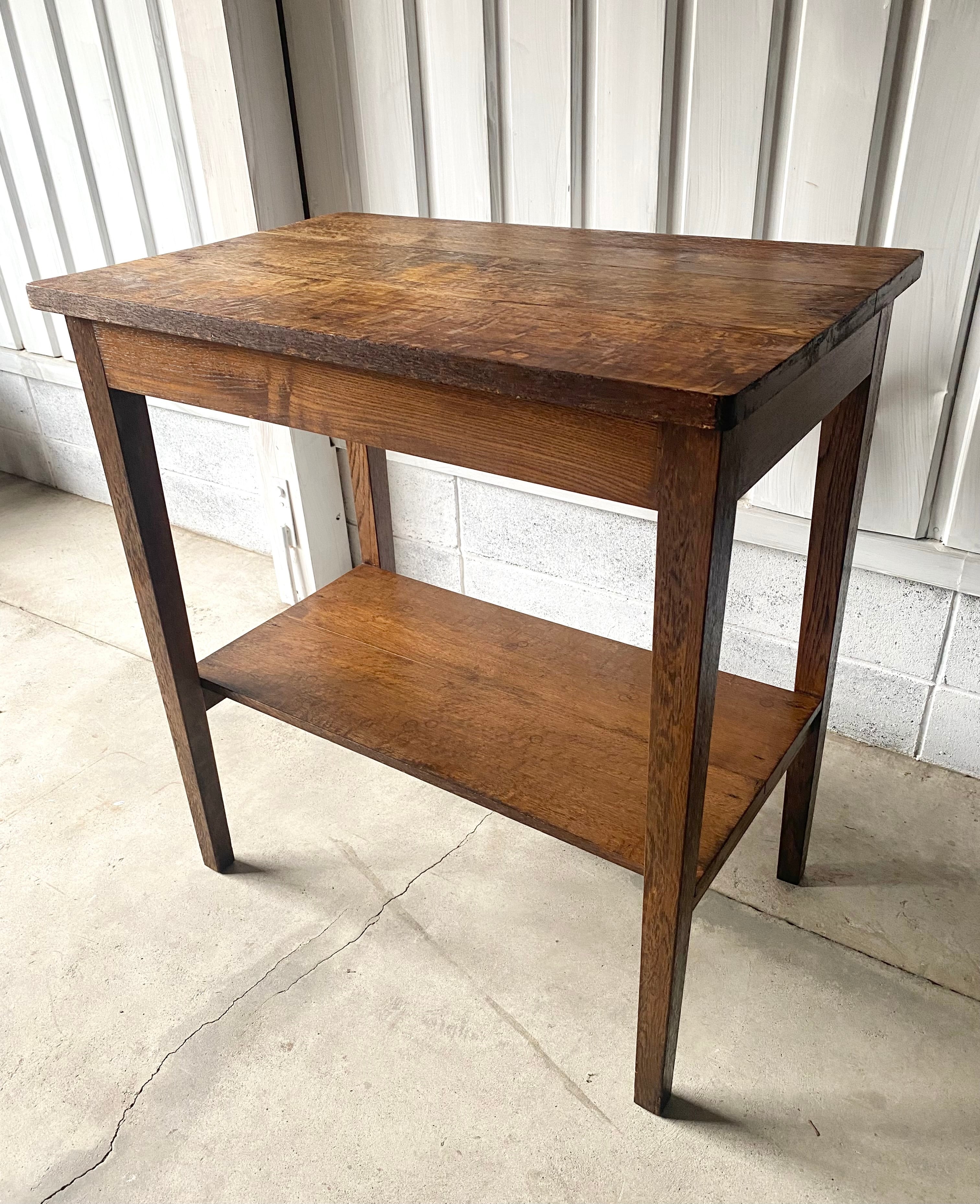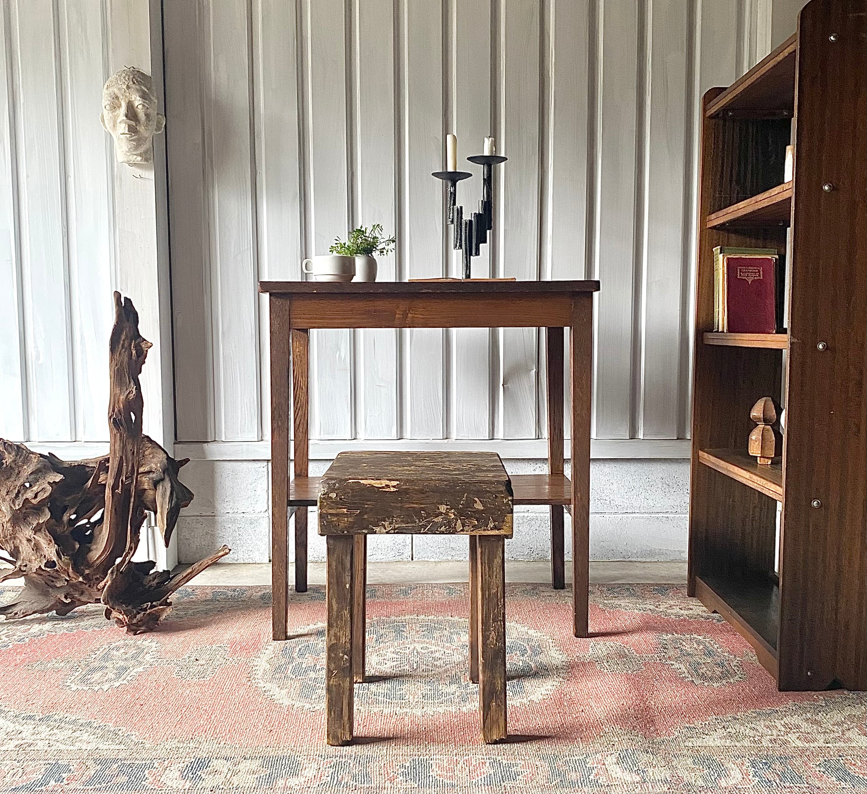古い木製テーブルになります。スレや欠け、当たりキズ、禿げ、落としきれない汚れなどがあります。少しのがたつきはありますが、全体的に状態も良いのでまだまだ実用的に活躍してくれます。