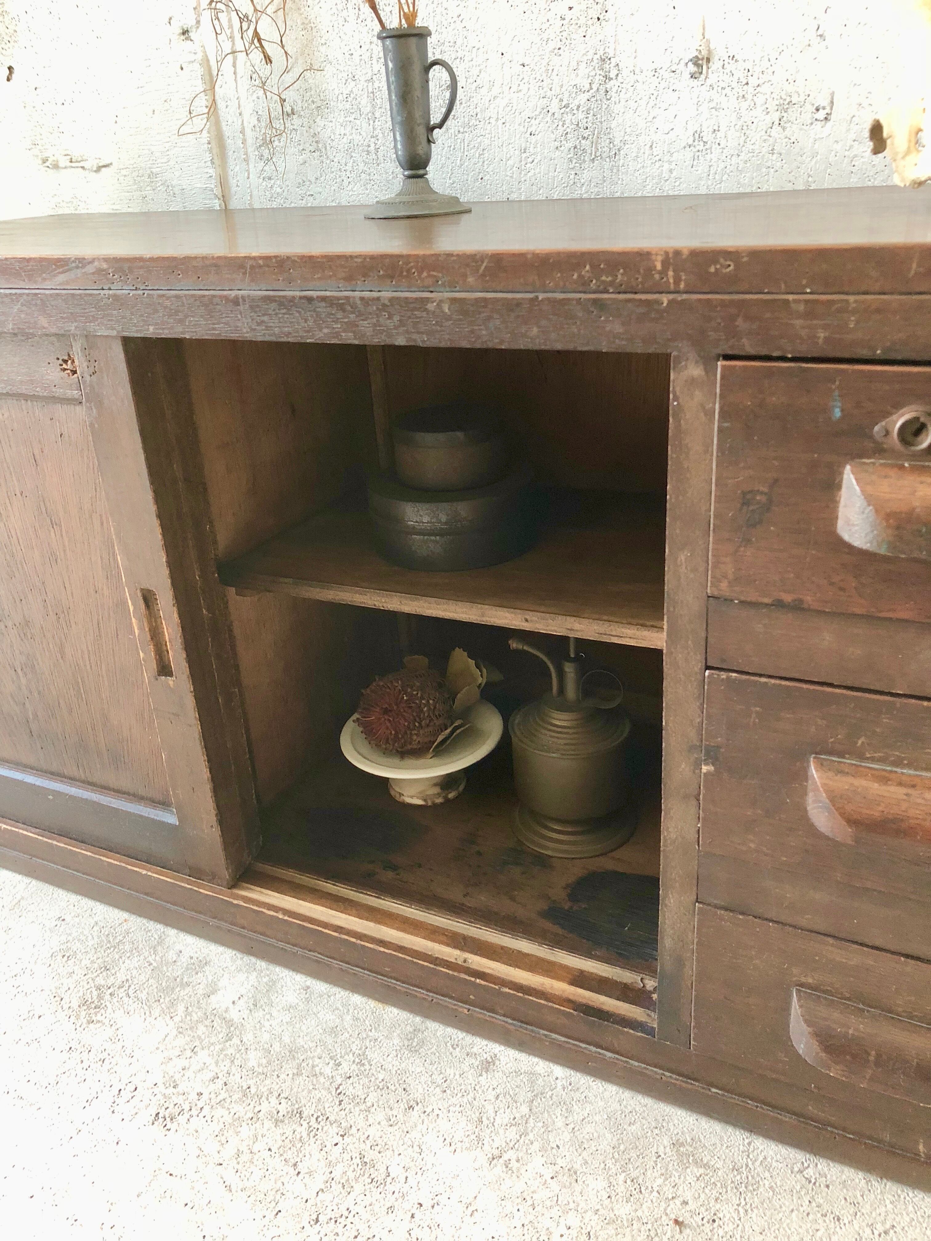 経年変化の良い木肌と味のある取手が魅力的な収納棚。収納力もたっぷりで使い勝手も良いです。引戸、引出しの開閉も比較的スムーズに行え、日常気軽にお使いいただけます。キッチンで小皿などの食器のストック棚としてや、リビングで本や小物などの整理棚としてや、テレビボードとしても素敵にお使い頂けそうです。