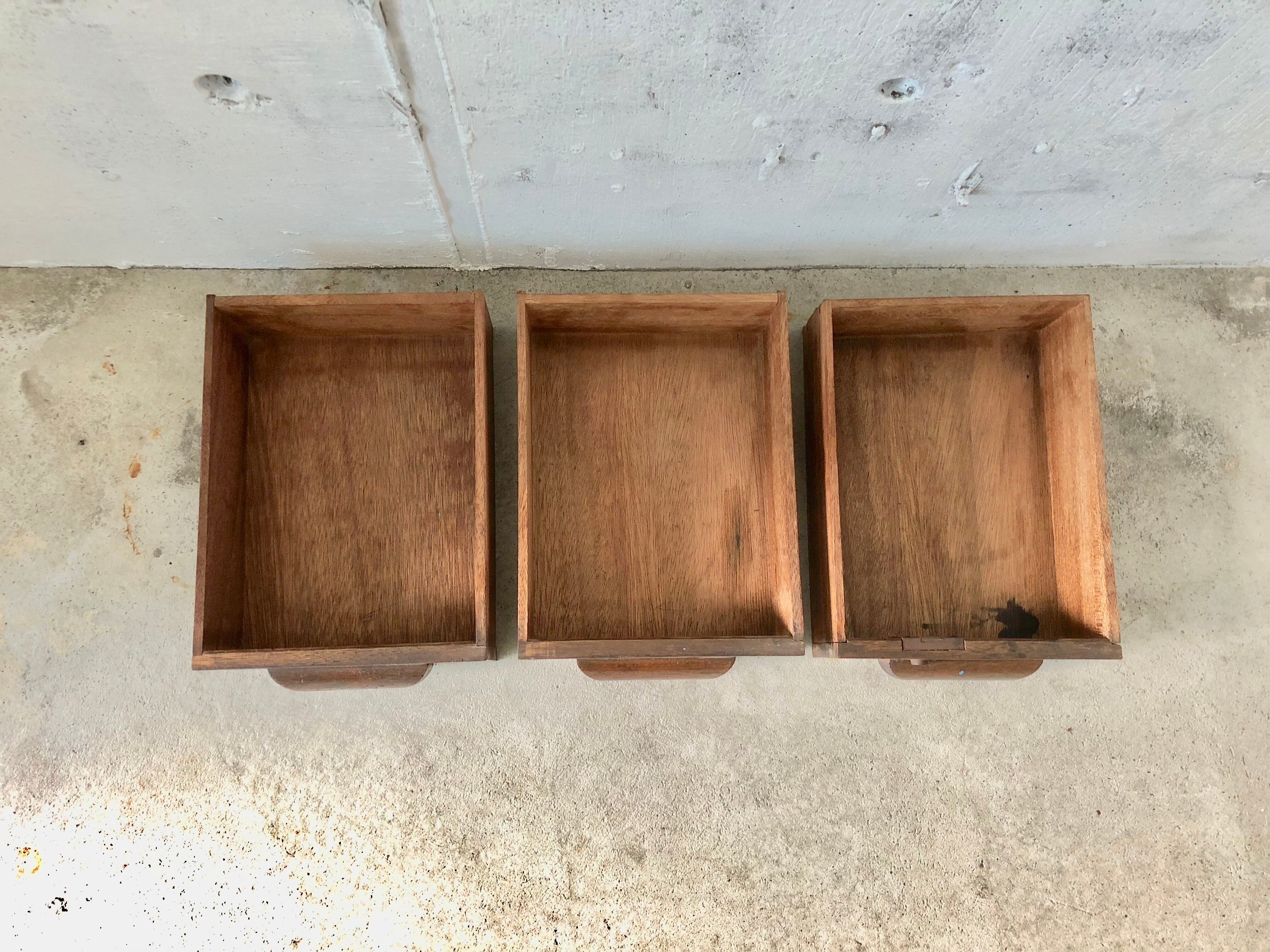 古い収納棚になりますので、スレや剥げ、当たりキズ、割れ、欠け、落としきれない汚れなどがあります。引出し中は少し汚れがありますが、開閉は比較的スムーズに行え、日常気軽にお使いいただけます。全体的に状態も良いのでまだまだ実用的に活躍してくれます。