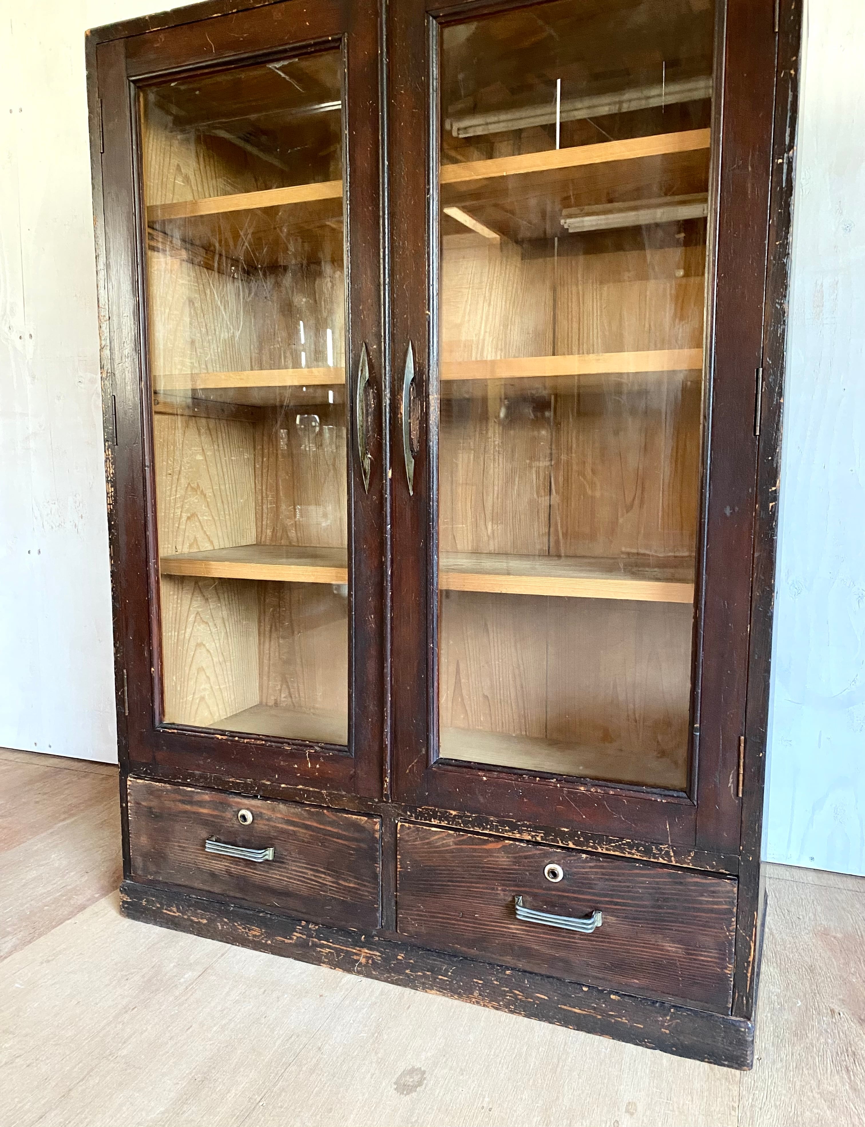 古いキャビネットなります。スレや剥げ、反り、割れ、サビ、隙間、当たりキズ、落としきれない汚れなどがあります。特に目立つガラスの割れはなく、扉、引出しの開閉はスムーズに行えます。全体的に状態も良く、まだまだ実用的に活躍してくれます。