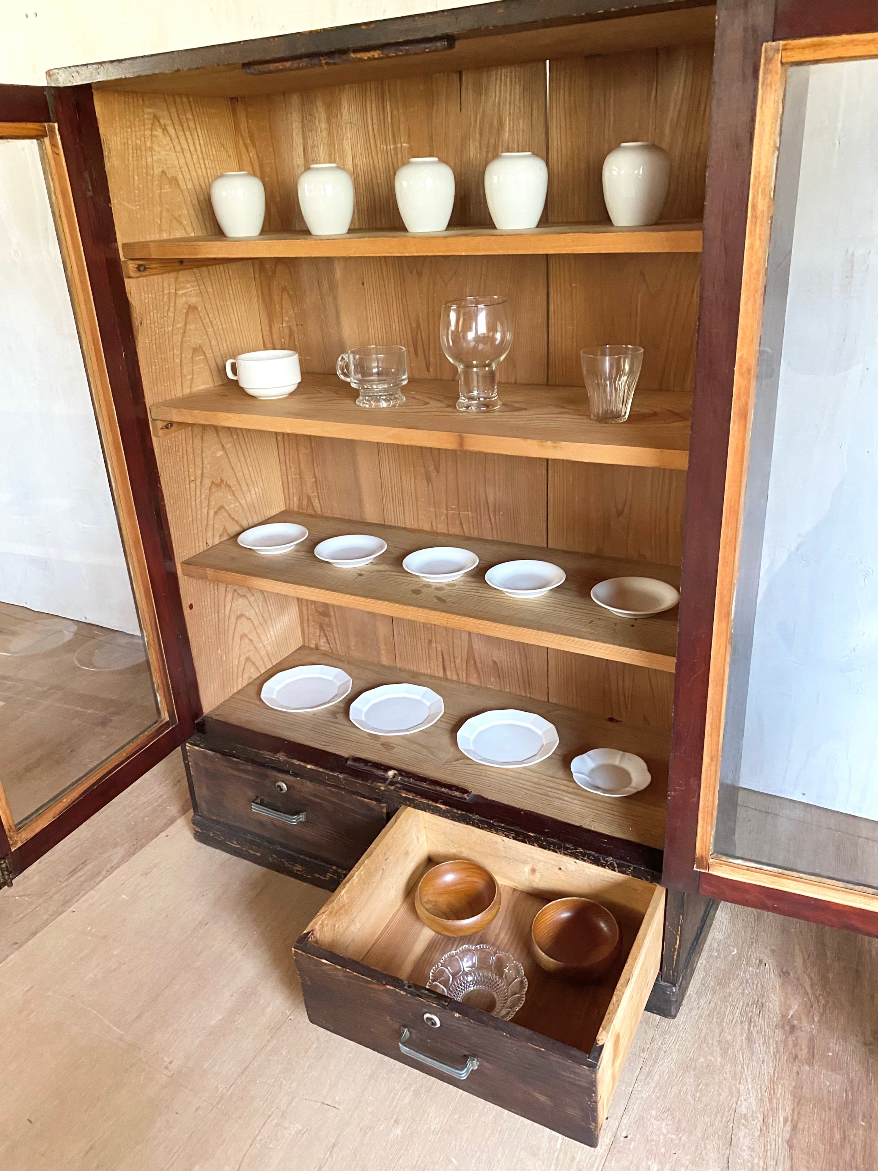 経年変化の雰囲気ある木肌と味のある取手、上品な佇まいのキャビネット。キッチンで食器棚としてや、リビングや趣味部屋、アトリエでお気に入りの本や小物を見せながら収納すると素敵な空間が演出出来そうです。
