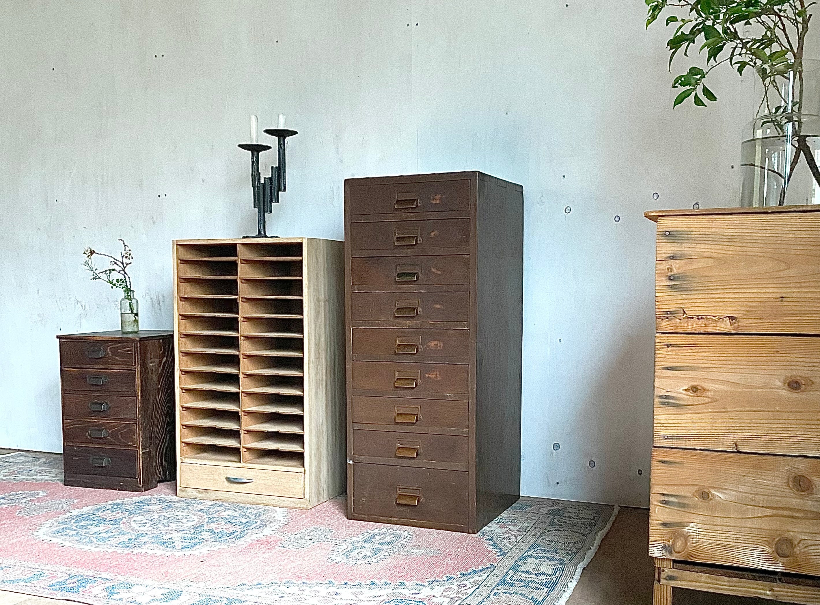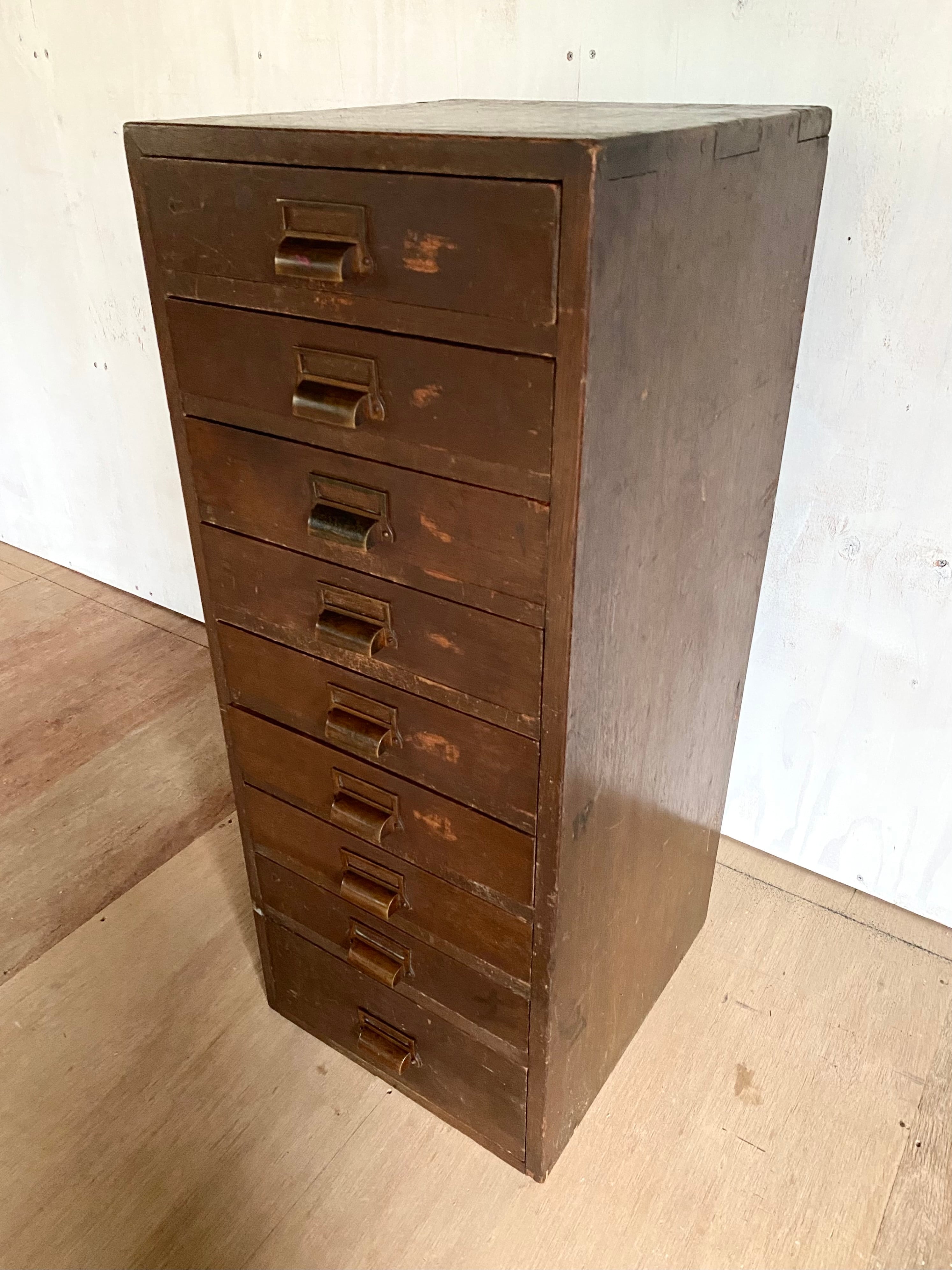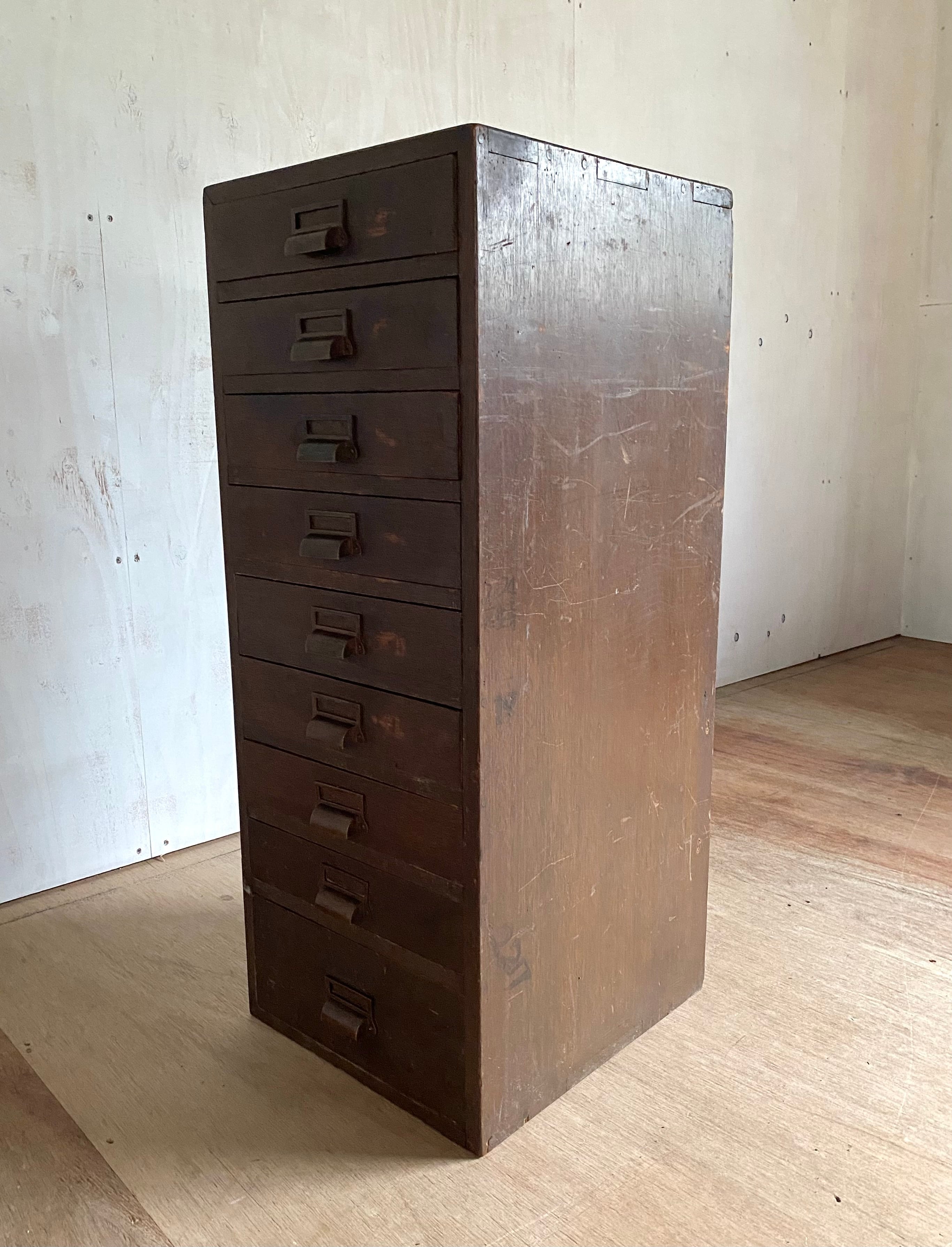 経年変化の落ち着きある佇まい、9杯の引出しが綺麗に整列した収納棚。味のある取手でネームプレートも付いていて仕分けにも便利です。リビングやアトリエで小物やパーツ、紙物の収納としてや、キッチンでお皿やコップの収納としても素敵です。