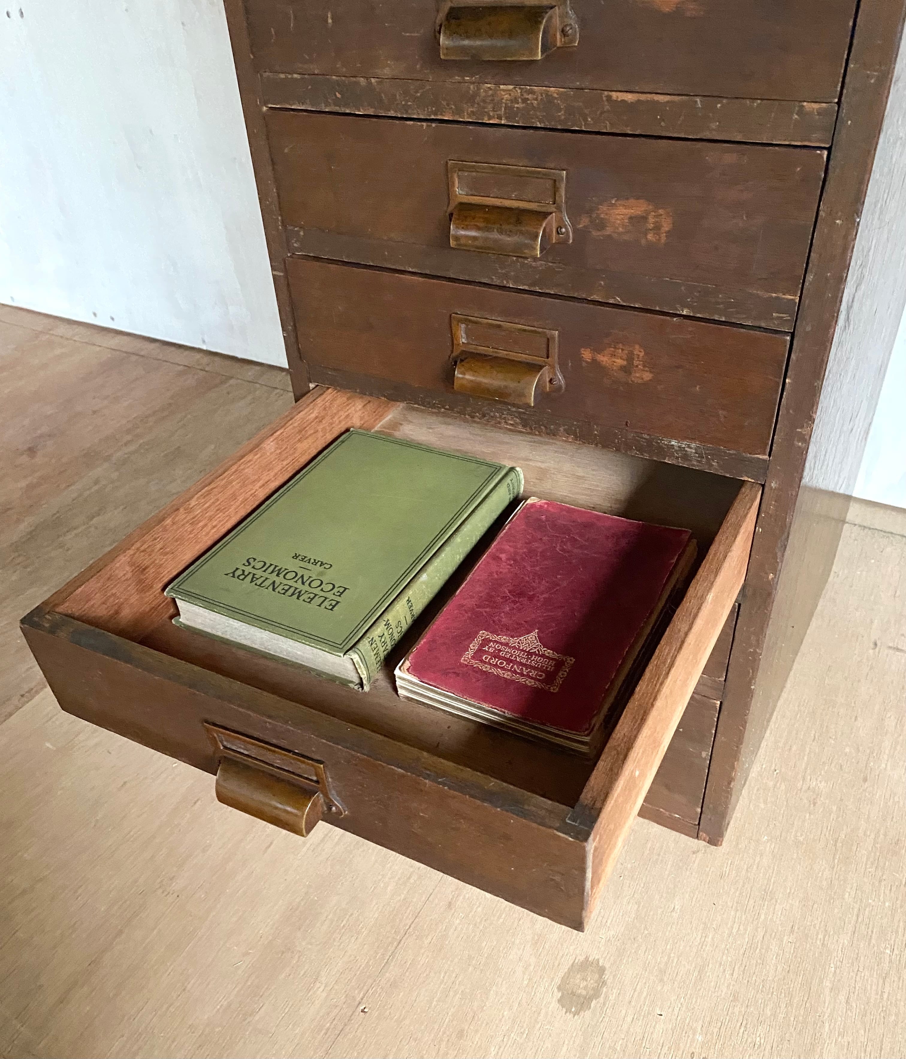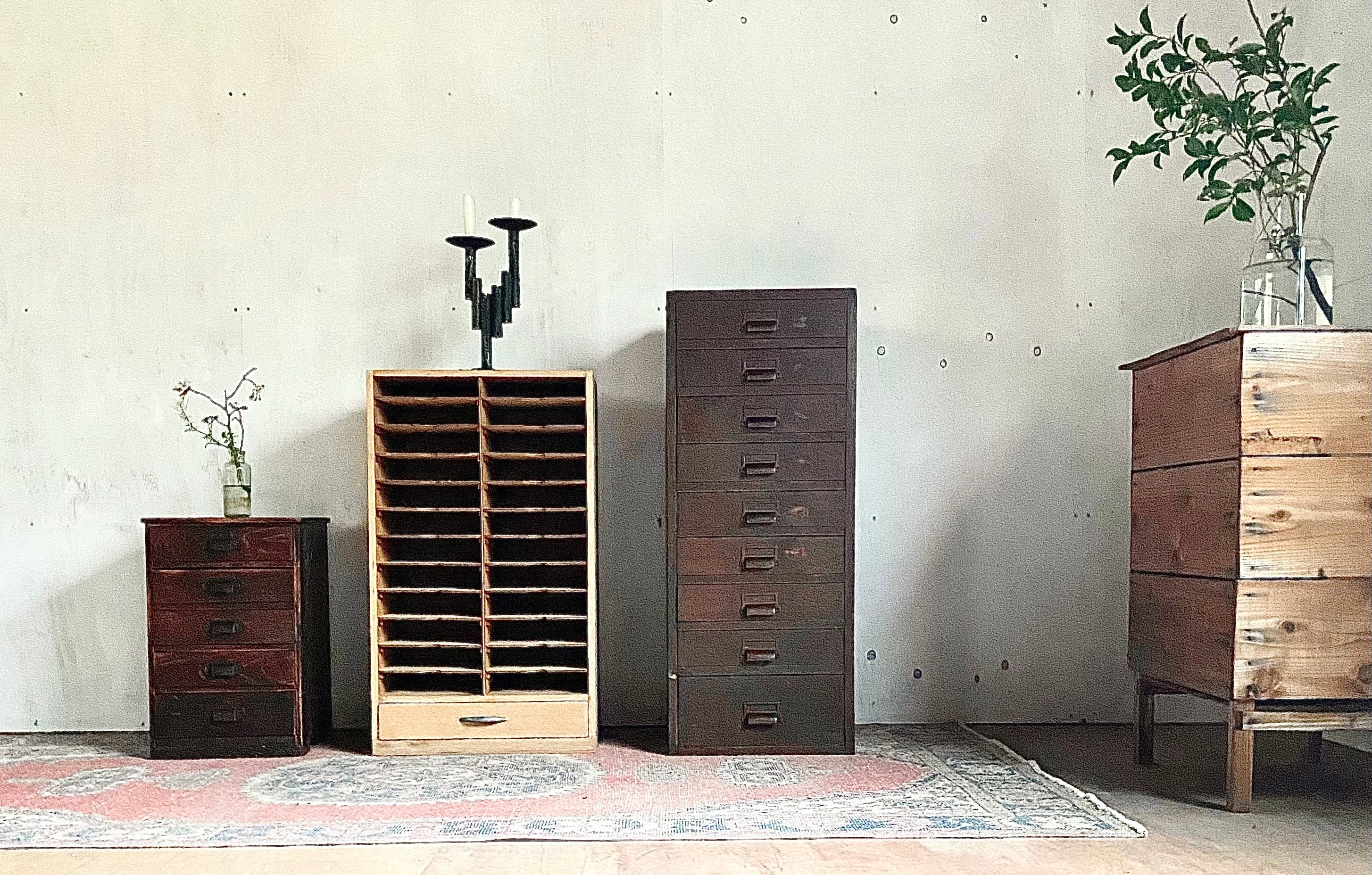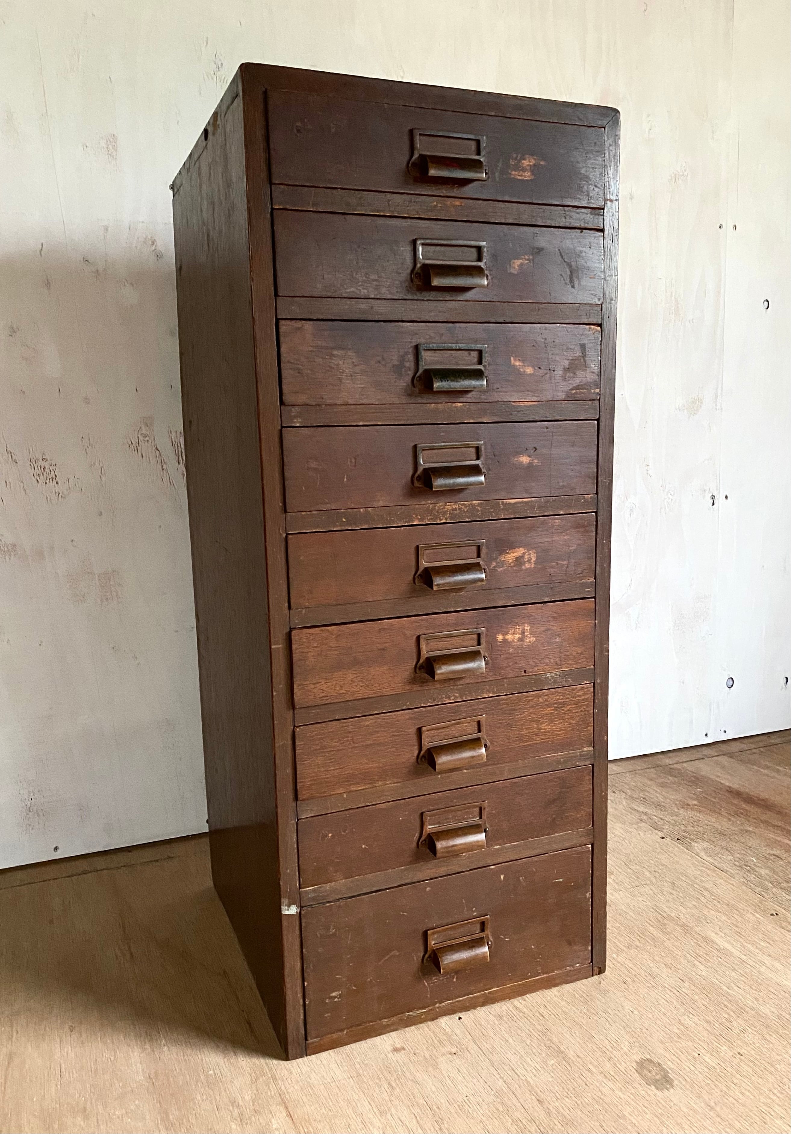 経年変化の落ち着きある佇まい、9杯の引出しが綺麗に整列した収納棚。味のある取手でネームプレートも付いていて仕分けにも便利です。リビングやアトリエで小物やパーツ、紙物の収納としてや、キッチンでお皿やコップの収納としても素敵です。