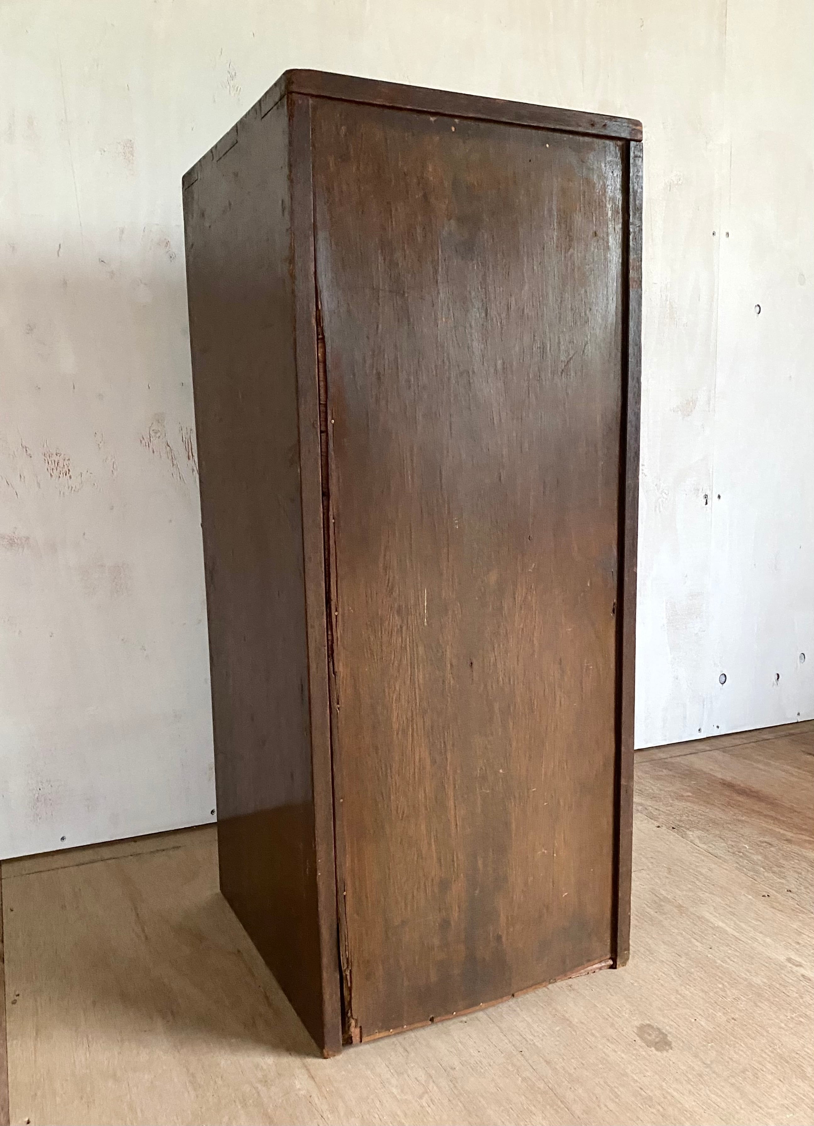 古い収納棚になります。スレや欠け、当たりキズ、禿げ、割れ、サビ、隙間、落としきれない汚れなどがあります。引出しの開閉はスムーズに行えます。全体的に状態も良いのでまだまだ実用的に活躍してくれます。