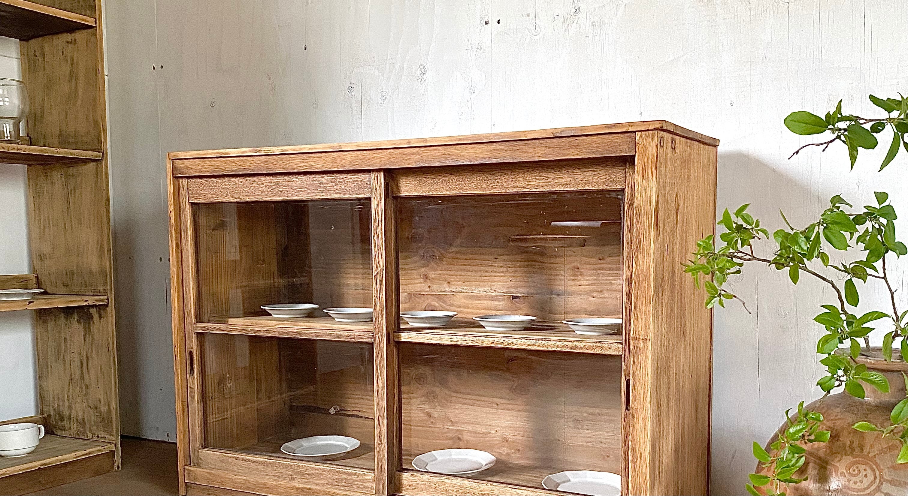 古木の雰囲気ある風合いとガラス引戸、すっきりとした姿が感じ良いシェルフ。キッチンで食器棚としてやリビングやアトリエで小物や本を飾りながら収納したり、テレビボードなどとしても素敵です。