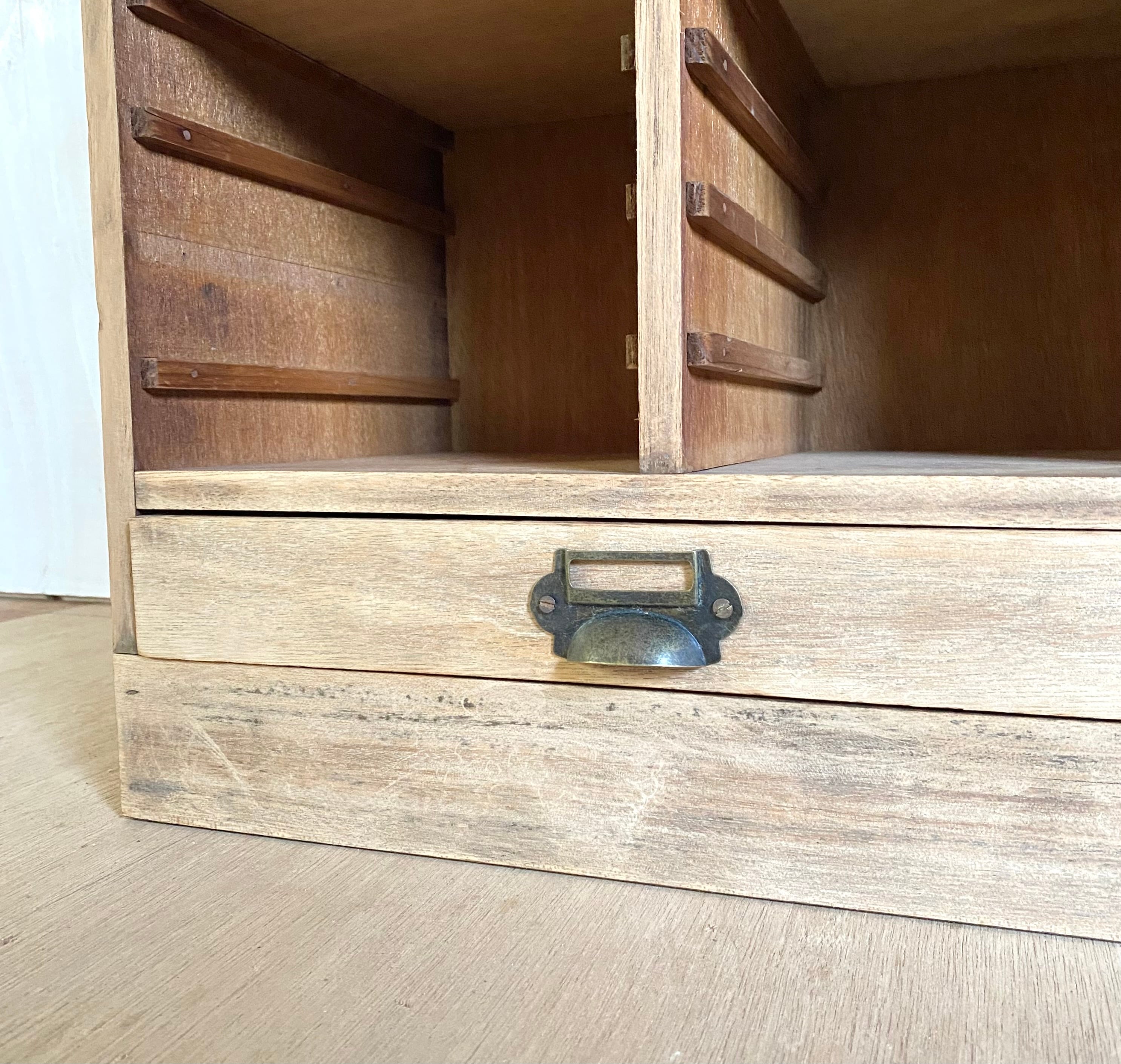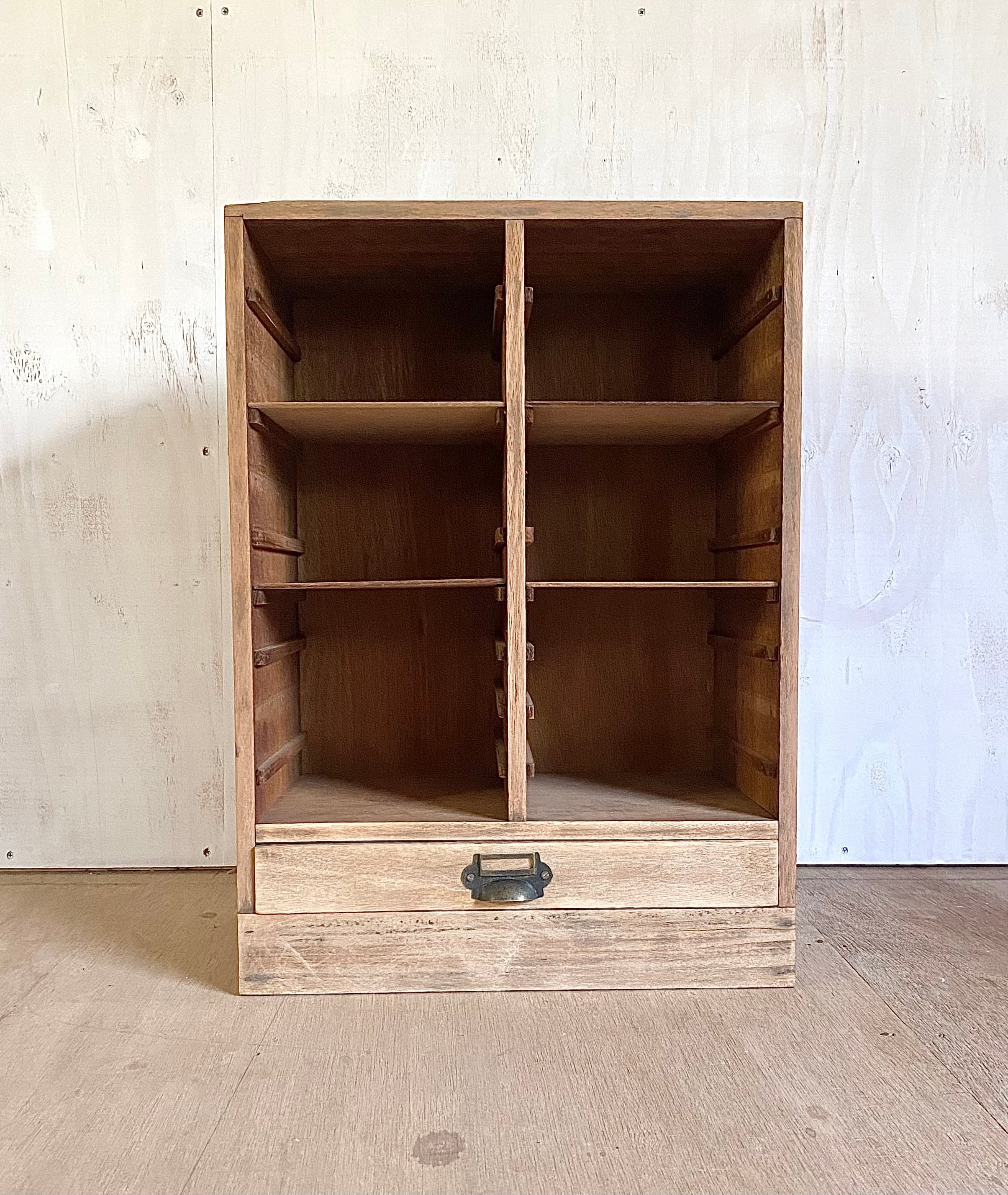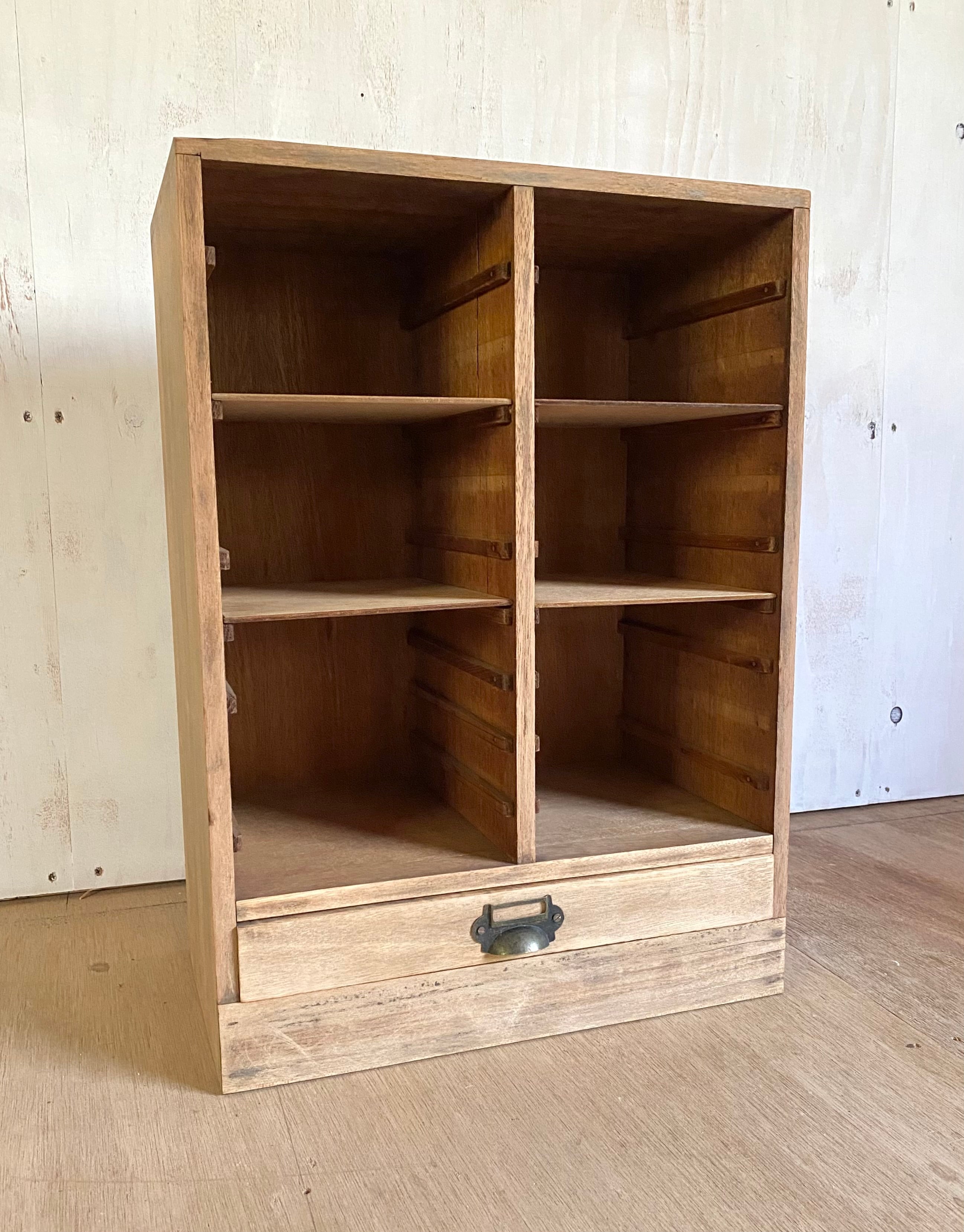 古い仕切り棚になります。スレや欠け、当たりキズ、禿げ、割れ、サビ、隙間、落としきれない汚れなどがあります。引出しの開閉はスムーズに行えます。全体的に状態も良いのでまだまだ実用的に活躍してくれます。