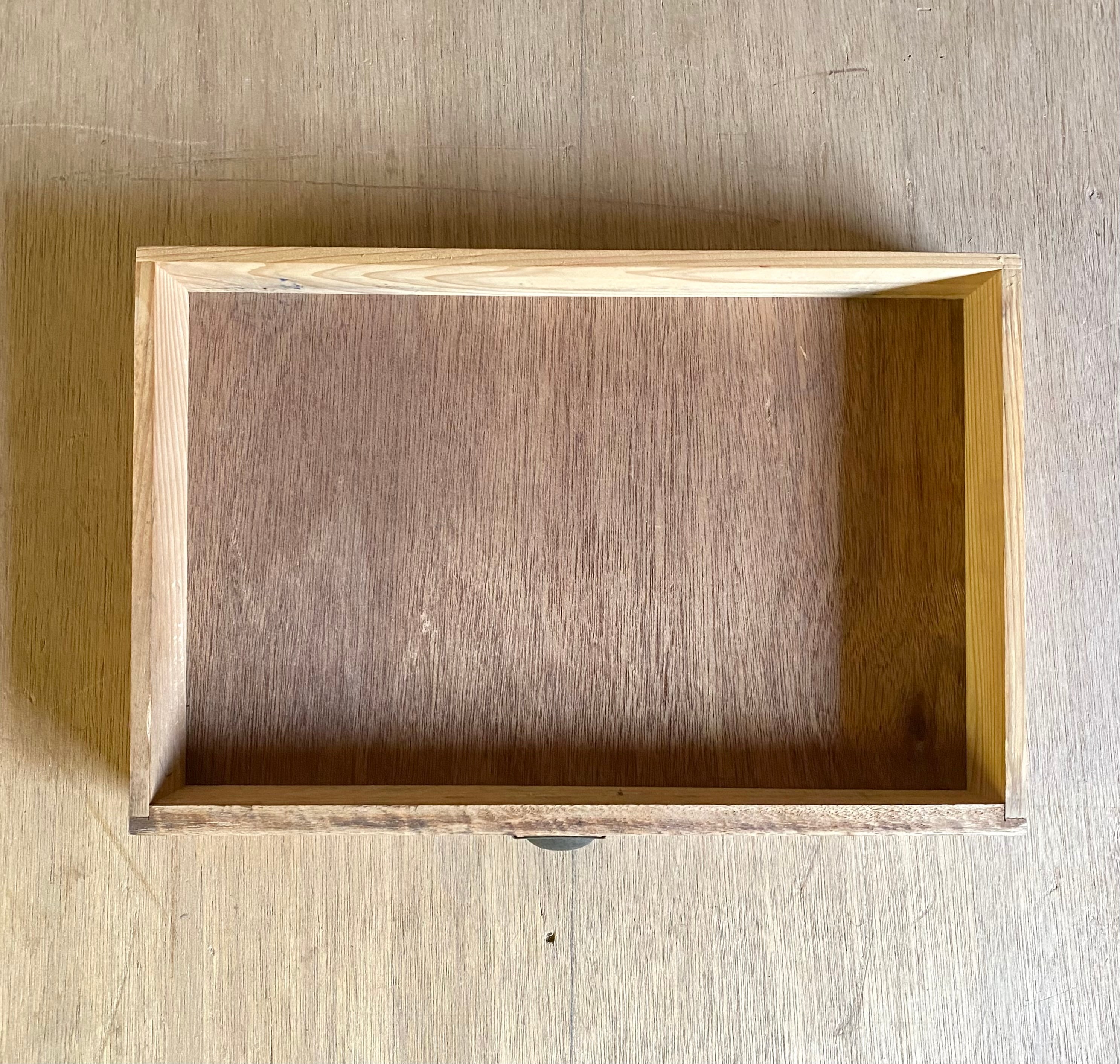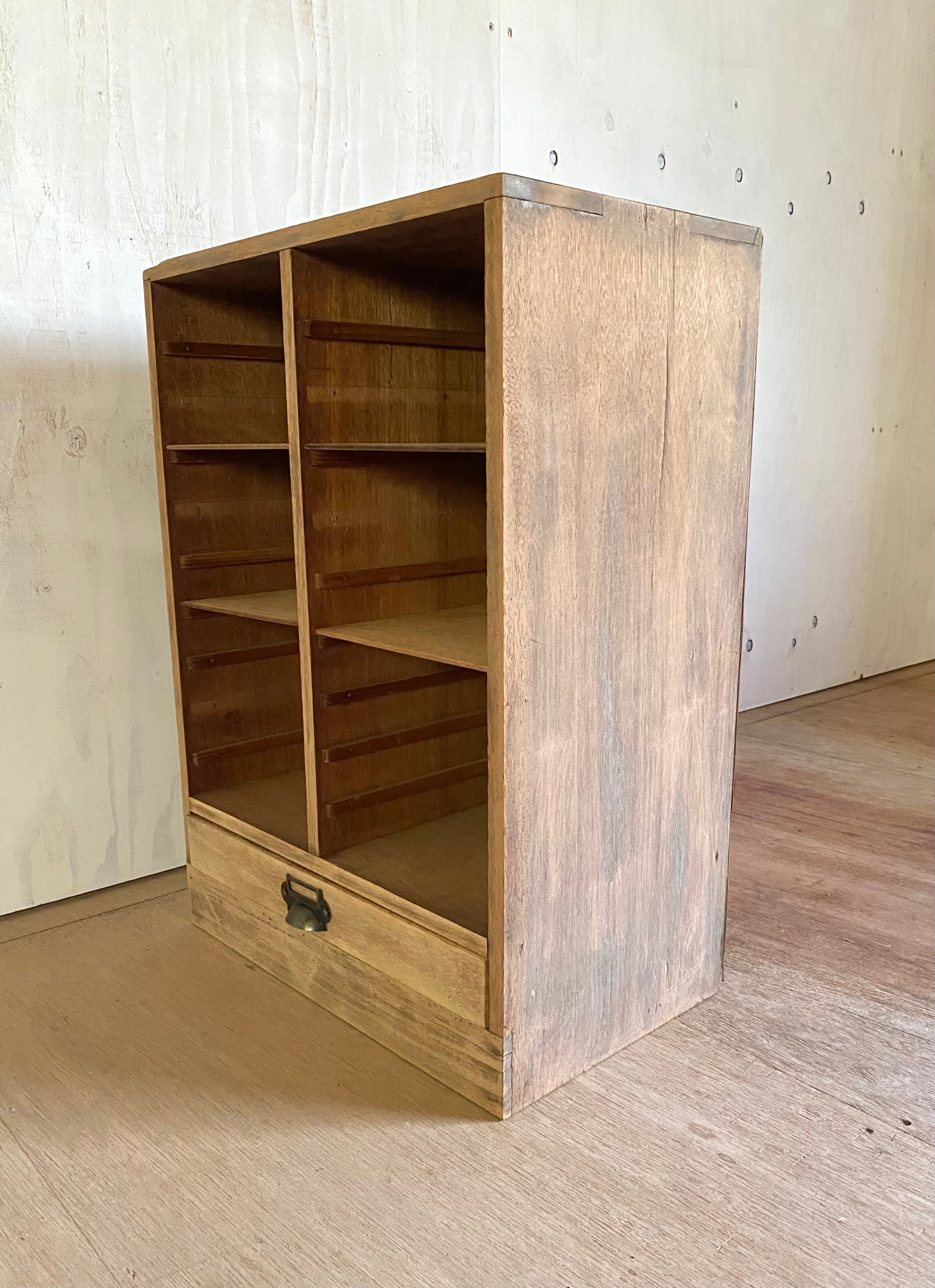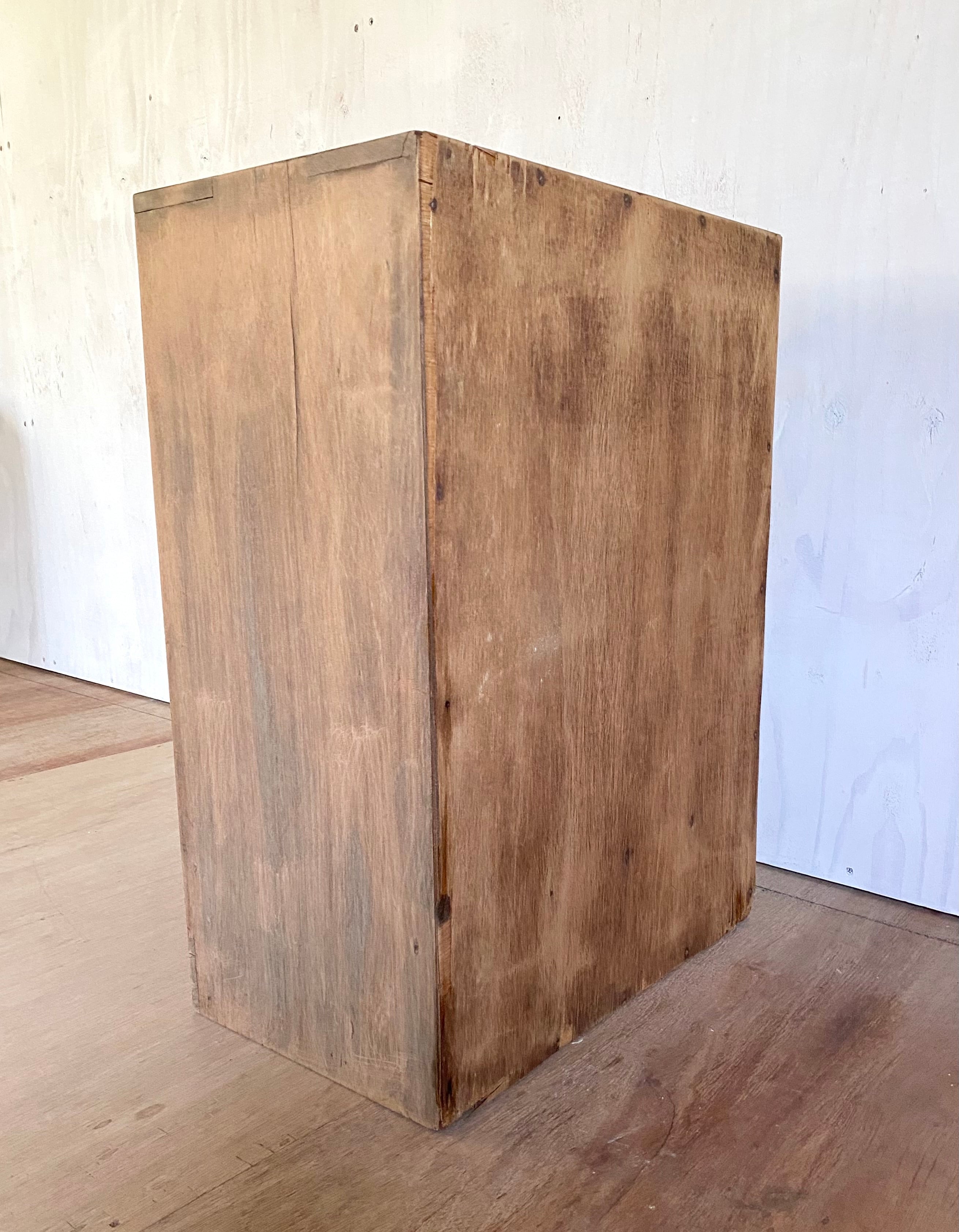 古い仕切り棚になります。スレや欠け、当たりキズ、禿げ、割れ、サビ、隙間、落としきれない汚れなどがあります。引出しの開閉はスムーズに行えます。全体的に状態も良いのでまだまだ実用的に活躍してくれます。