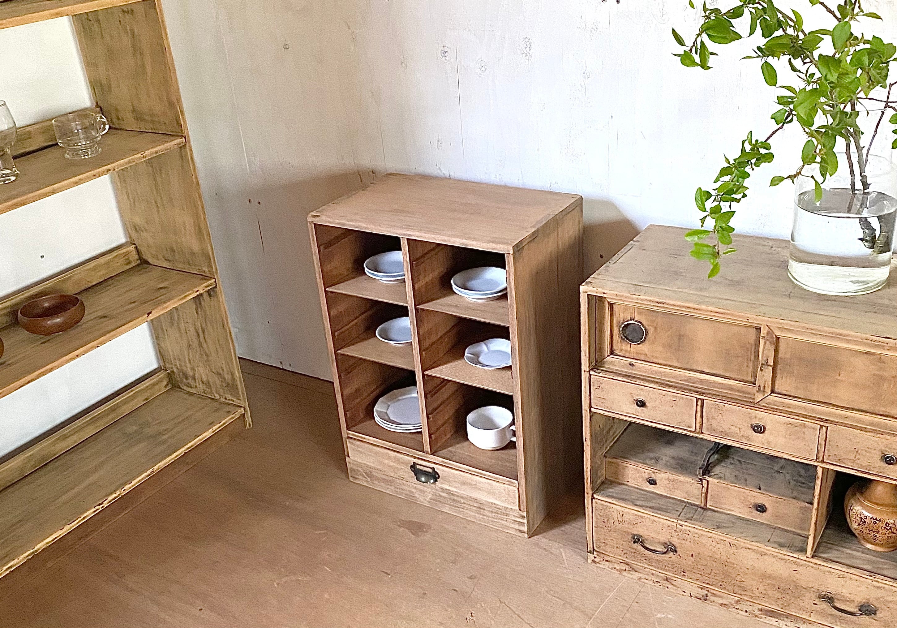 雰囲気ある古木の風合いと味のある取手が感じ良い仕切り棚。仕切り板は取り外し出来て段差を変えられるので使い勝手も良いです。リビングや趣味部屋で本や小物の収納としてや、キッチンで食器や調味料のストック棚としても素敵です。