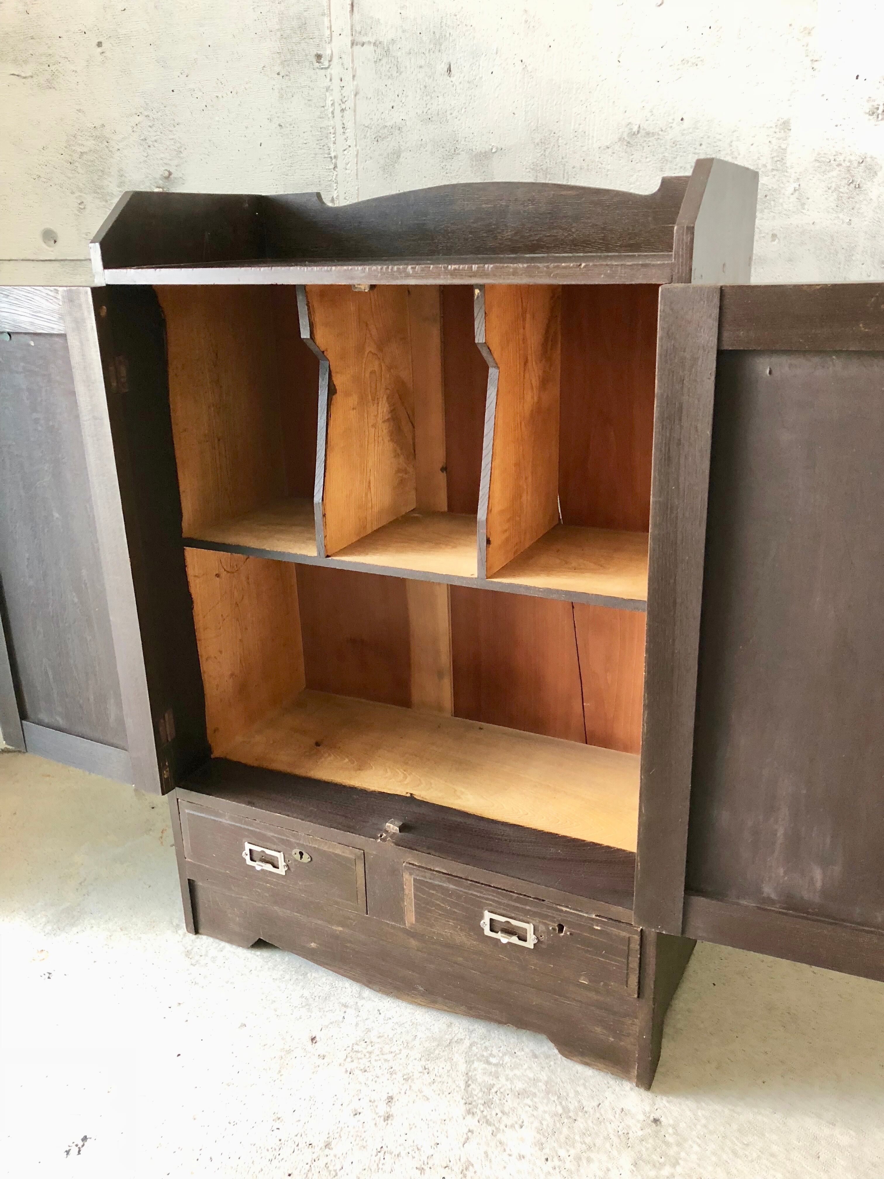 シンプルながら経年変化による深みは空間に落ち着きを与えてくれるキャビネット。扉戸収納と2杯の引き出しがあり、収納力も十分です。経年による傷などもありますが、扉戸、引出しの開閉も比較的スムーズに行え、使用上問題なくお使いいただけます。食器棚や小物、本などの収納棚として、毎日の暮らしの中で手元に置いてお役立てください。