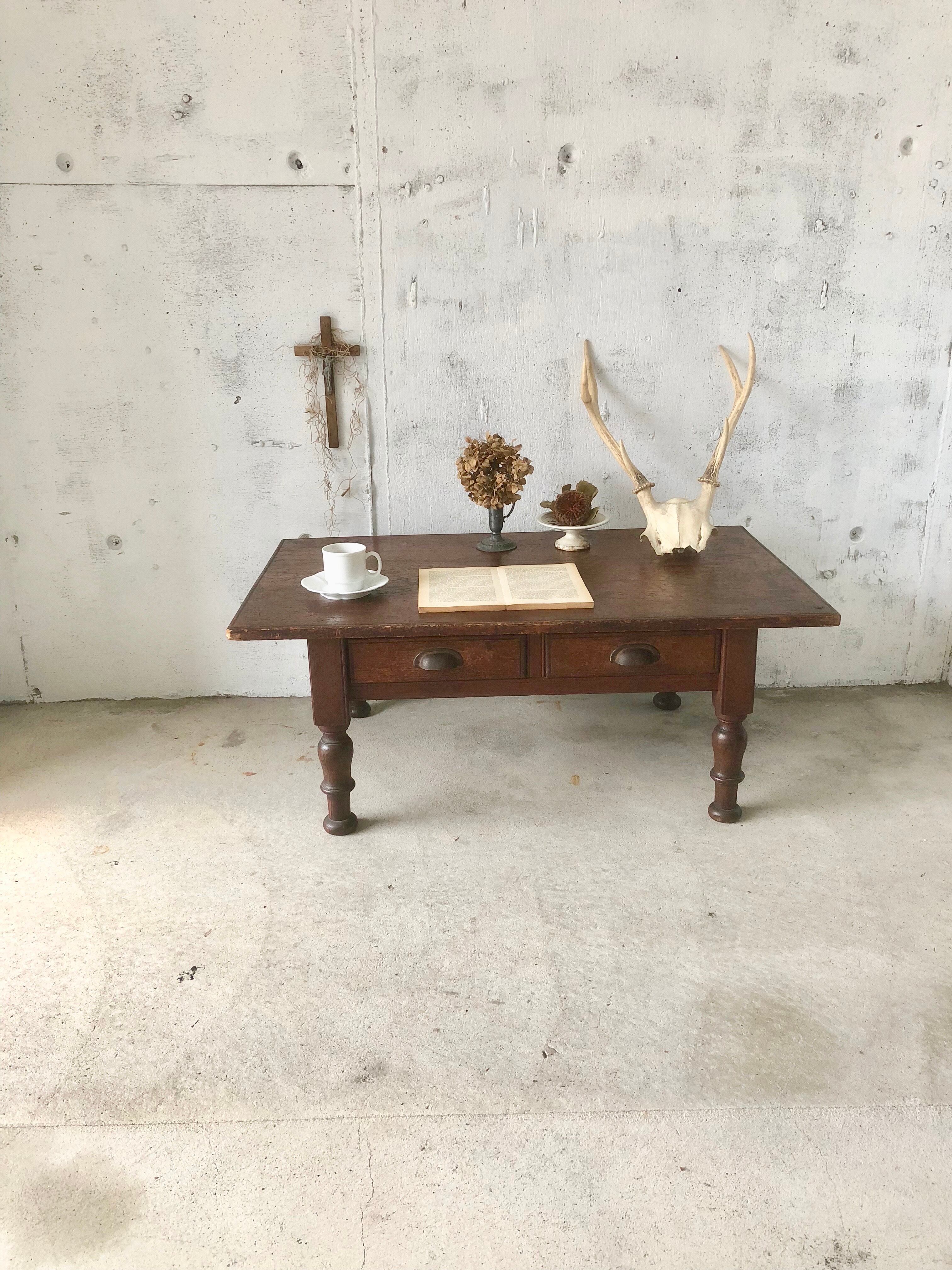 経年変化の雰囲気ある木肌、取手とろくろ脚が感じ良いローテーブル。特に目立つがたつきはなく、状態は良好です。お気に入りの小物や植物などをお部屋で飾ってみたり、実用使いで作業テーブルとしてや、お子さんの勉強机としても素敵です。