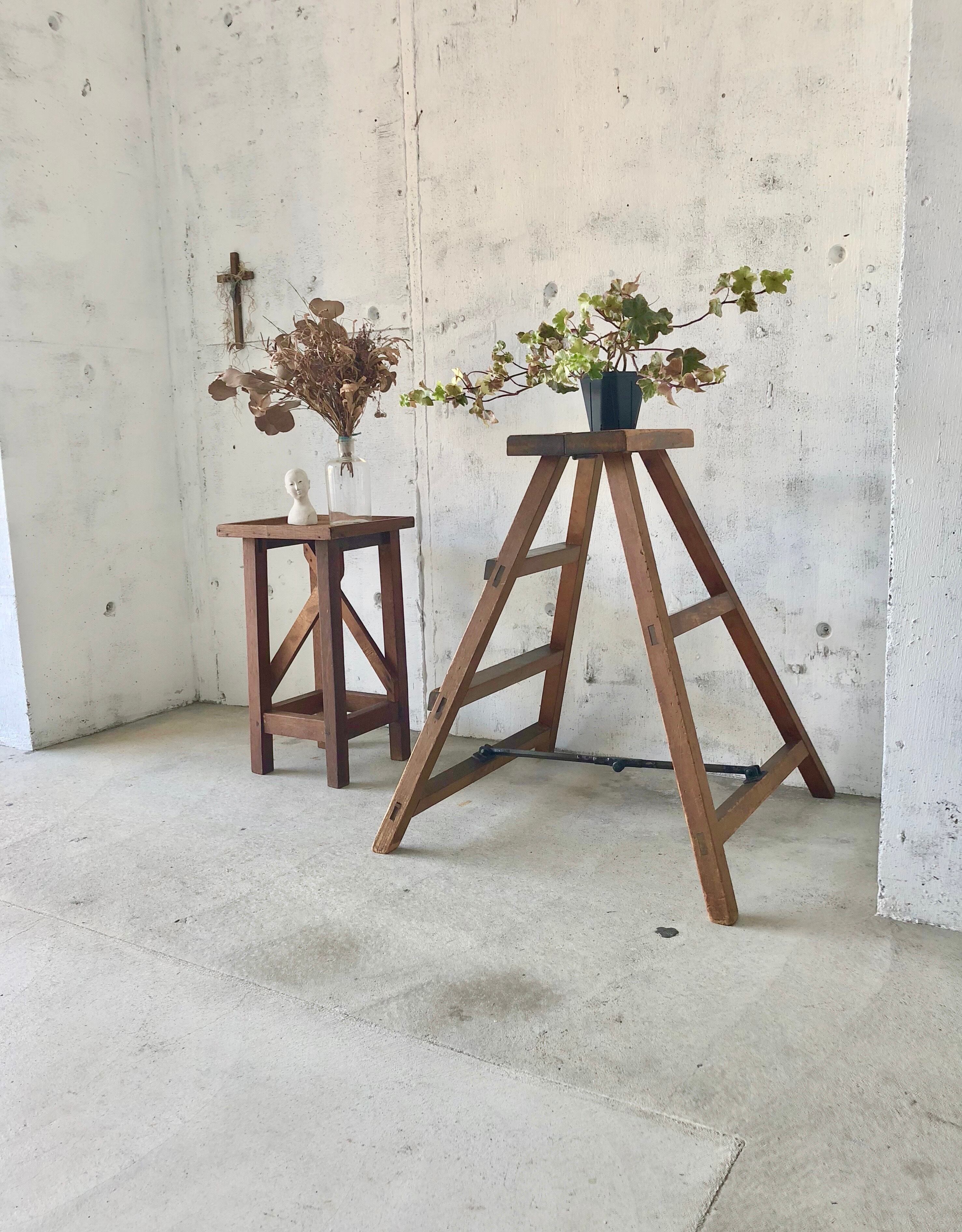 経年変化の味のあるナチュラルな木肌が雰囲気の良い木製ラダー。少しのがたつきはありますが、しっかりとしていて状態は良く、折りたたみが出来るので使い勝手も良いです。お部屋や庭先、玄関先などでお気に入りの植物や小物を飾ってみても素敵な空間演出が叶いそうです。