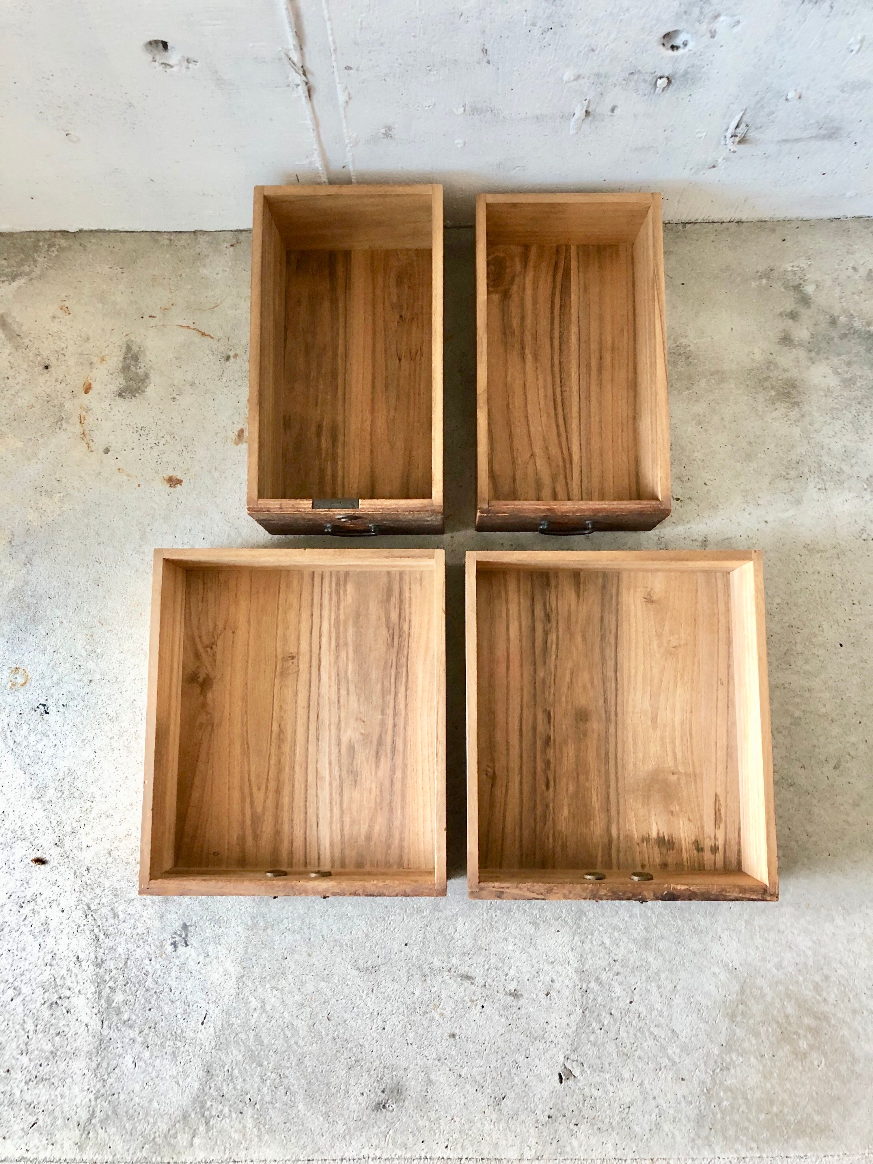 経年変化の使い込まれた木の風合いと味のある取手が魅力的な収納棚。収納力もたっぷりで使い勝手も良いです。キッチンで小皿などの食器のストック棚としてや、リビングで本や小物などの整理に使ってみても素敵です。お部屋に合った使い方でいろいろとお楽しみください。