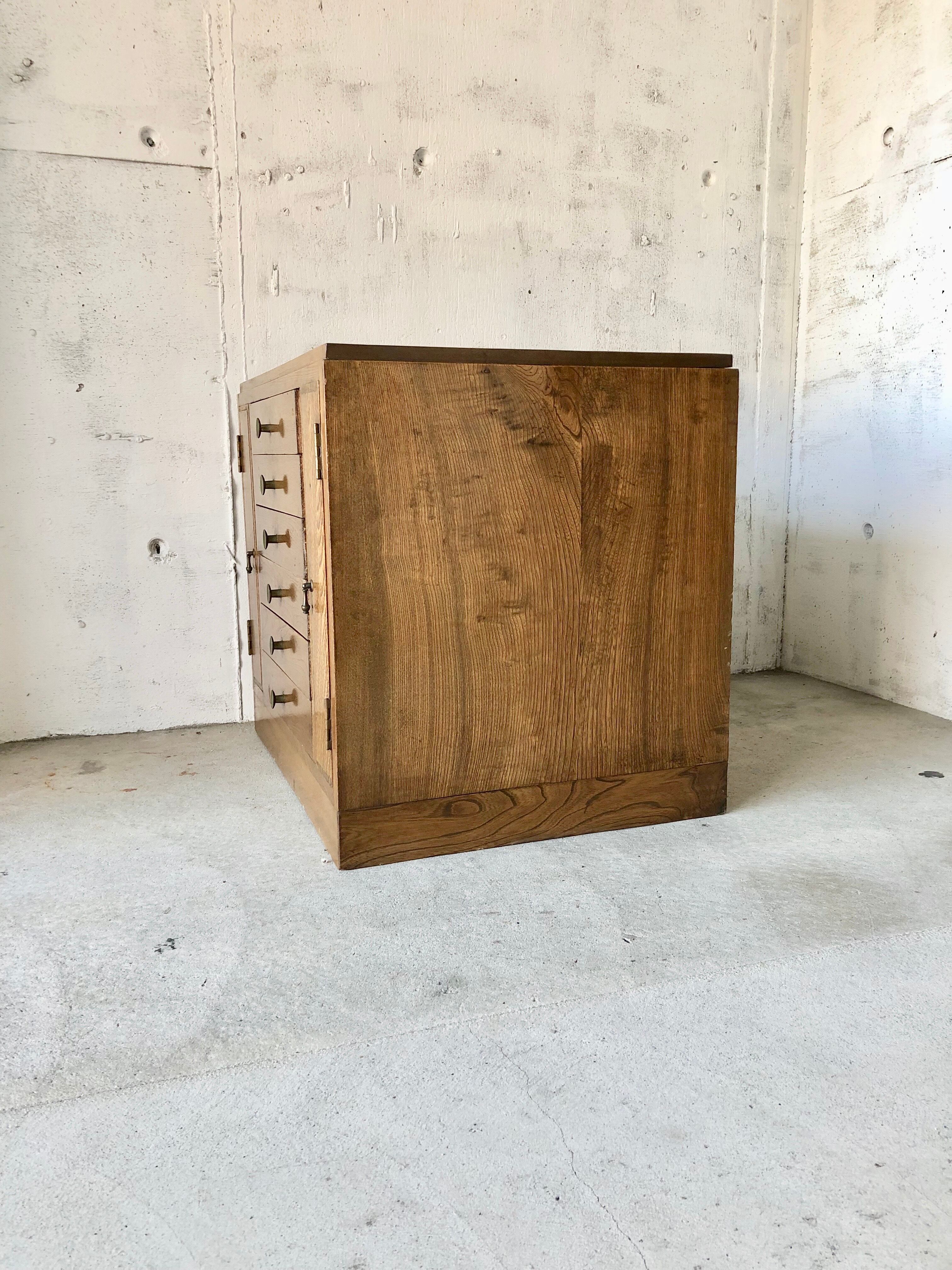 古い収納棚になりますので、スレや剥げ、当たりキズ、割れ、欠け、落としきれない汚れなどがあります。引出し中は比較的に綺麗で開閉も比較的スムーズに行え、日常気軽にお使いいただけます。全体的に状態も良いのでまだまだ実用的に活躍してくれます。