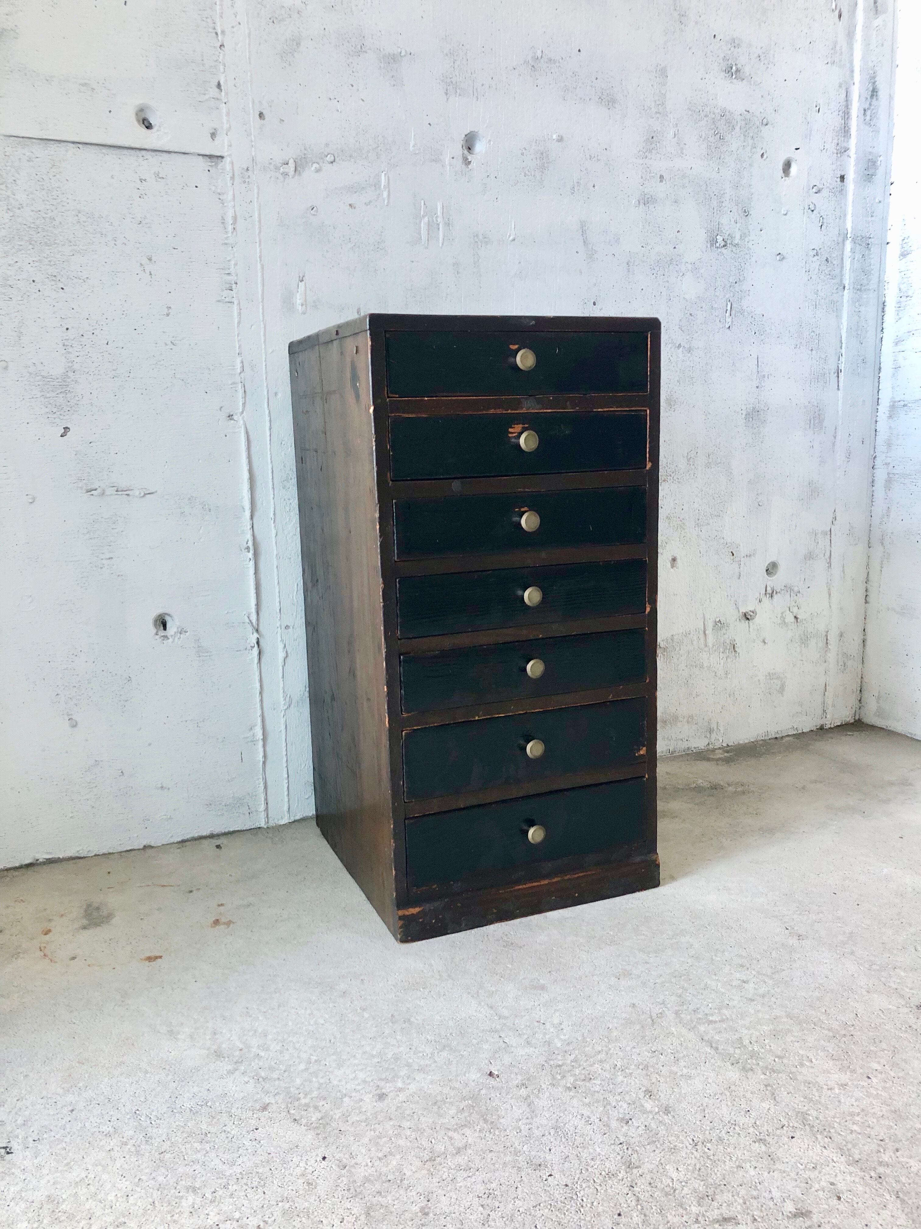 経年変化の落ち着いた濃い木味と真鍮取手が感じ良い収納棚。引出しの開閉は比較的スムーズに行えます。引出しは7杯あるので、収納力もたっぷりです。作業スペース、リビングなどで紙ものや細々したものの整理にも役立ちそうです。