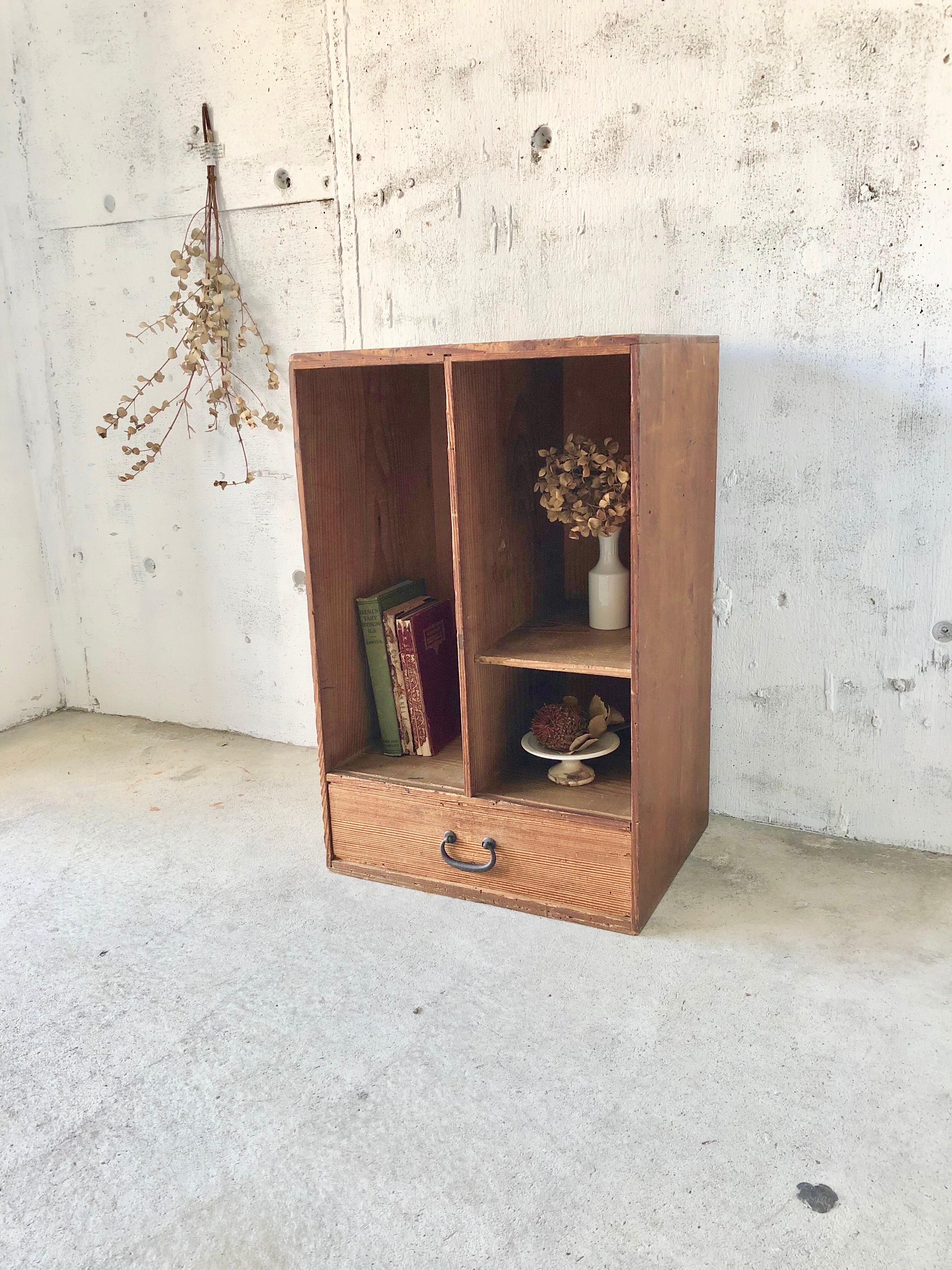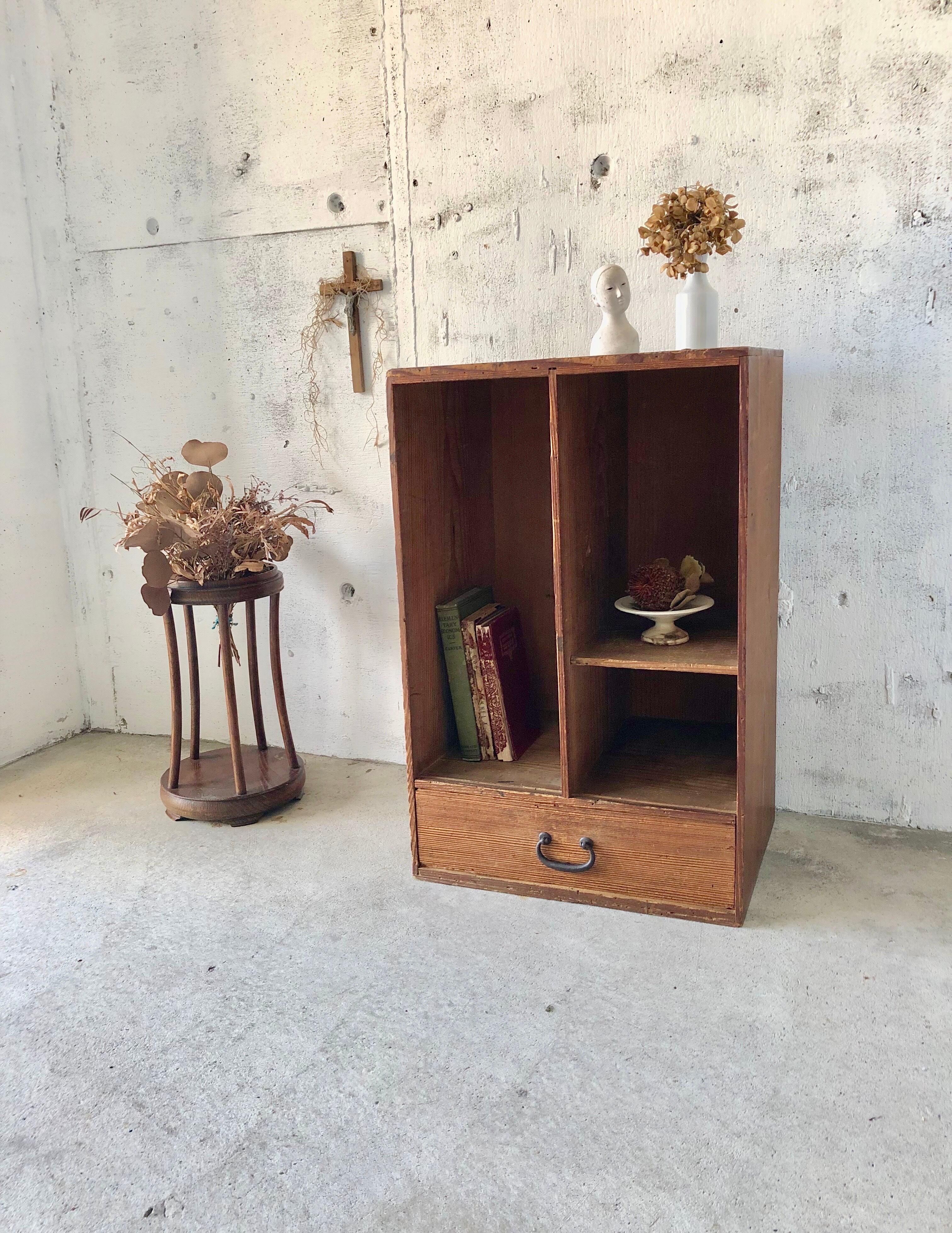 古い収納棚になりますので、スレや剥げ、当たりキズ、割れ、反り、欠け、落としきれない汚れなどがあります。引出し中は少し汚れがありますが、開閉はスムーズに行え、日常気軽にお使いいただけます。全体的に状態も良いのでまだまだ実用的に活躍してくれます。