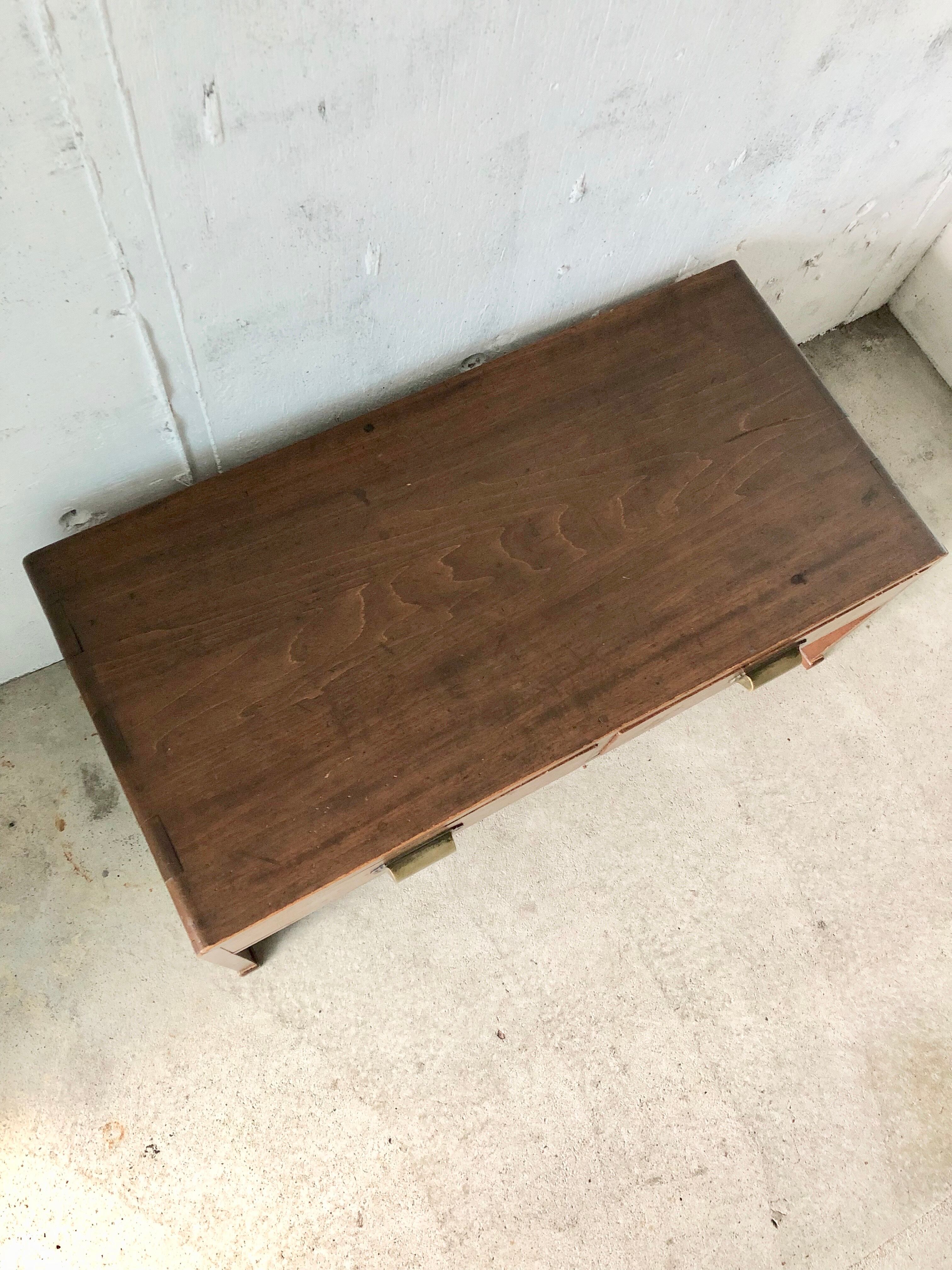経年変化の良い木肌、雰囲気のある真鍮取手が感じ良いローテーブル。少しのがたつきはありますが、状態は良好です。お気に入りの小物や植物などをお部屋で飾ってみたり、実用使いで作業テーブルとしてや、お子さんの勉強机としても素敵です。