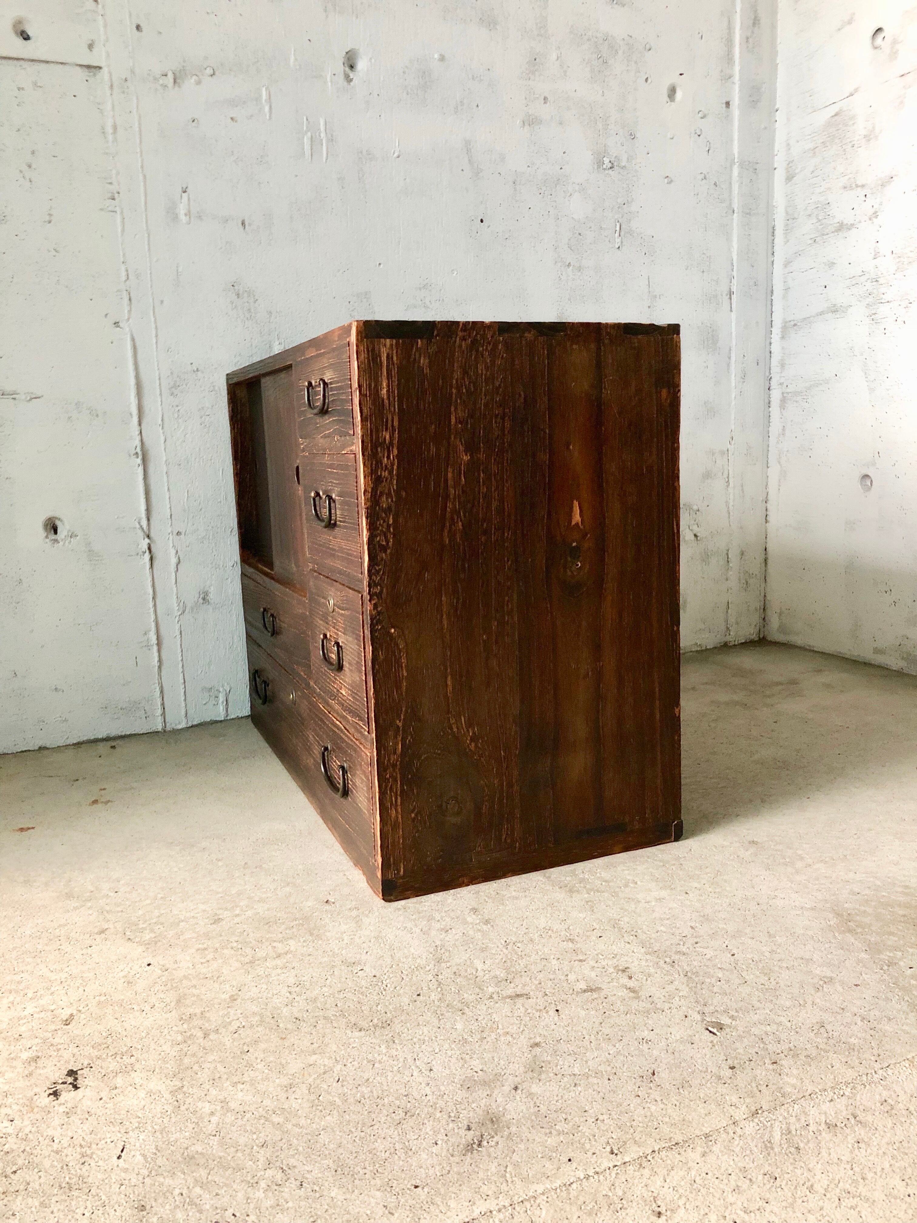 古い収納棚になりますので、スレや剥げ、当たりキズ、割れ、欠け、落としきれない汚れなどがあります。引出し中は比較的に綺麗で開閉もスムーズに行えます。全体的にしっかりとしていて状態も良いのでまだまだ実用的に活躍してくれます。