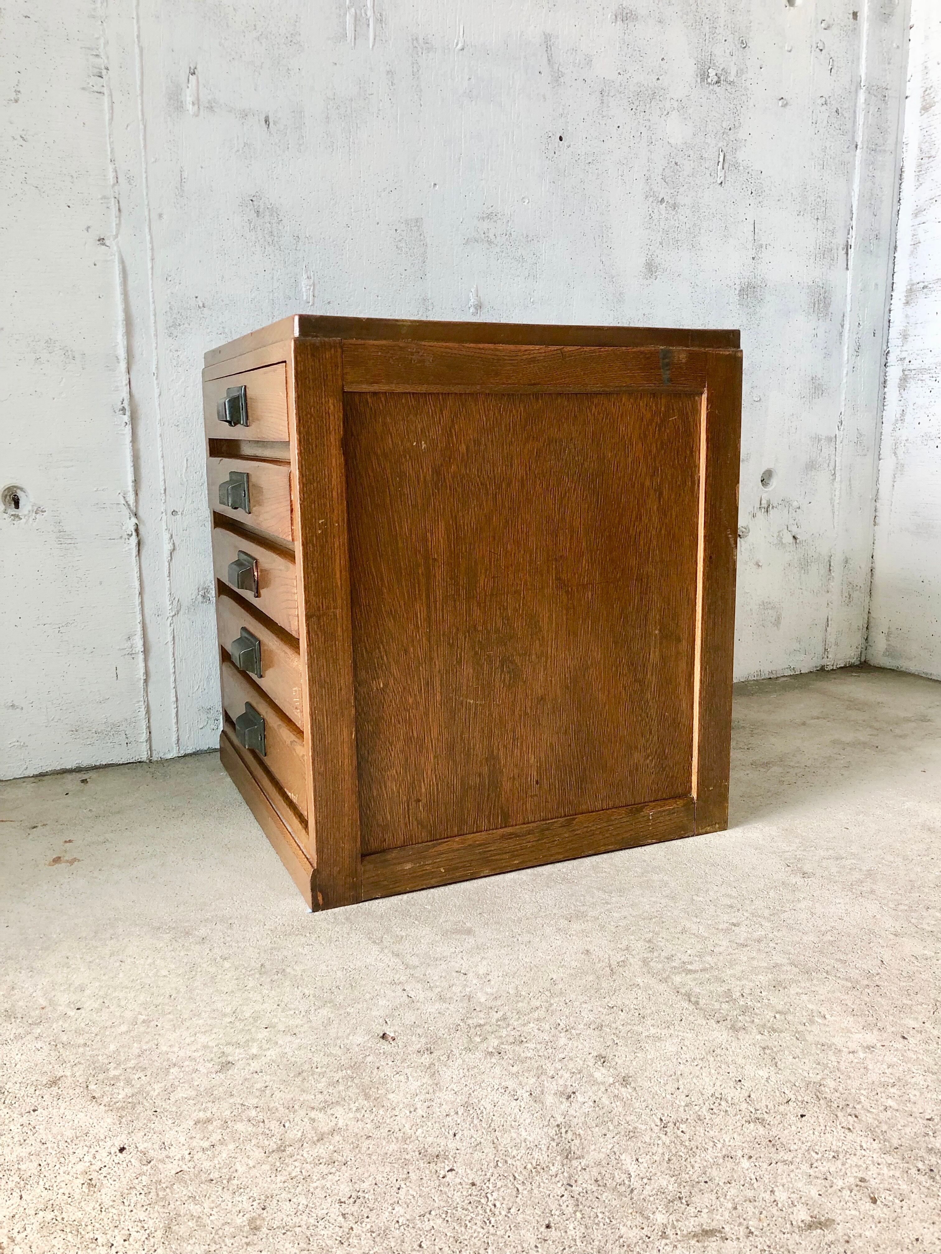古い小引出しになります。スレや当たりキズ、禿げ、欠け、浮き、サビ、割れ、落としきれない汚れなどがあります。引出し中は綺麗で開閉もスムーズに行え、日常気軽にお使いいただけます。引出し中はA4サイズが入る大きさです。全体的に状態も良いのでまだまだ実用的にお使いいただけます。