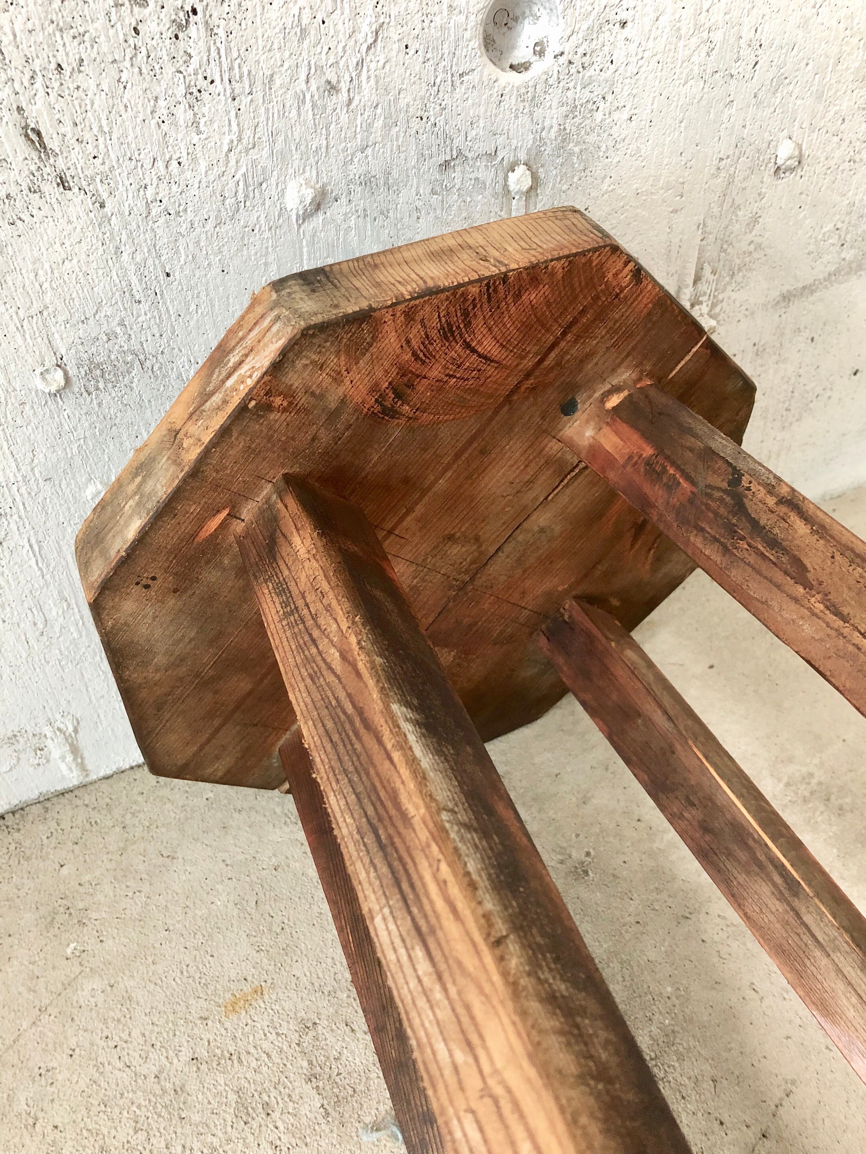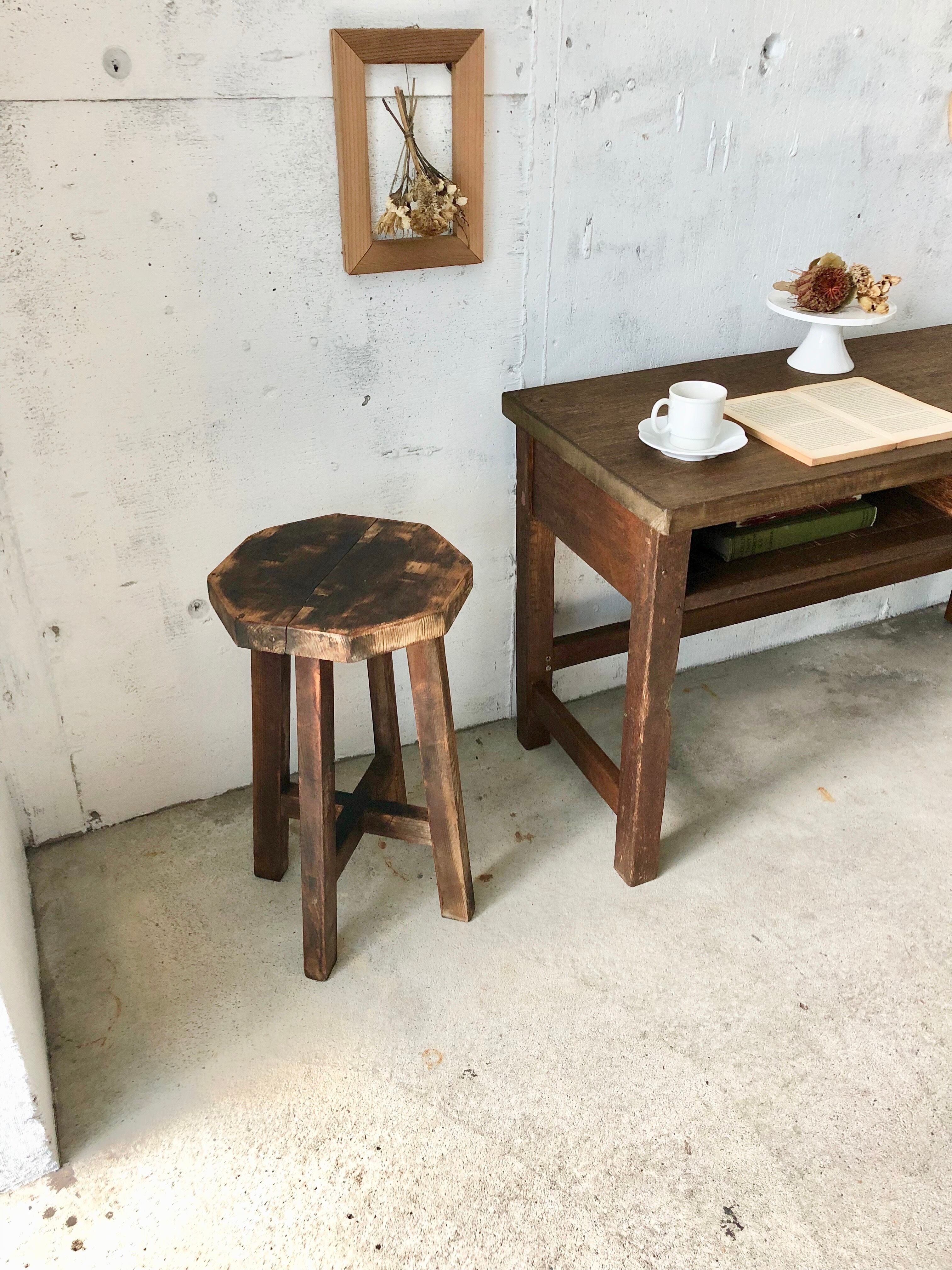 木の温かみを感じさせてくれる木製のスツール。8角形の座面が個性的で感じ良いです。少しがたつきはありますが、状態は良いです。実用使いでアトリエや食卓用の椅子、お子さん用の椅子、キッチンや玄関先で腰掛け椅子、ディスプレイ台として植物を飾ってみても素敵です。