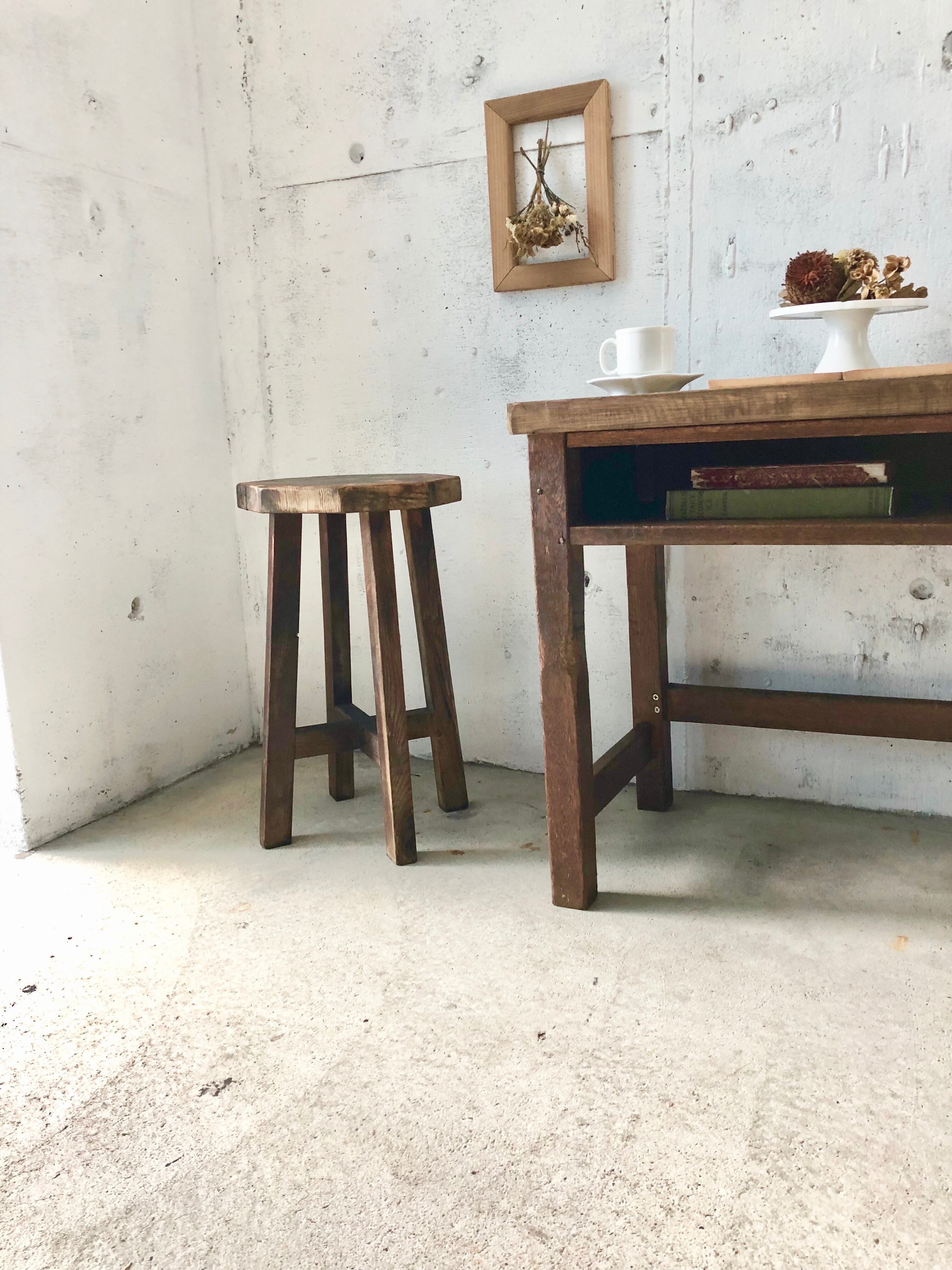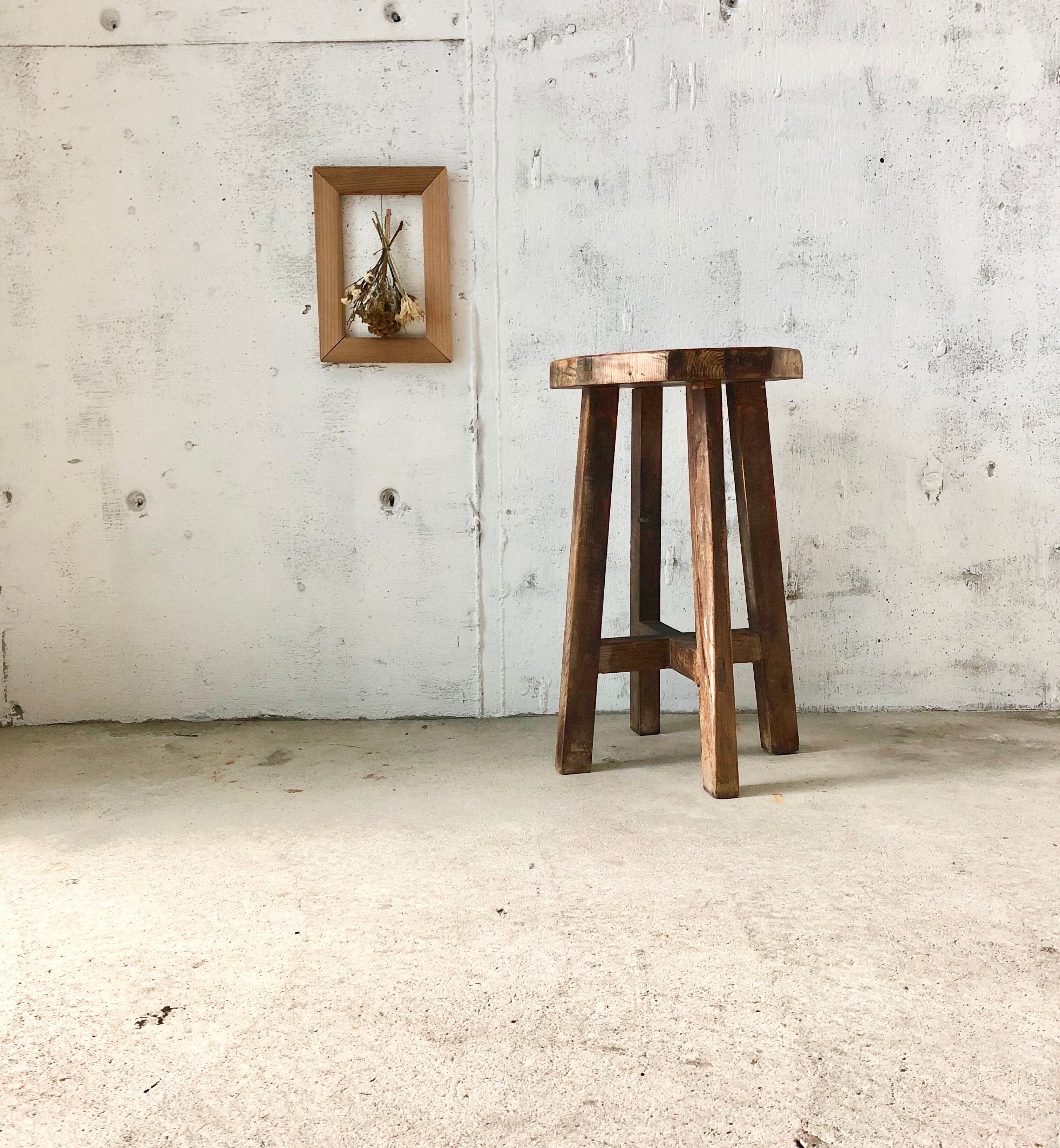 古いスツールになります。スレや剥げ、割れ、欠け、反り、削げ、当たりキズ、落としきれない汚れなどがあります。少しのがたつきはありますが、全体的に状態も良いのでまだまだ実用的に活躍してくれます。