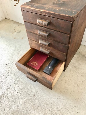 経年変化の使い込まれた雰囲気の良い木肌、木の取手が感じ良い小引き出し。引出し中は少し汚れがありますが、開閉は比較的スムーズに行え日常気軽にお使いいただけます。リビングや作業場などのテーブル脇に置いて、書類や紙物、ステーショナリーの整理にも役立ちそうです。