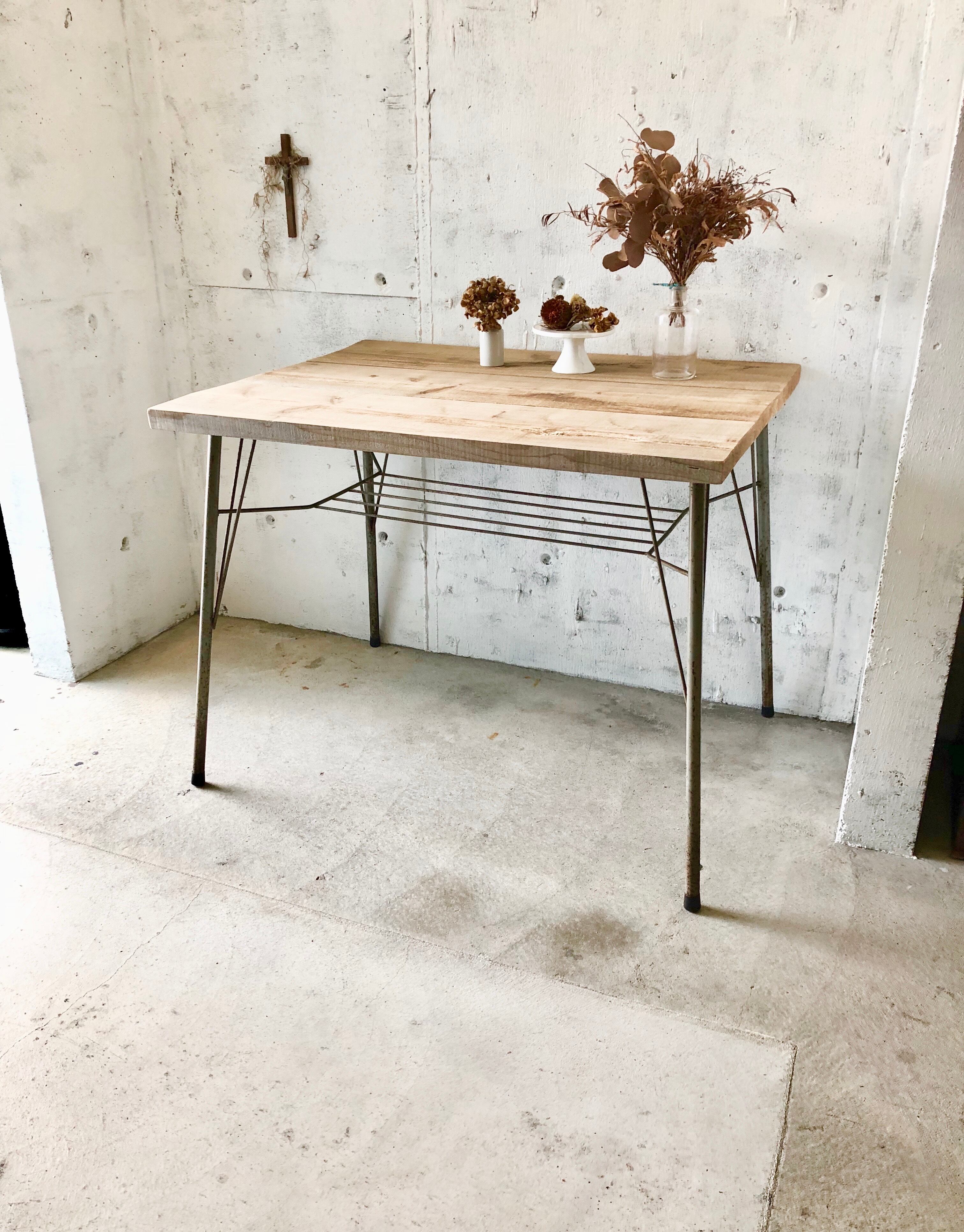 雰囲気の良い古材板と古い鉄脚が良く馴染んだ鉄脚テーブル。天板下のオープンラックも雑誌などが置けるので便利です。2人掛けの向かい合わせテーブルや食卓以外の時間でも、日常の作業をするのに程よいサイズ感がオススメです。味のあるテーブルひとつプラスするだけで雰囲気あるお部屋作りが叶いそうです。