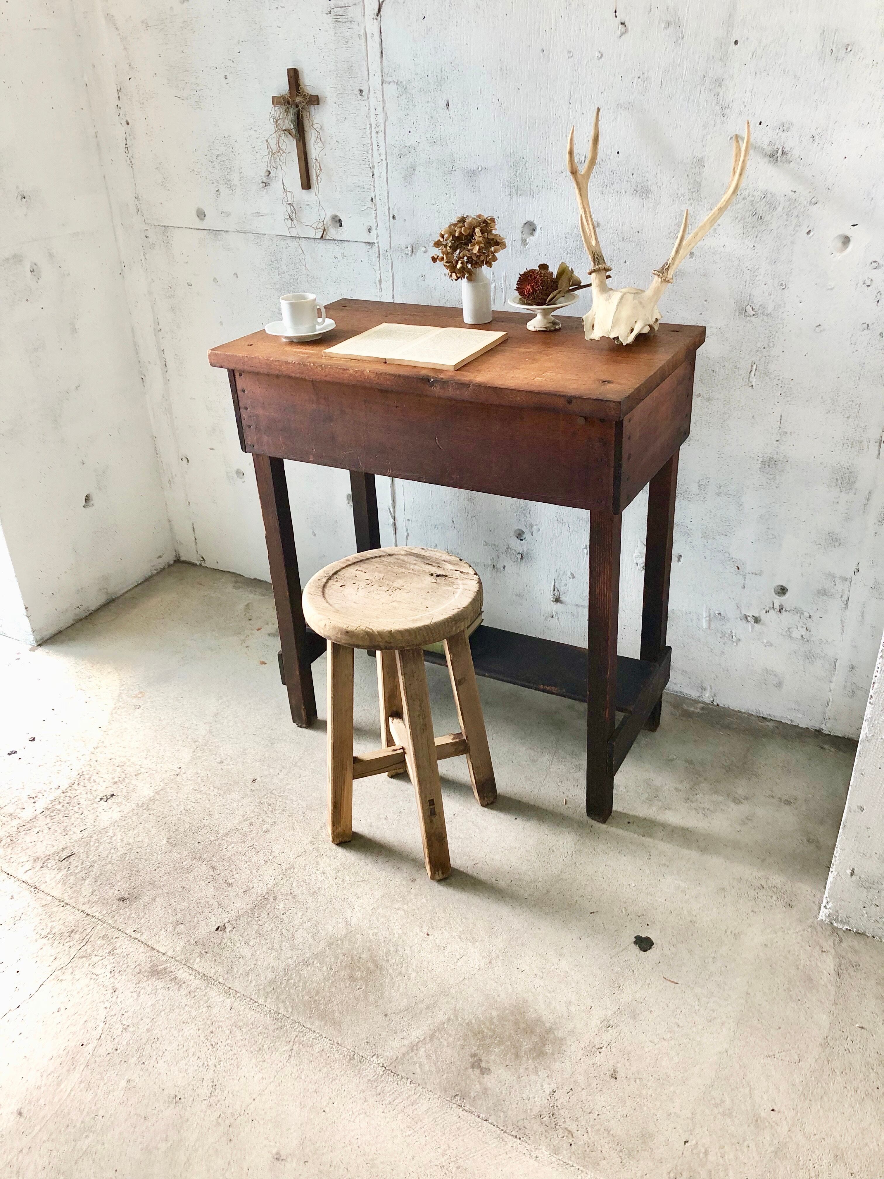 経年変化の使い込まれた良い木肌が感じ良い木製デスク。少しのがたつきはありますが、しっかりとしています。パソコン作業、物作りなどをする作業テーブルとしてや、お子さんの勉強机としても素敵にお使いいただけそうです。